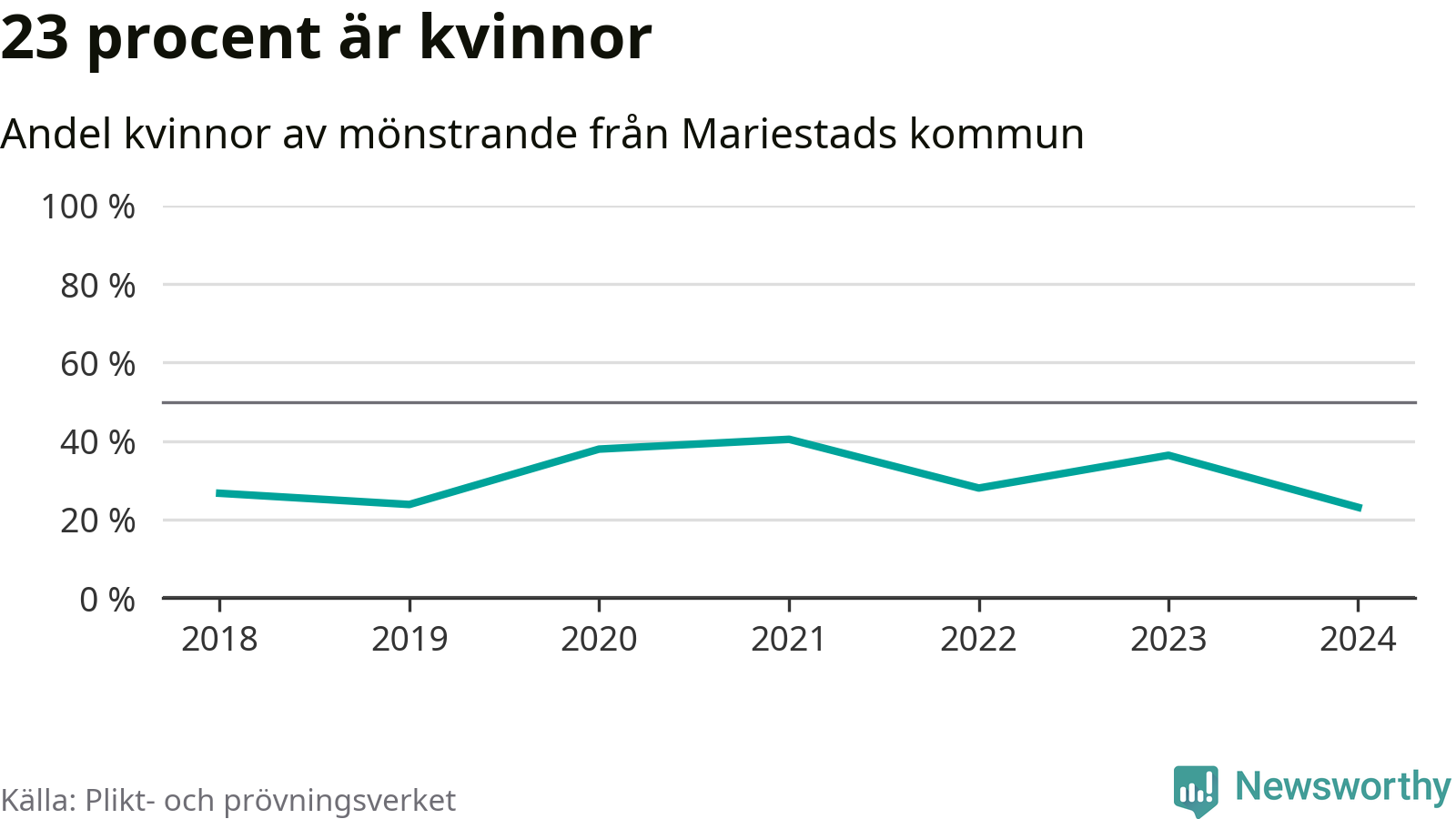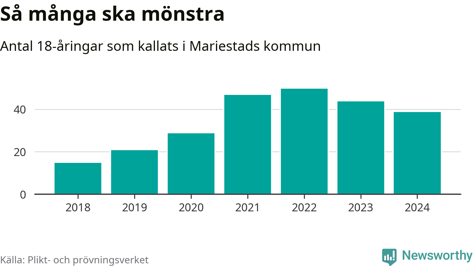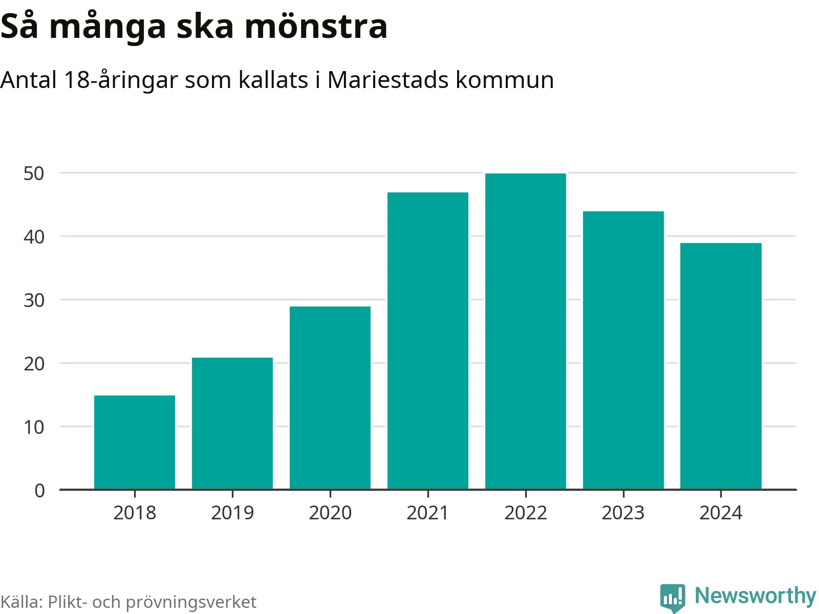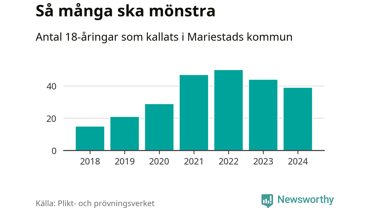 Nu kallas 27 900 svenskar födda 2006 till mönstring. Och 39 av dem kommer från Mariestad, enligt ny statistik från Plikt- och prövningsverket. Det innebär att var sjunde invånare i åldersgruppen i kommunen kallas till mönstring. Det är en lägre andel än i Västra Götaland totalt. I riket som helhet kallas nästan var fjärde person i årskullen.