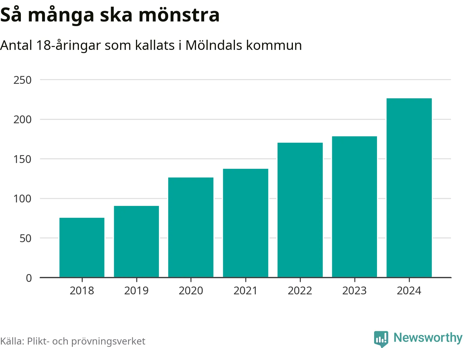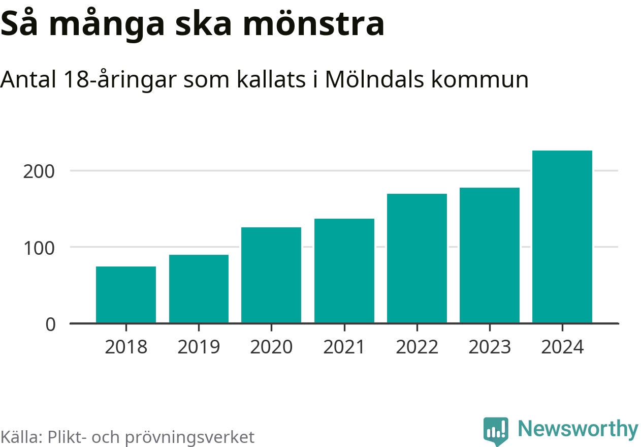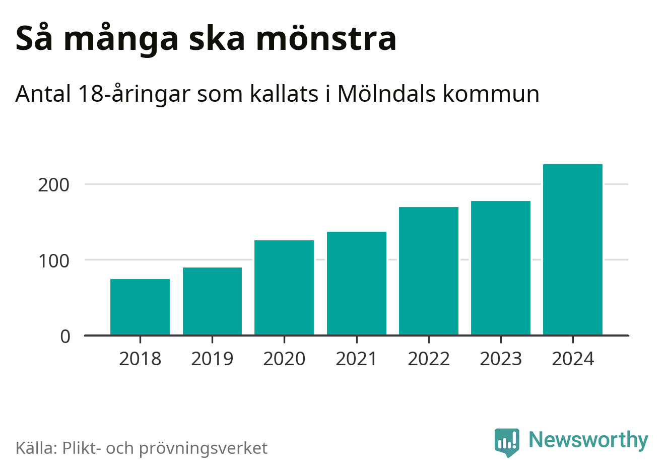 Nu kallas 27 900 svenskar födda 2006 till mönstring. Och 227 av dem kommer från Mölndal, enligt ny statistik från Plikt- och prövningsverket. Det innebär att mer än var fjärde invånare i åldersgruppen i kommunen kallas till mönstring. Det är en högre andel än i Västra Götaland totalt. I riket som helhet kallas nästan var fjärde person i årskullen.