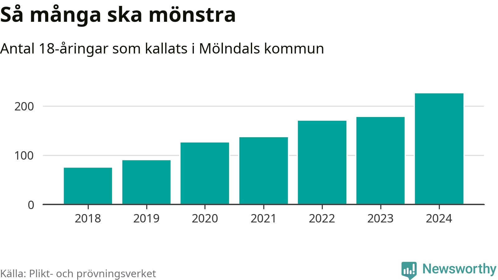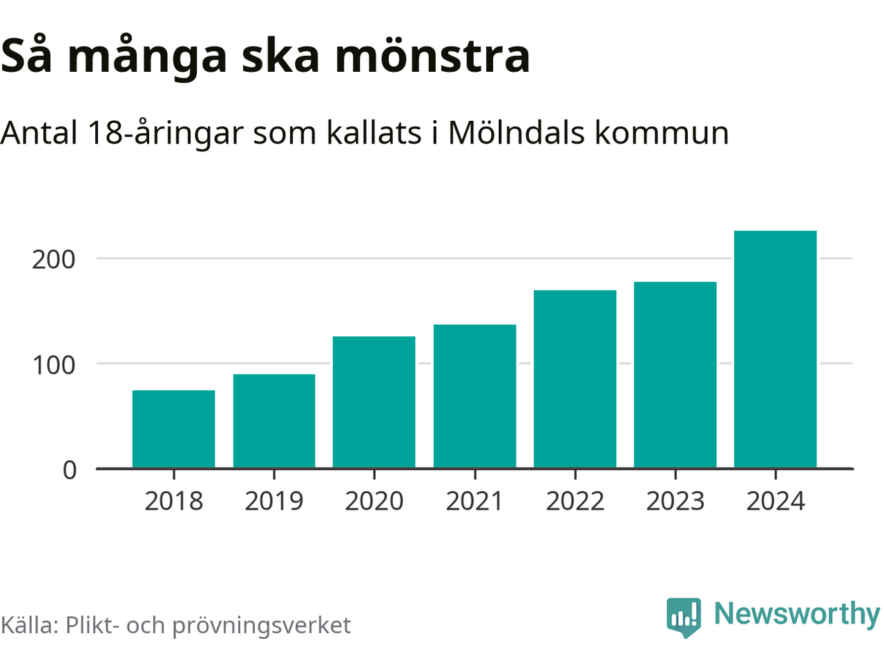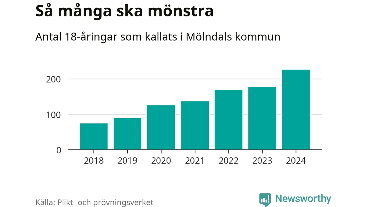 Nu kallas 27 900 svenskar födda 2006 till mönstring. Och 227 av dem kommer från Mölndal, enligt ny statistik från Plikt- och prövningsverket. Det innebär att mer än var fjärde invånare i åldersgruppen i kommunen kallas till mönstring. Det är en högre andel än i Västra Götaland totalt. I riket som helhet kallas nästan var fjärde person i årskullen.