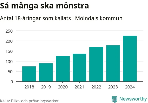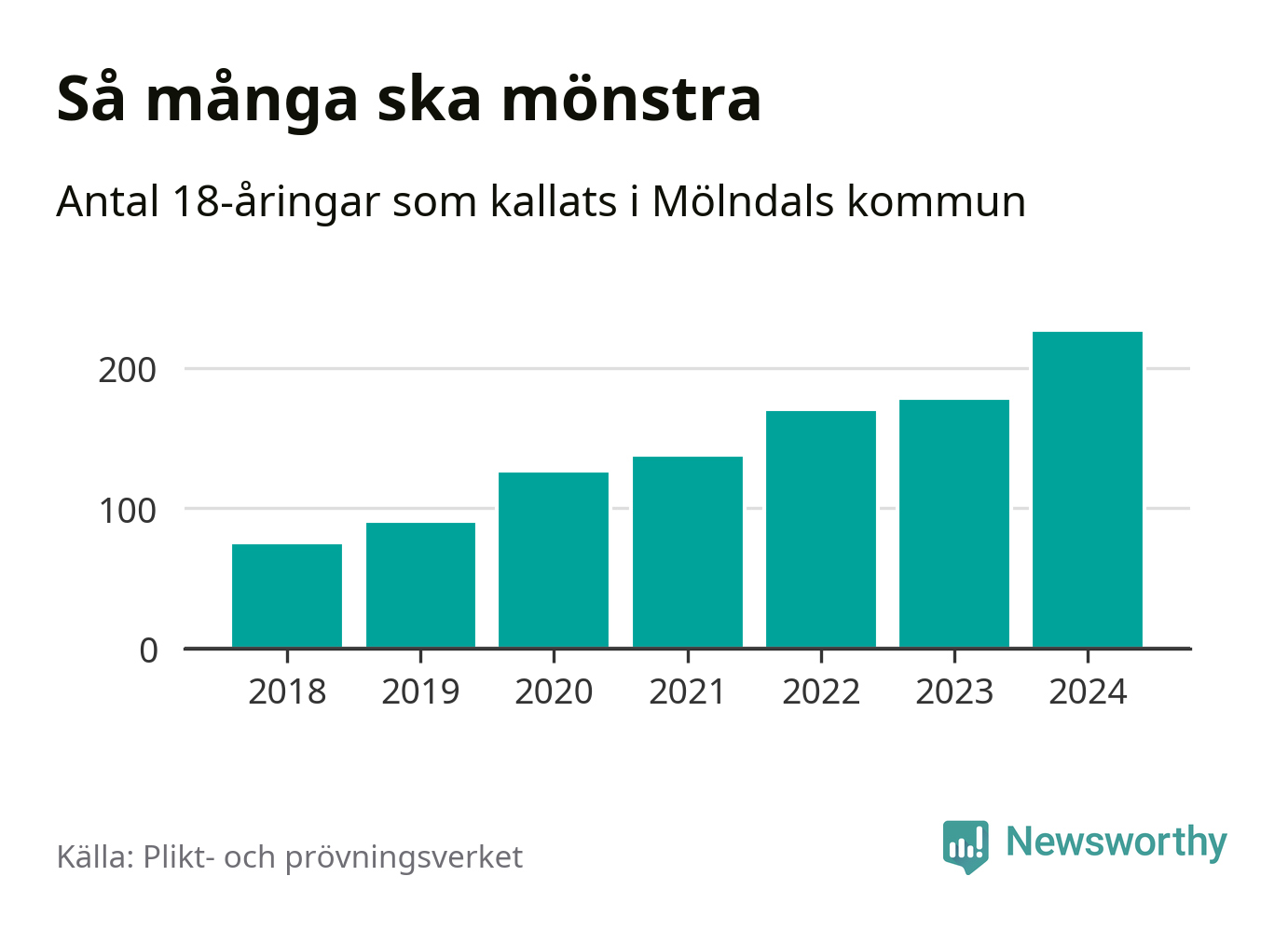 Antalet kallade i Mölndal har ökat varje år sedan 2018, som är första året med statistik på kommunnivå (värnplikten återinfördes 2017), och jämfört med 2023 är det 48 fler i år. 2018 kallades som jämförelse 76 artonåringar från Mölndal till mönstring. Det motsvarade ungefär 10 procent av årskullen född år 2000. Totalt från Västra Götalands län kallas 4 562 personer födda 2006 i år.