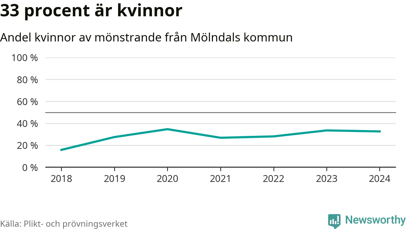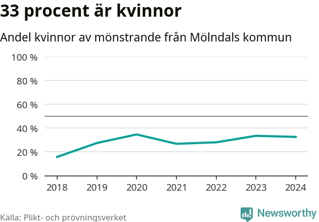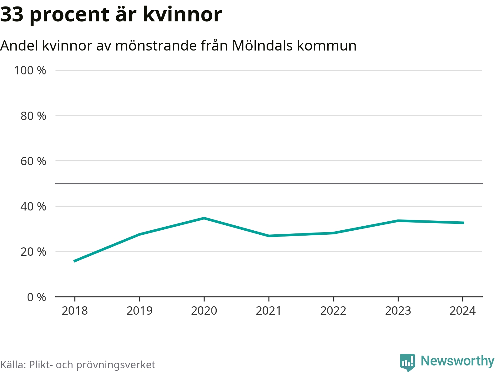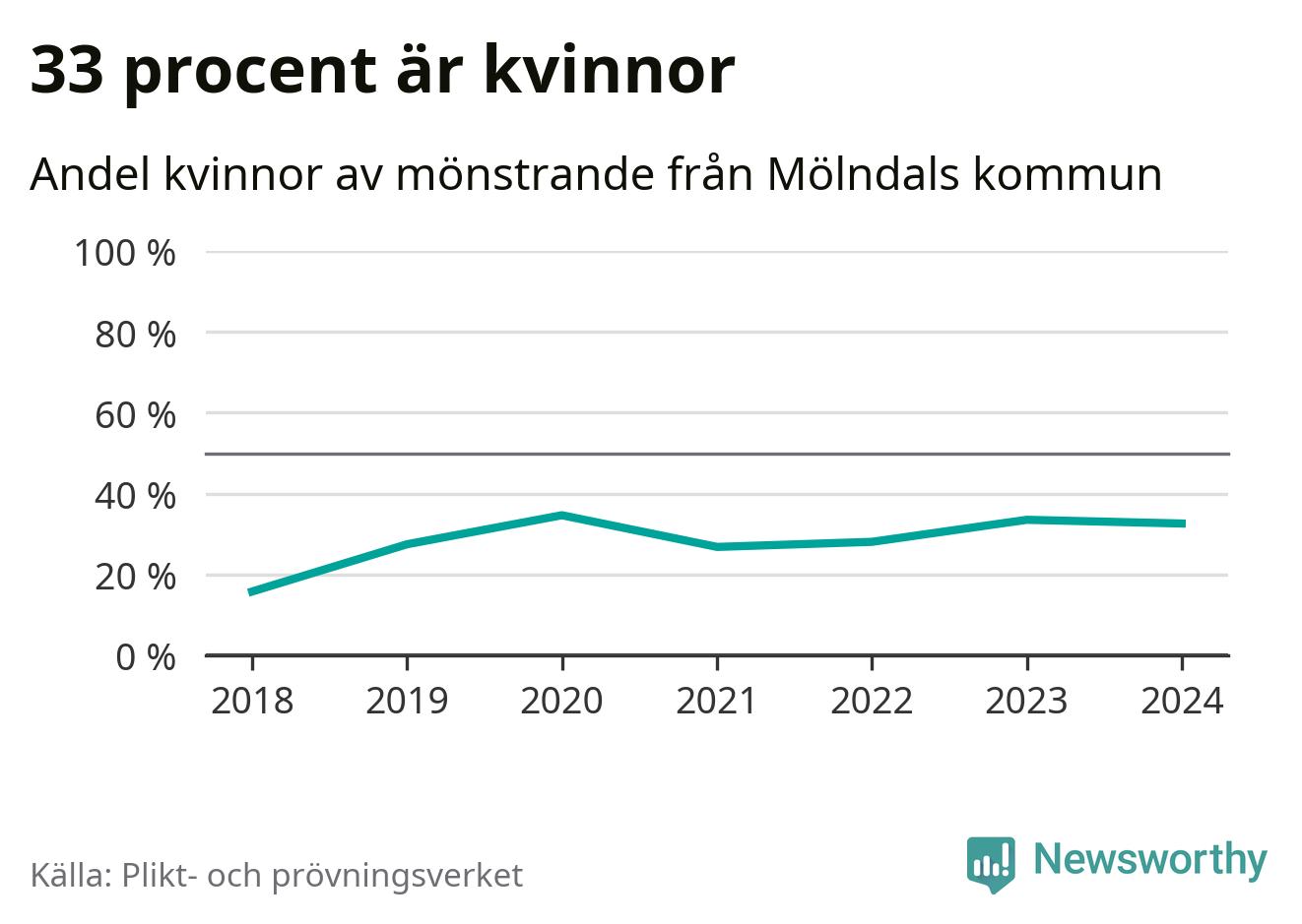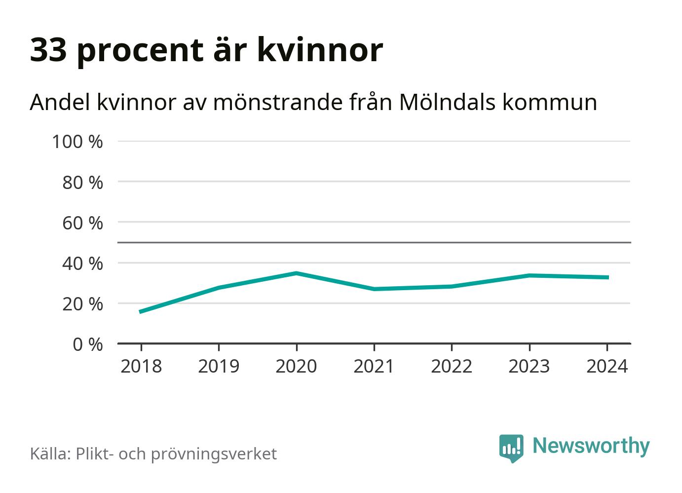 74 av de som kallats till mönstring från Mölndal är kvinnor, vilket motsvarar 33 procent av de mönstrande. I absoluta tal är det fler kvinnor än något år sedan värnplikten återinfördes, men 2020 var en större andel av de mönstrande från kommunen kvinnor (35 procent). I riket som helhet är 30 procent av de mönstrande tjejer.