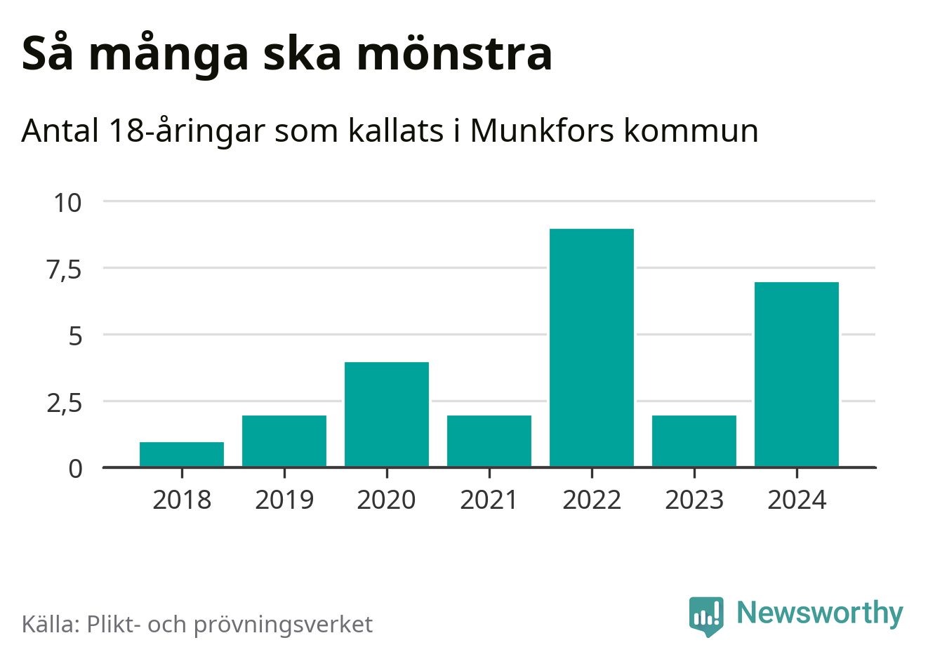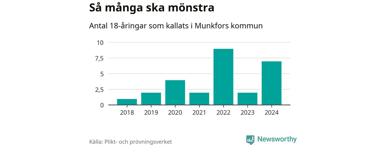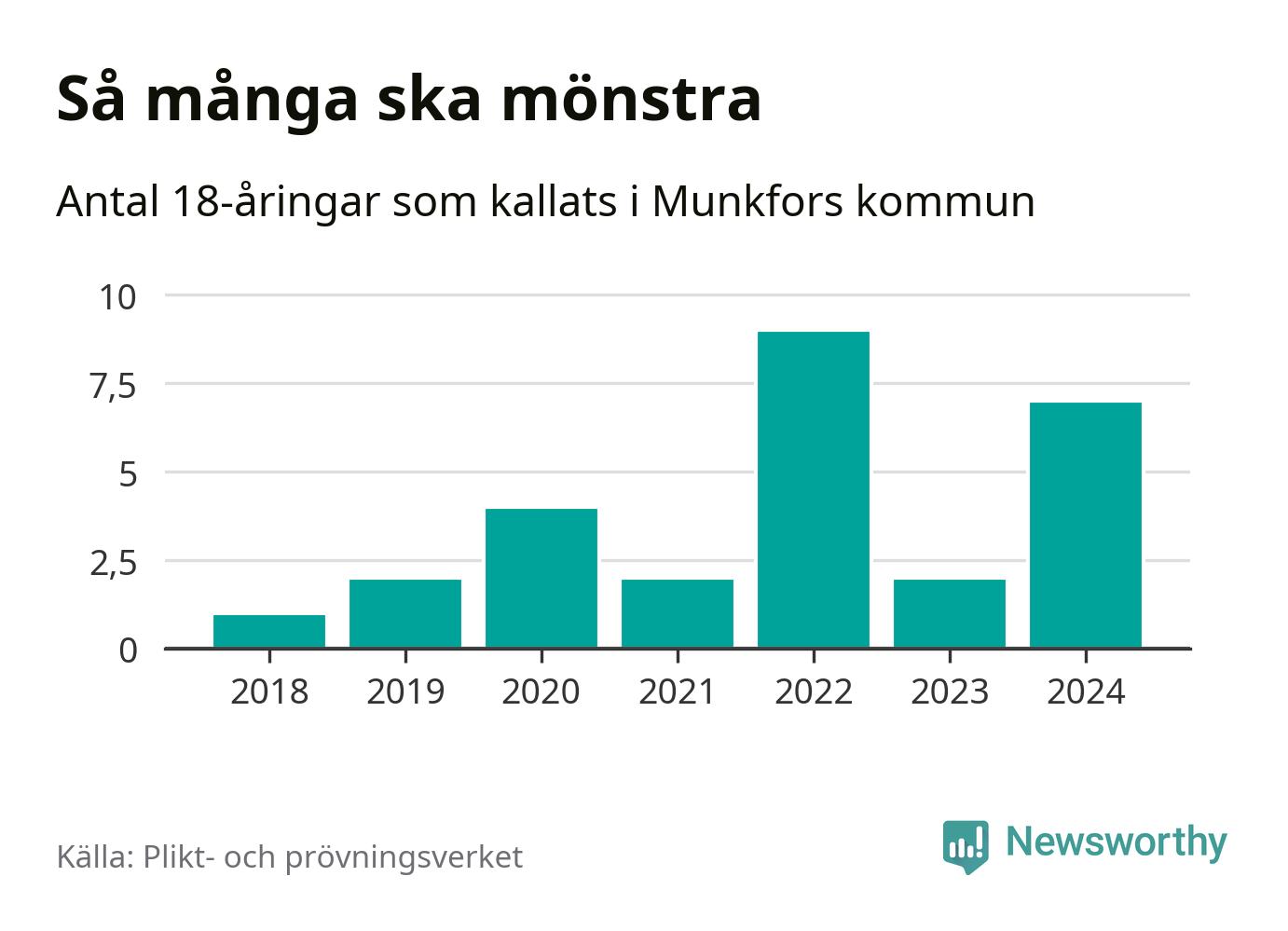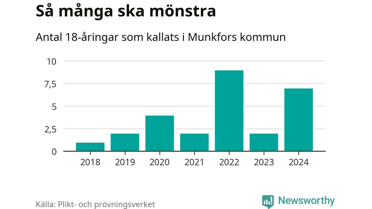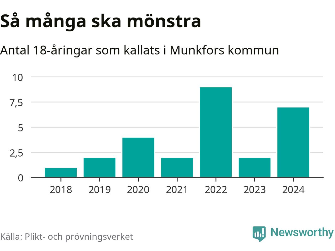 Sju personer är fem fler än 2023. Som mest har nio personer från en årskull kommunen mönstrat (2022). 2018 kallades som jämförelse en 18-åringar från Munkfors till mönstring. Det motsvarade ungefär 3 procent av årskullen född år 2000. Totalt från Värmlands län kallas 705 personer födda 2006 i år.