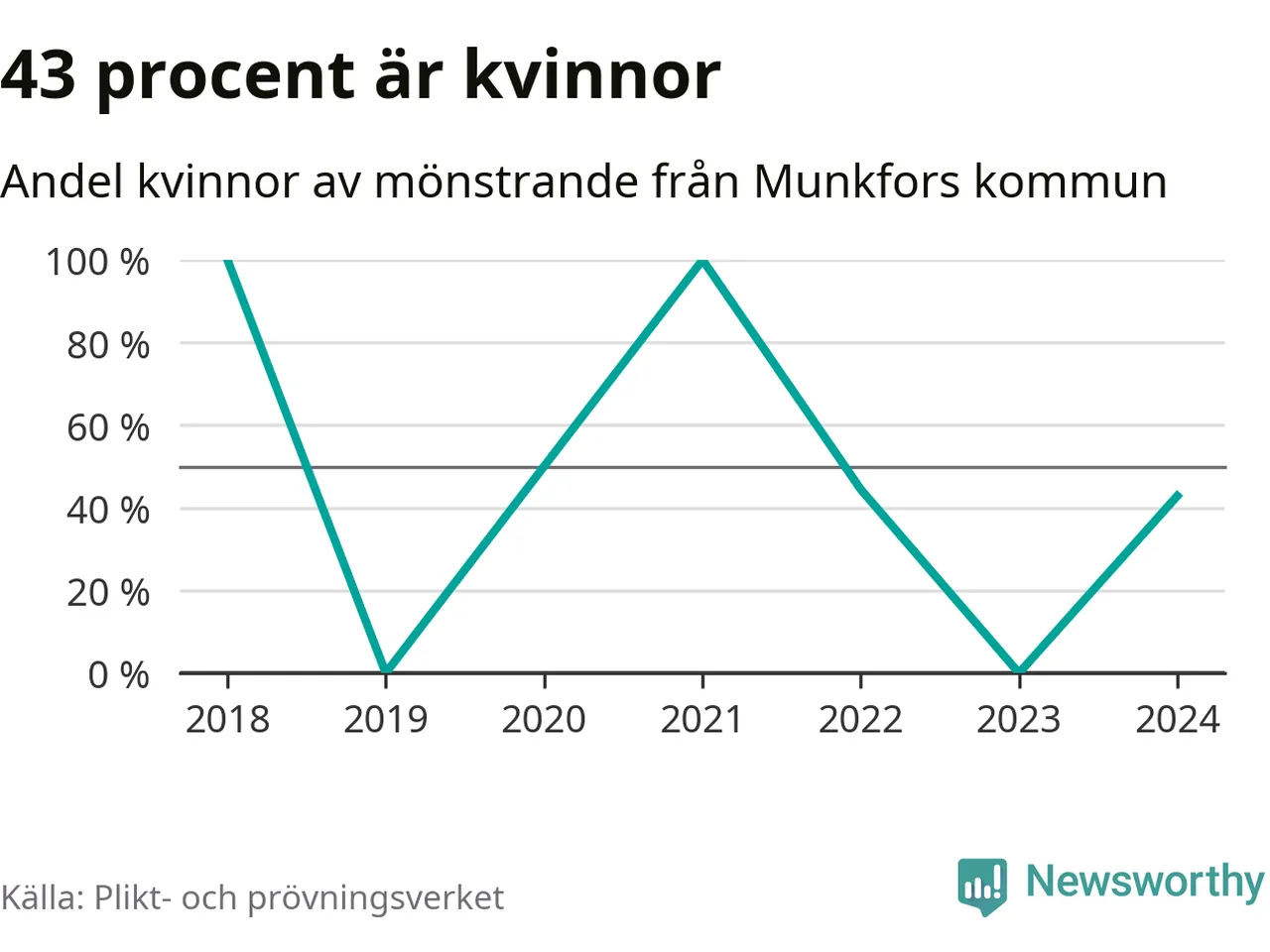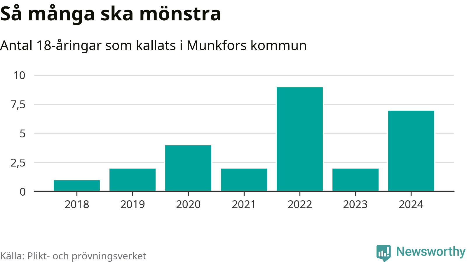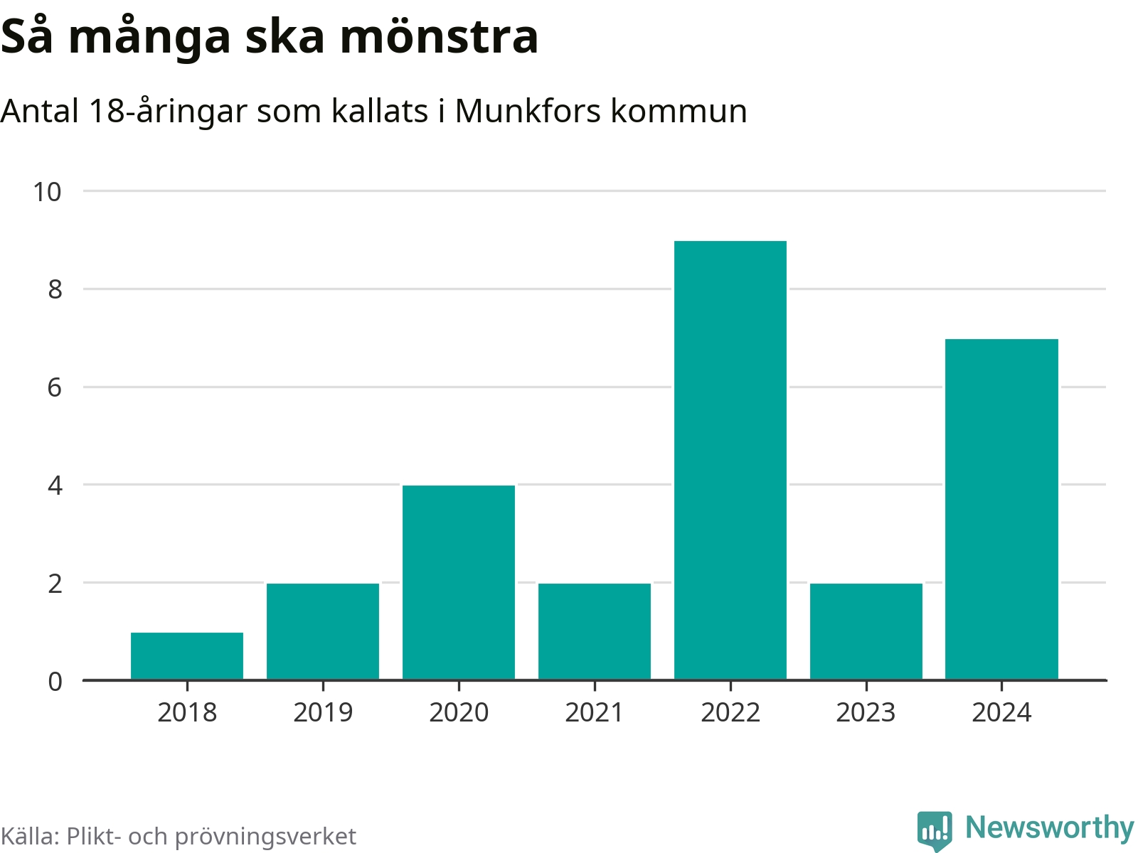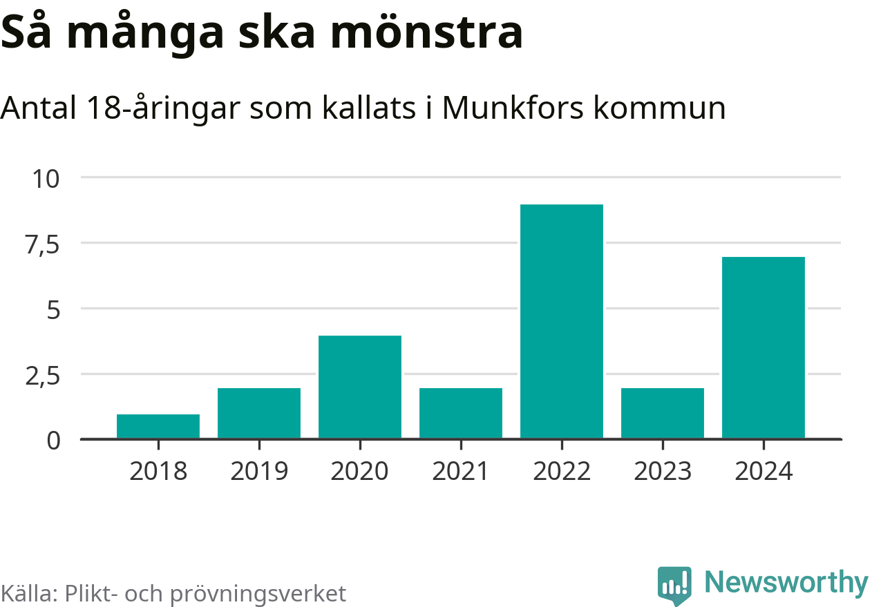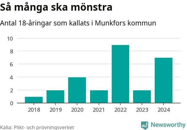 Sju personer är fem fler än 2023. Som mest har nio personer från en årskull kommunen mönstrat (2022). 2018 kallades som jämförelse en 18-åringar från Munkfors till mönstring. Det motsvarade ungefär 3 procent av årskullen född år 2000. Totalt från Värmlands län kallas 705 personer födda 2006 i år.