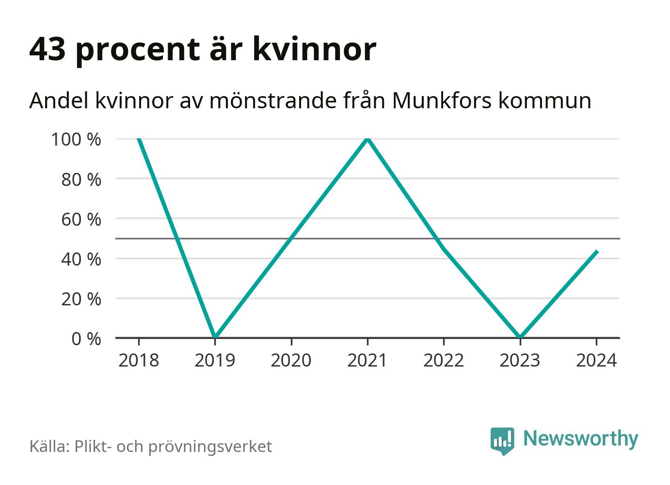 Tre av de som kallats till mönstring från Munkfors är kvinnor, vilket motsvarar 43 procent av de mönstrande. Som mest har fyra kvinnor kallats från kommunen (2022). I riket som helhet är 30 procent av de mönstrande tjejer.