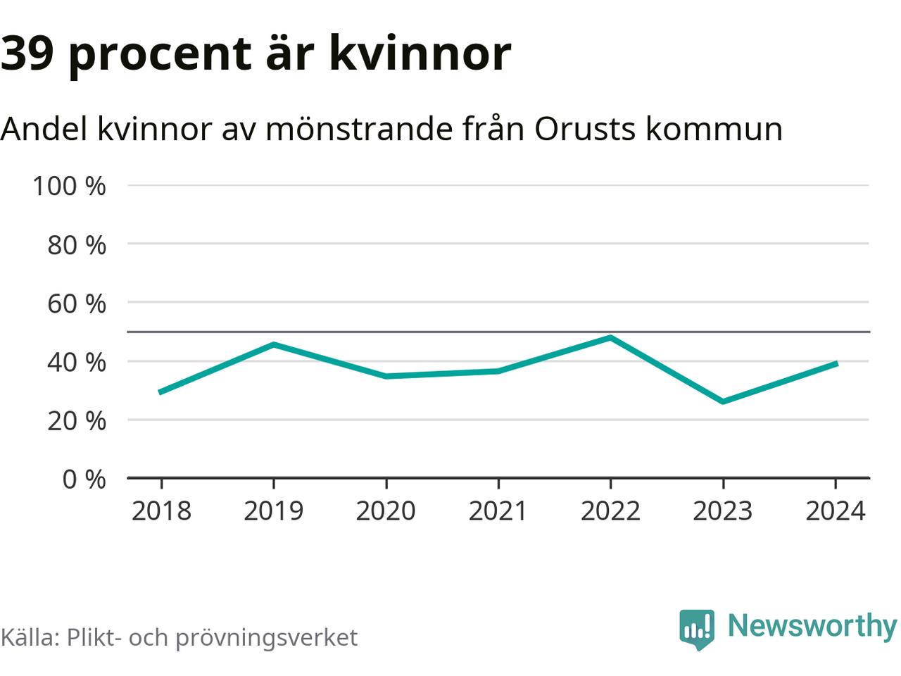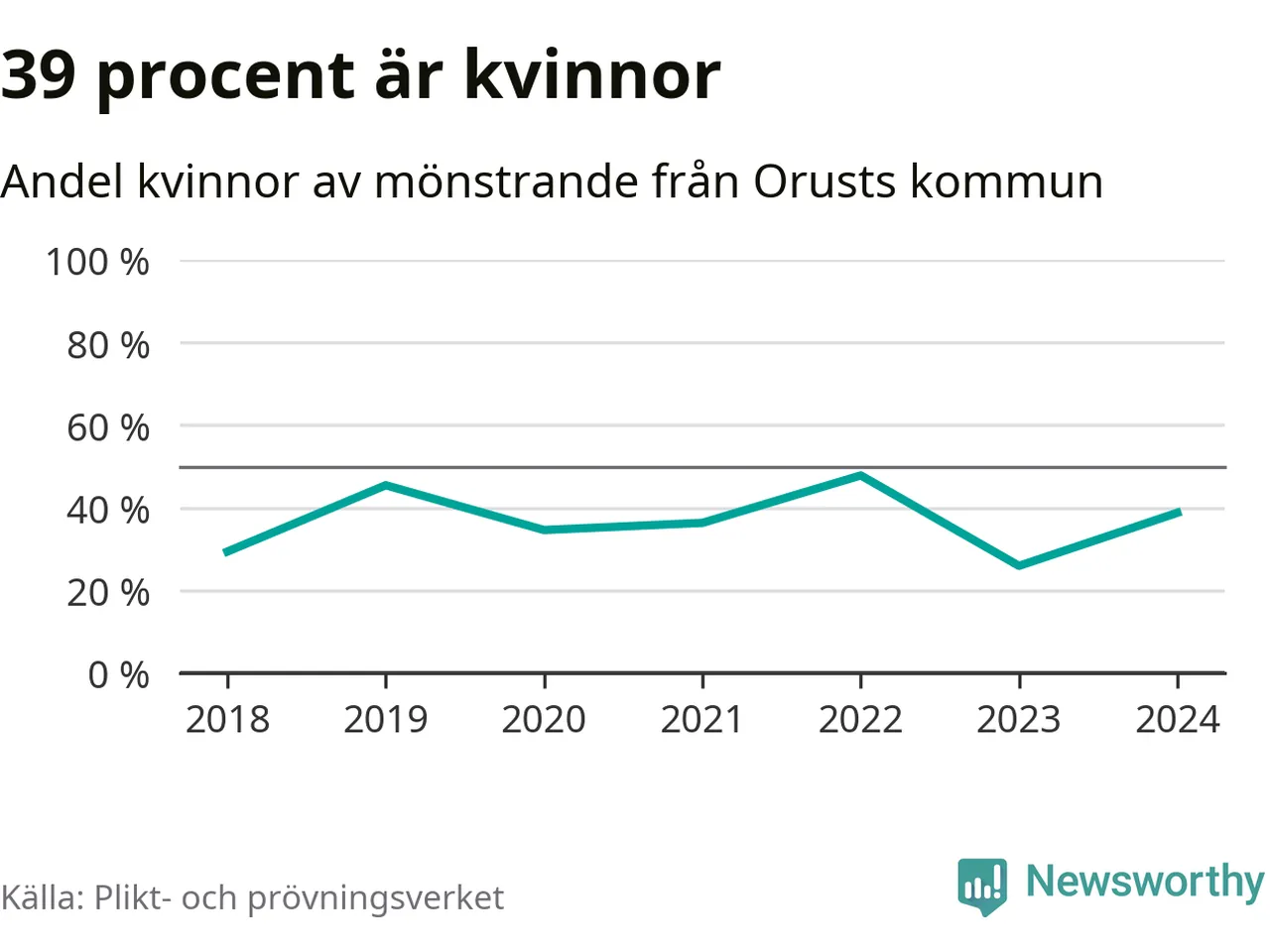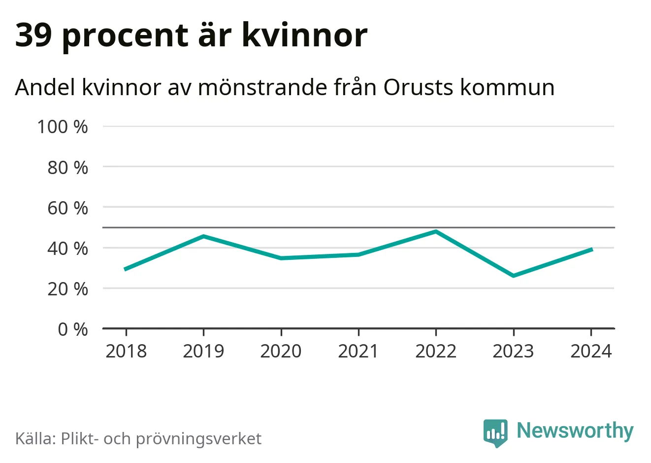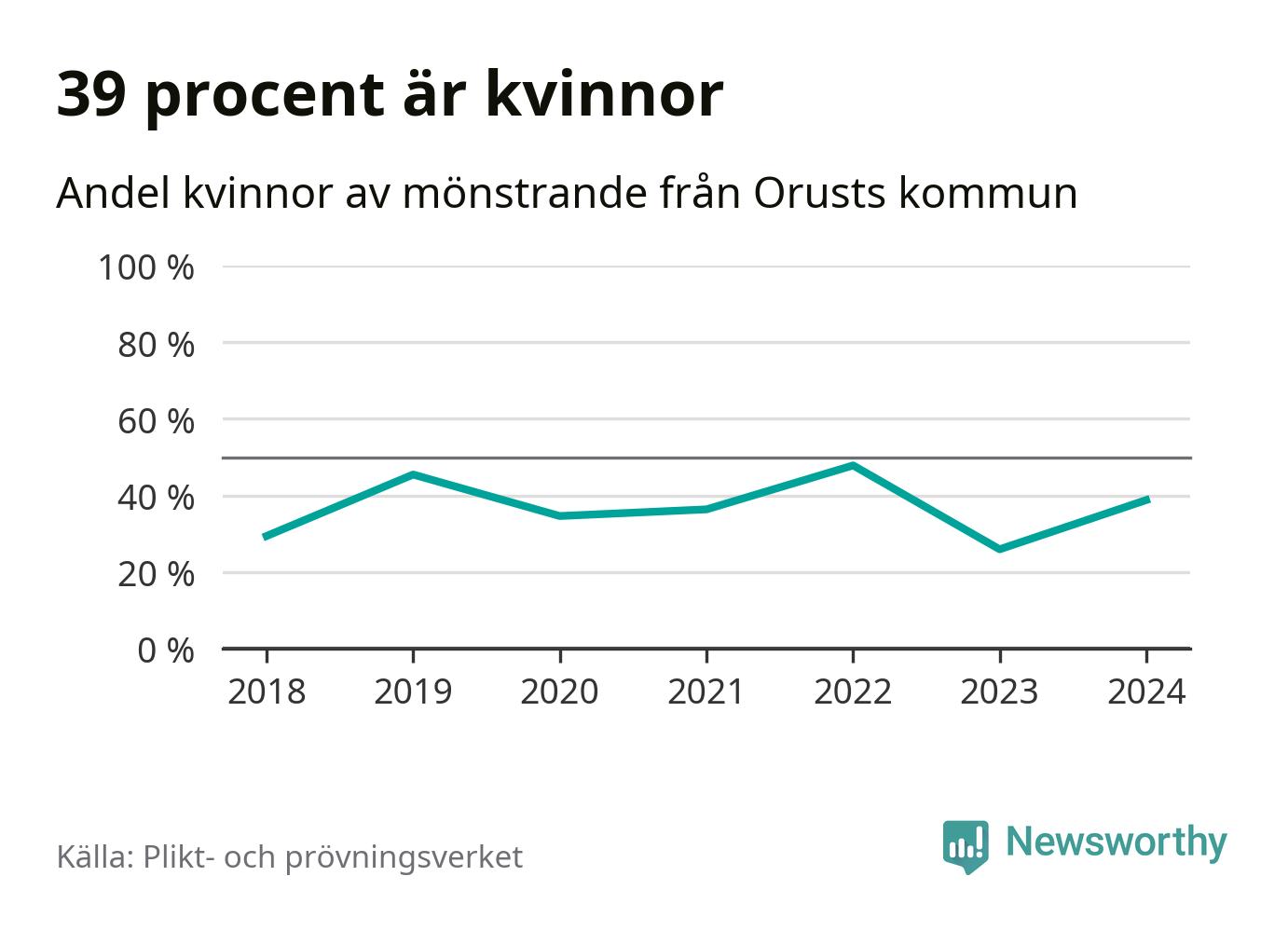 19 av de som kallats till mönstring från Orust är kvinnor, vilket motsvarar 39 procent av de mönstrande. I absoluta tal är det fler kvinnor än något år sedan värnplikten återinfördes, men 2022 var en större andel av de mönstrande från kommunen kvinnor (48 procent). I riket som helhet är 30 procent av de mönstrande tjejer.