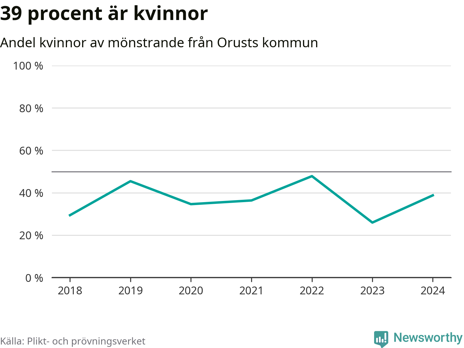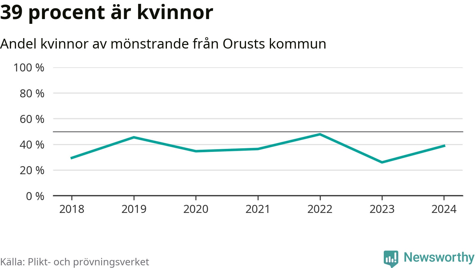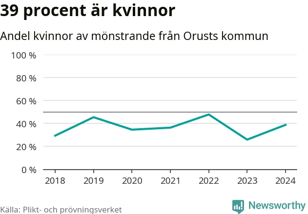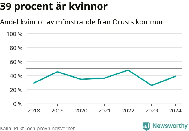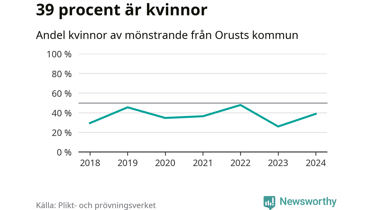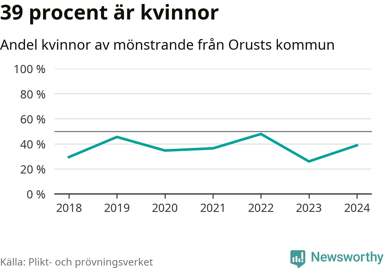 19 av de som kallats till mönstring från Orust är kvinnor, vilket motsvarar 39 procent av de mönstrande. I absoluta tal är det fler kvinnor än något år sedan värnplikten återinfördes, men 2022 var en större andel av de mönstrande från kommunen kvinnor (48 procent). I riket som helhet är 30 procent av de mönstrande tjejer.