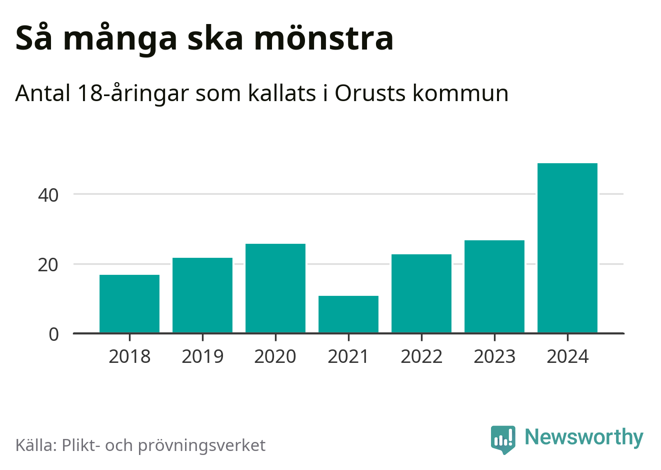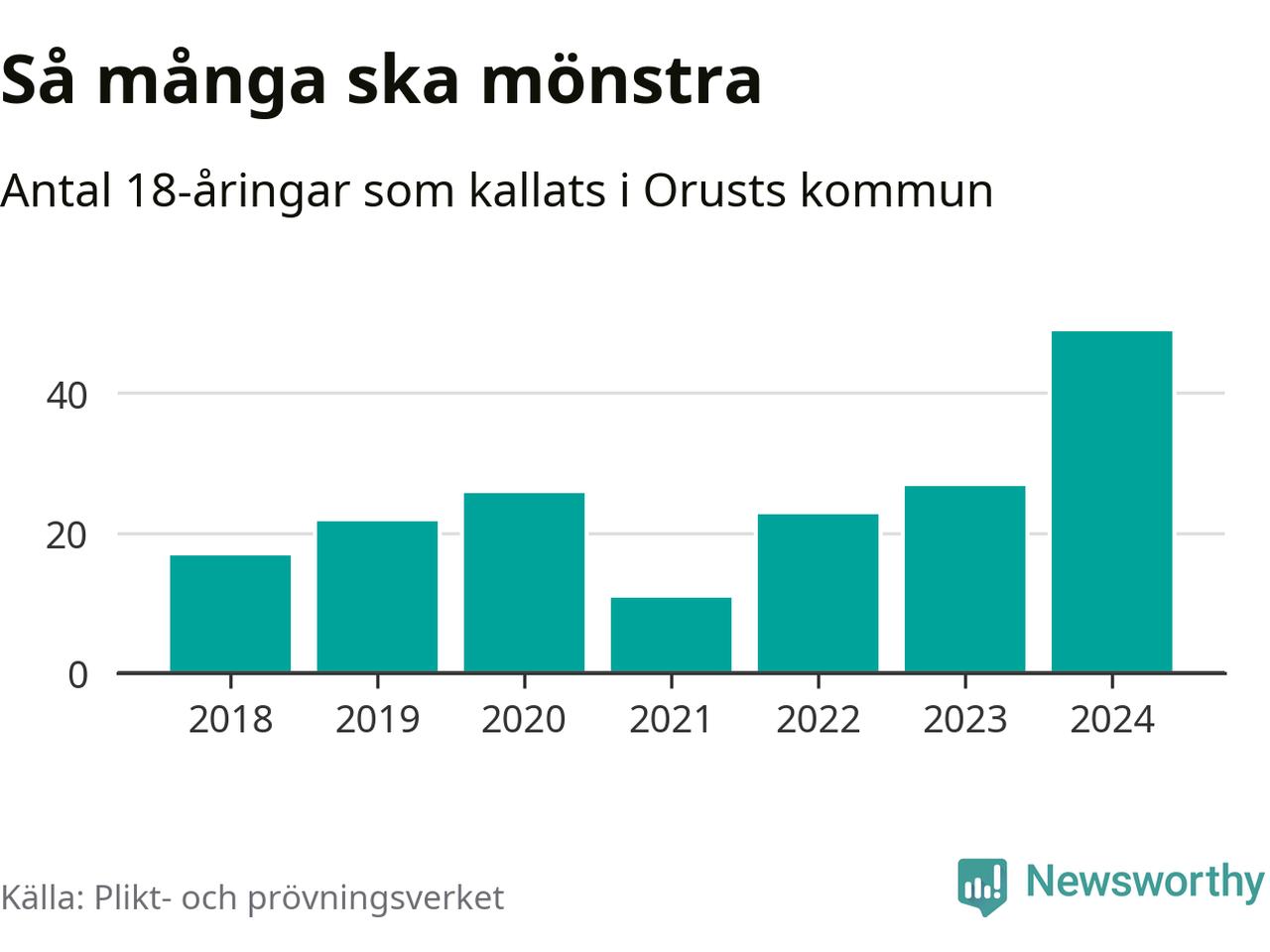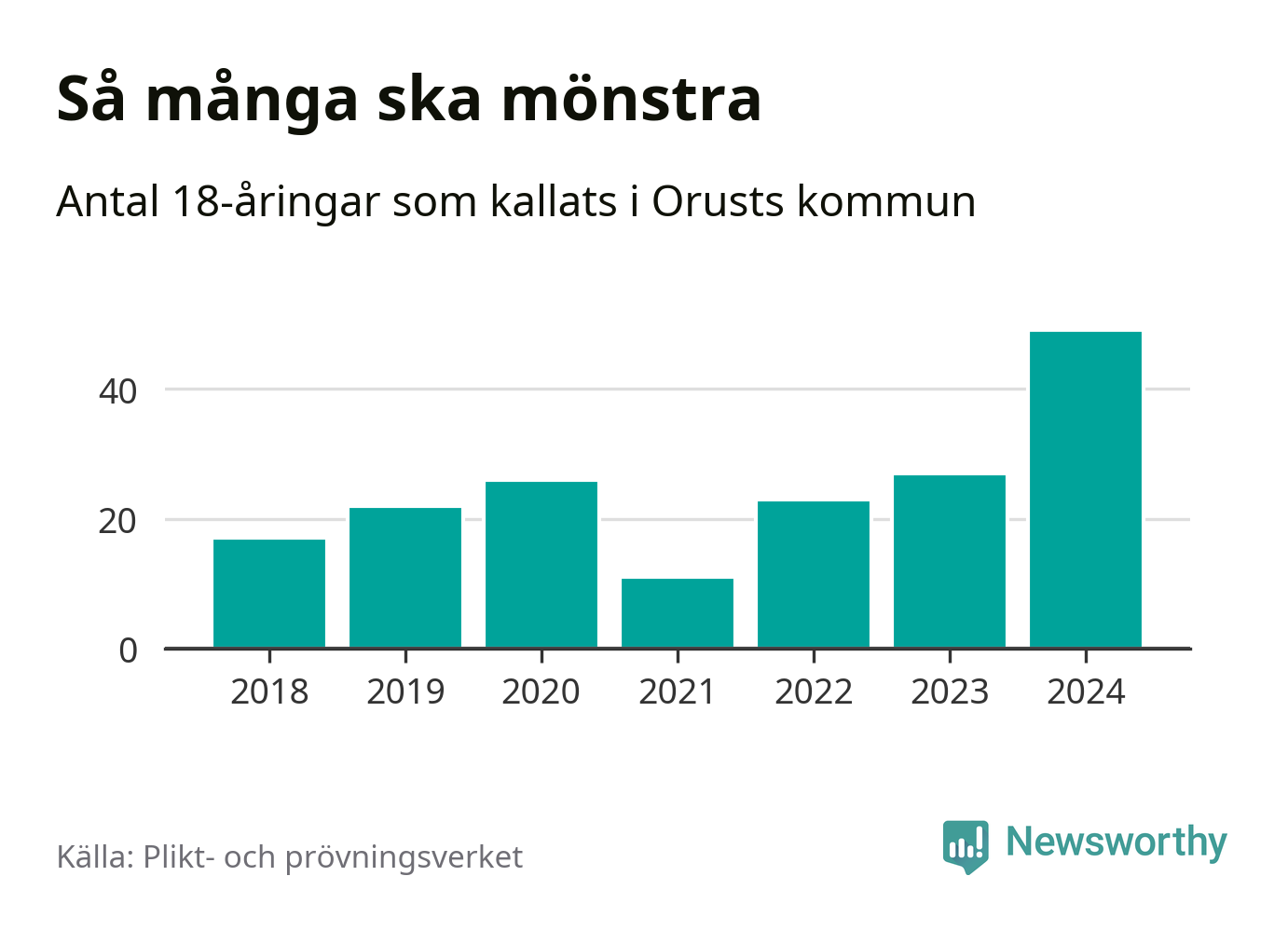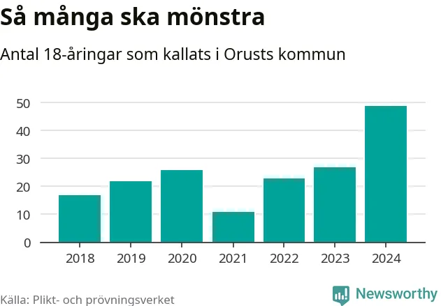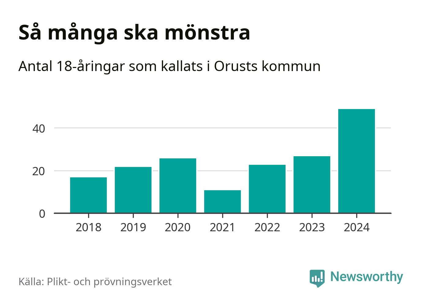 49 personer är det högsta antalet kallade på Orust sedan 2018, som är första året med statistik på kommunnivå (värnplikten återinfördes 2017), och 22 mönstrande mer än 2023. 2018 kallades som jämförelse 17 artonåringar från Orust till mönstring. Det motsvarade ungefär 10 procent av årskullen född år 2000. Totalt från Västra Götalands län kallas 4 562 personer födda 2006 i år.