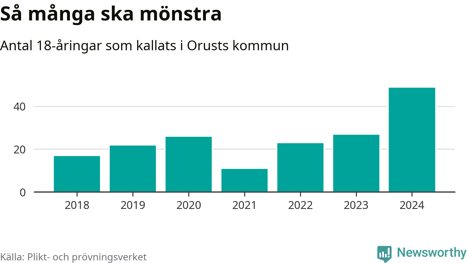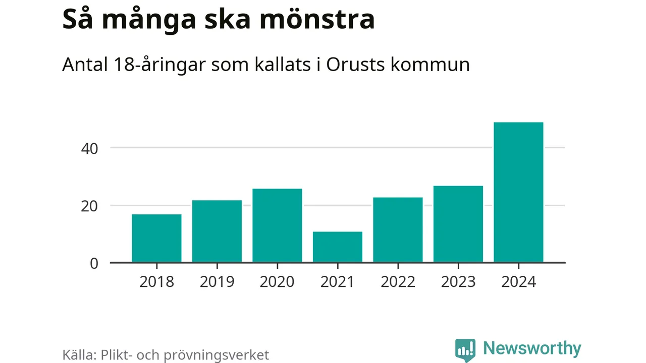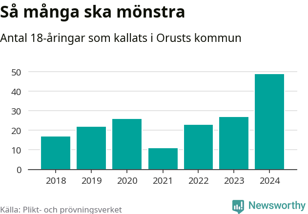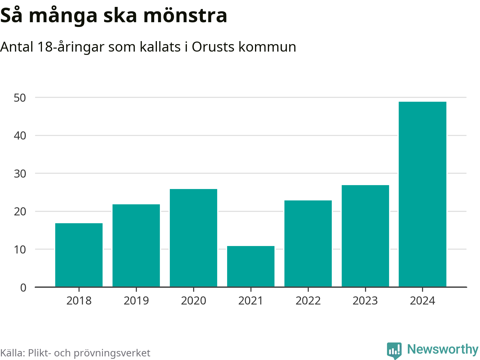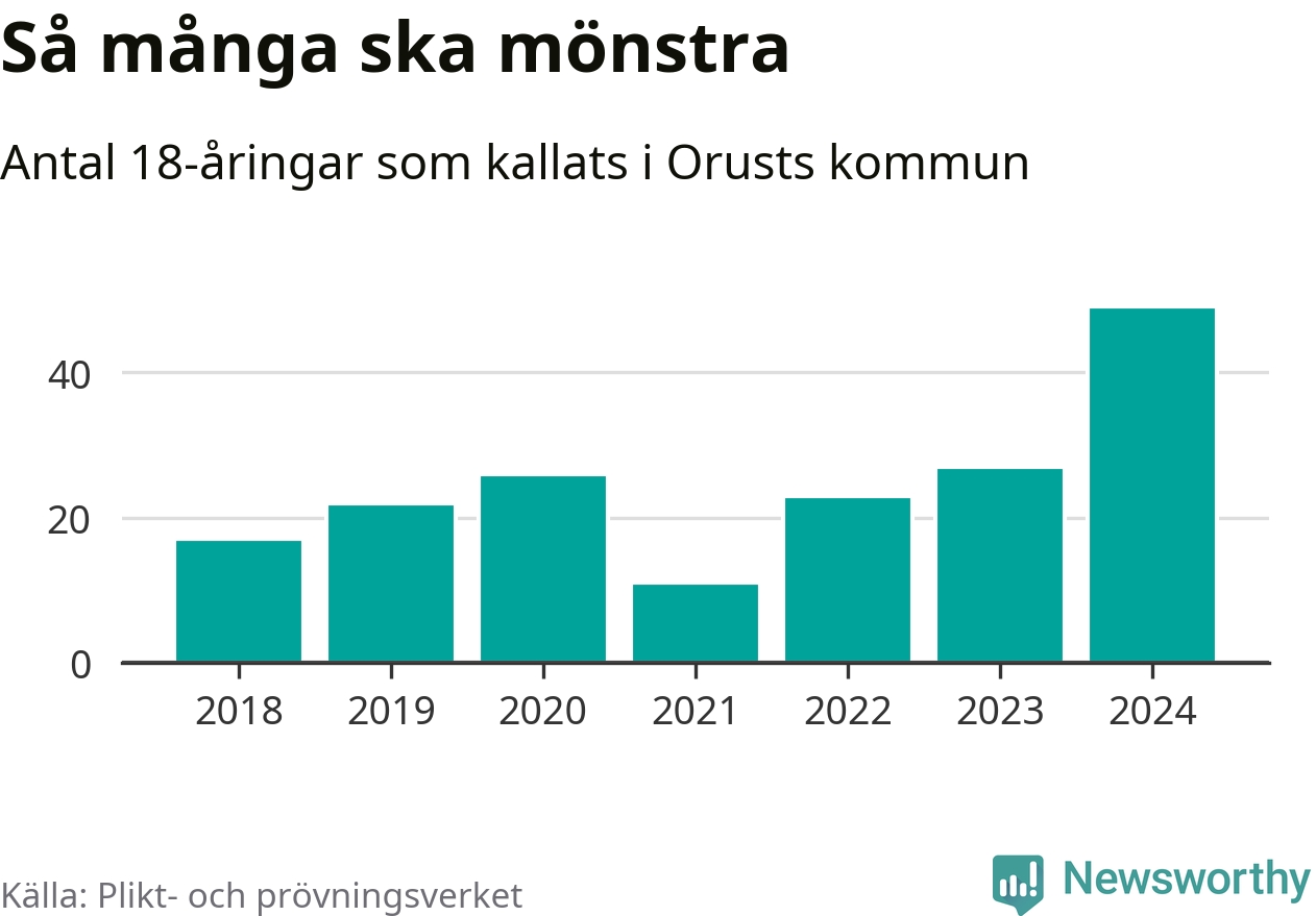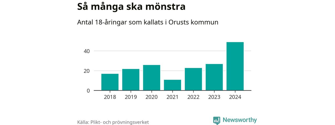 49 personer är det högsta antalet kallade på Orust sedan 2018, som är första året med statistik på kommunnivå (värnplikten återinfördes 2017), och 22 mönstrande mer än 2023. 2018 kallades som jämförelse 17 artonåringar från Orust till mönstring. Det motsvarade ungefär 10 procent av årskullen född år 2000. Totalt från Västra Götalands län kallas 4 562 personer födda 2006 i år.