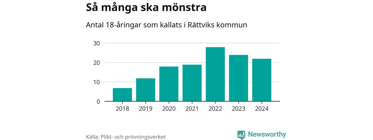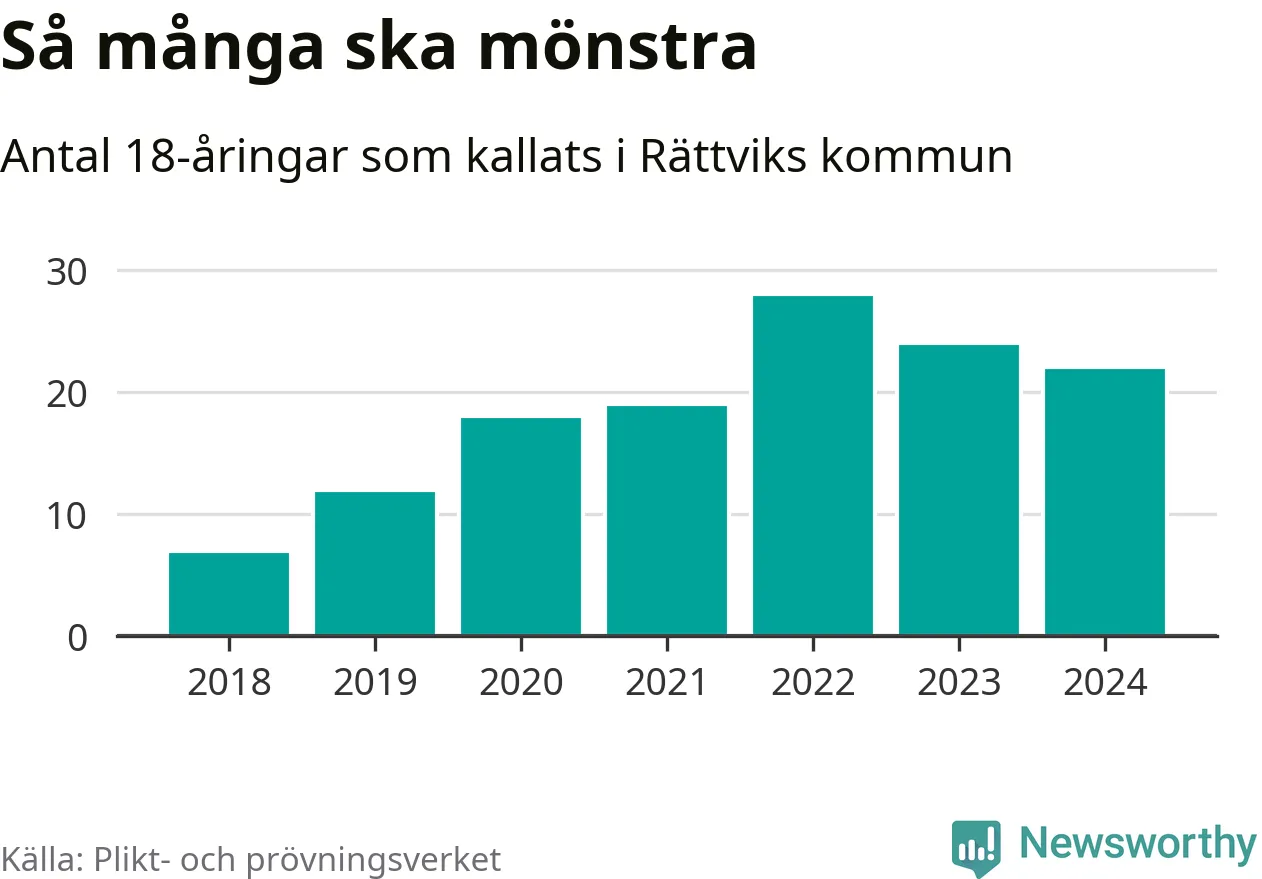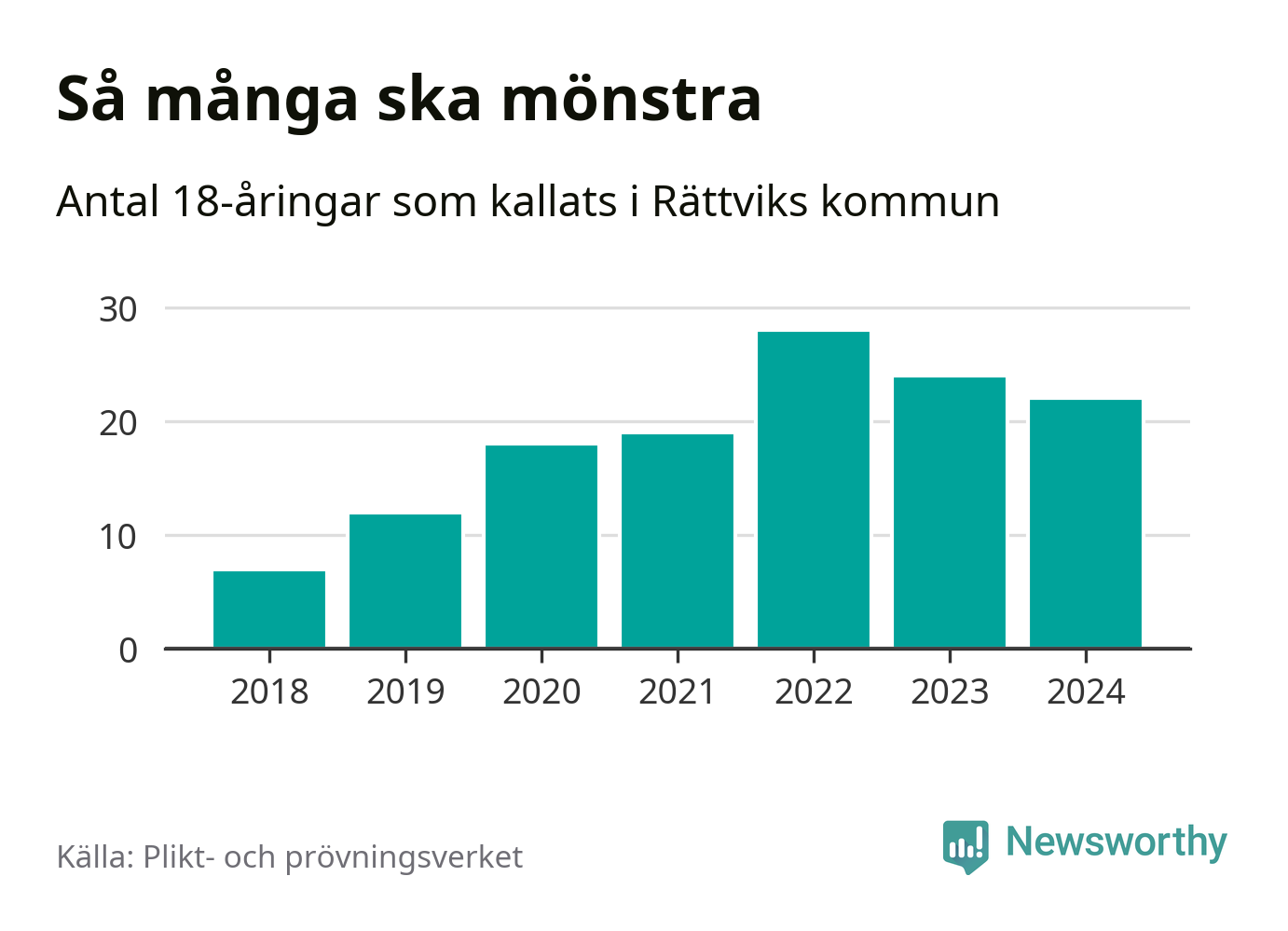 Nu kallas 27 900 svenskar födda 2006 till mönstring. Och 22 av dem kommer från Rättvik, enligt ny statistik från Plikt- och prövningsverket. Det innebär att var femte invånare i åldersgruppen i kommunen kallas till mönstring. Det är en lägre andel än i Dalarna totalt. I riket som helhet kallas nästan var fjärde person i årskullen.