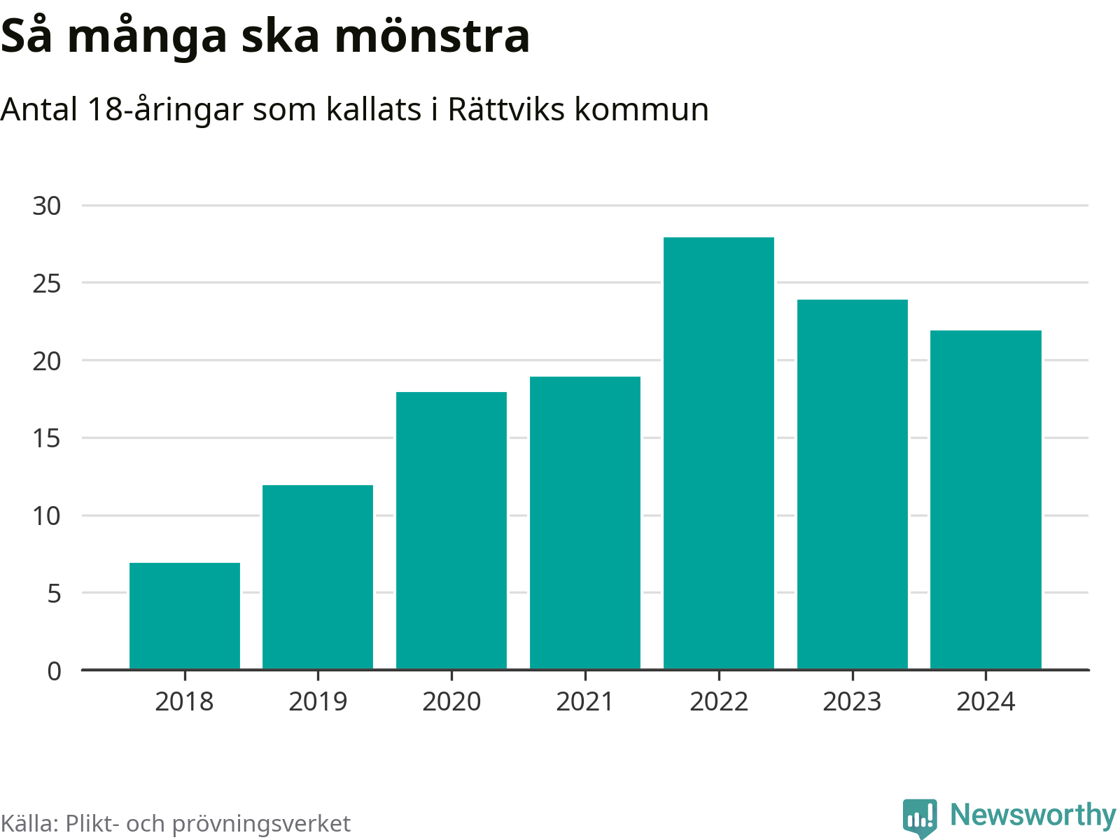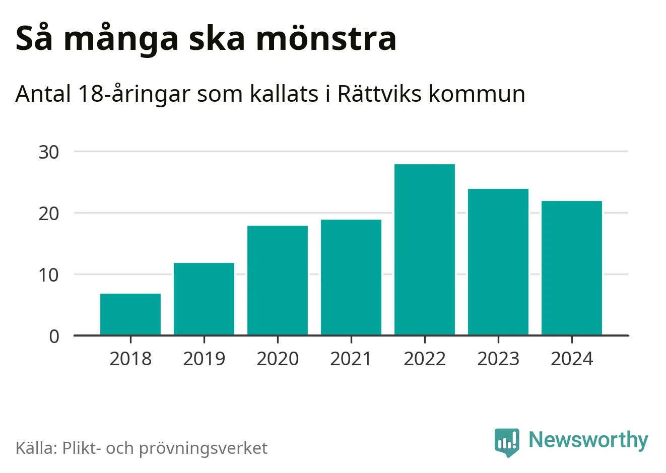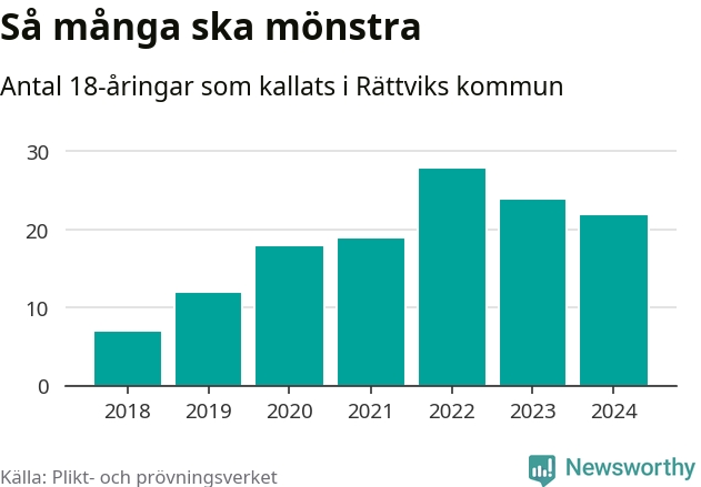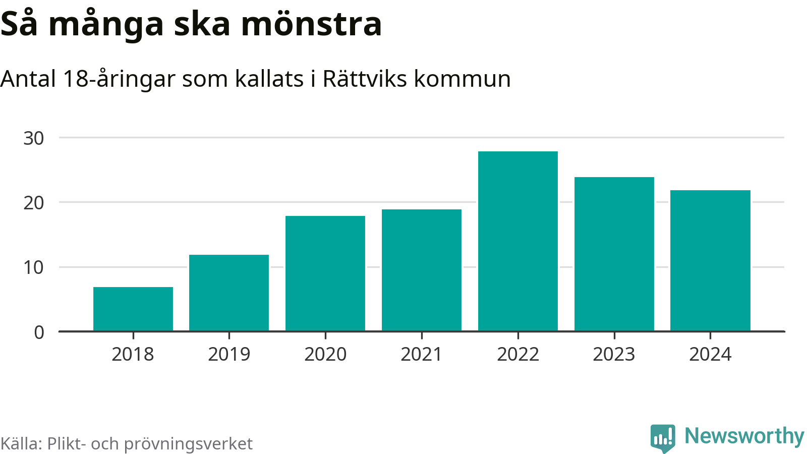 Nu kallas 27 900 svenskar födda 2006 till mönstring. Och 22 av dem kommer från Rättvik, enligt ny statistik från Plikt- och prövningsverket. Det innebär att var femte invånare i åldersgruppen i kommunen kallas till mönstring. Det är en lägre andel än i Dalarna totalt. I riket som helhet kallas nästan var fjärde person i årskullen.