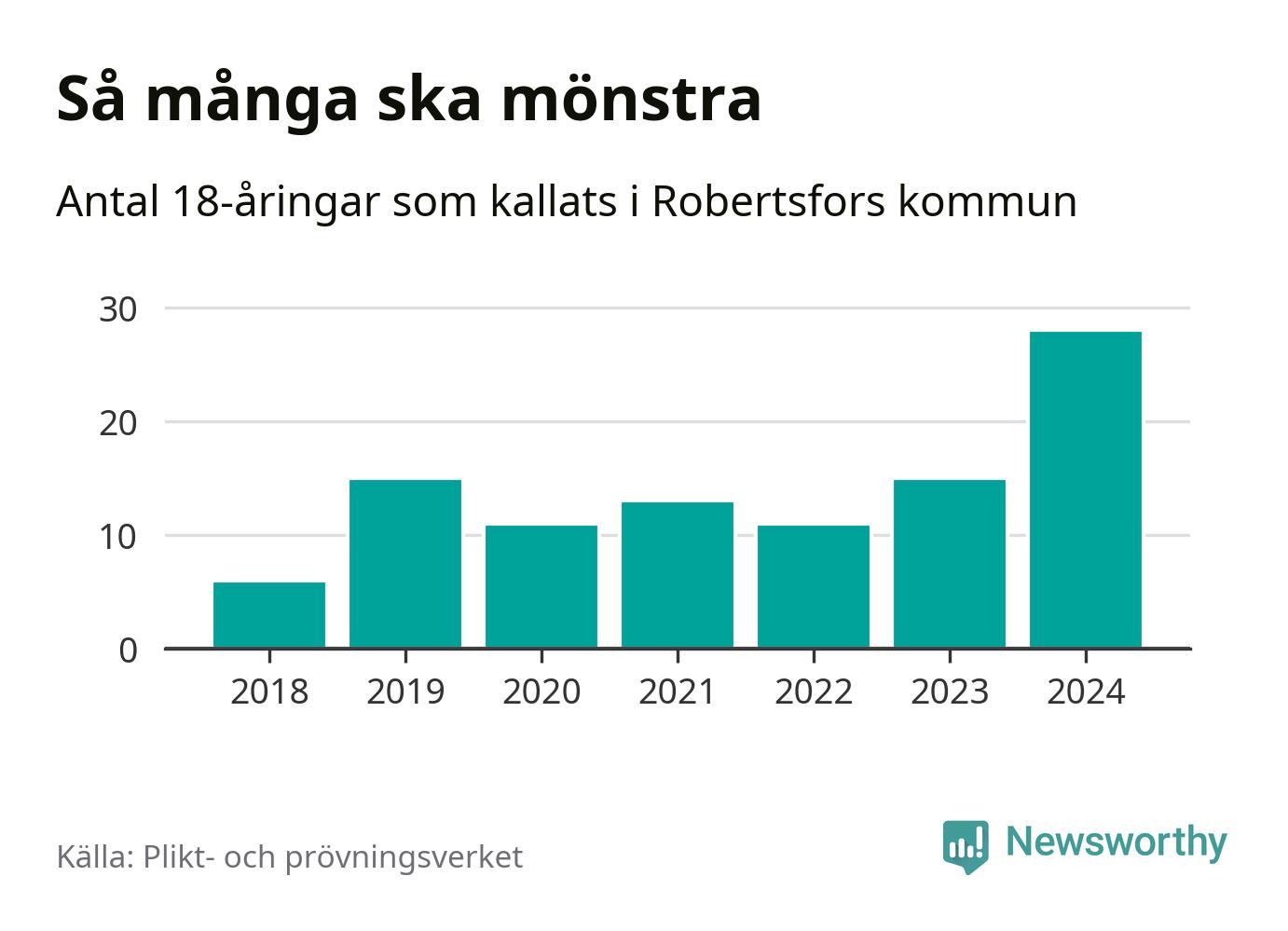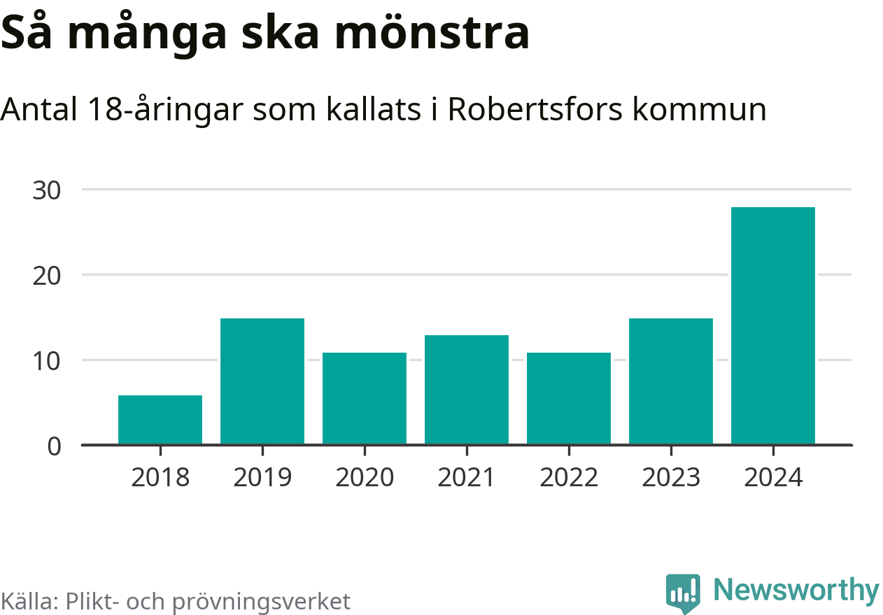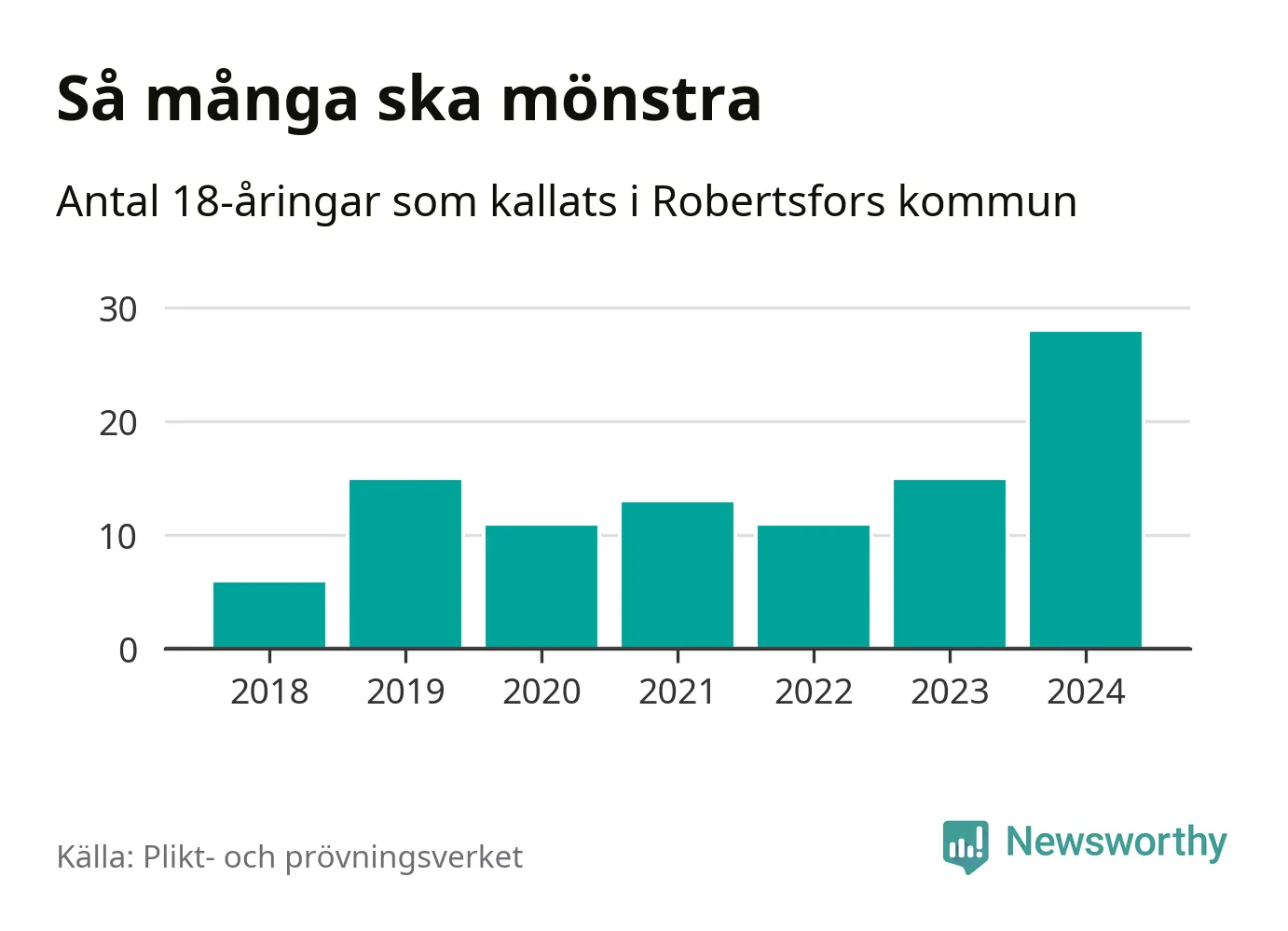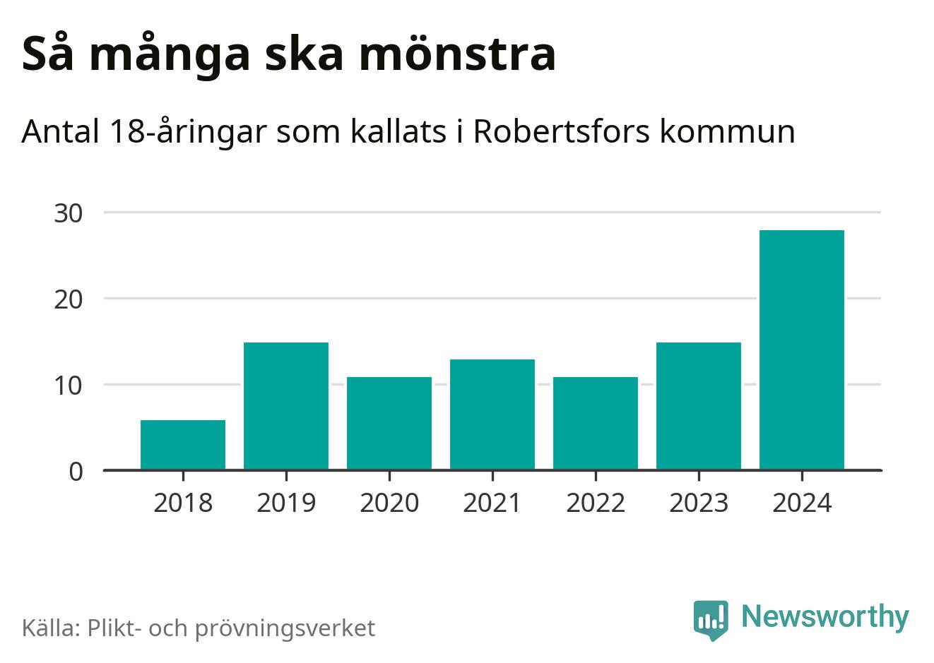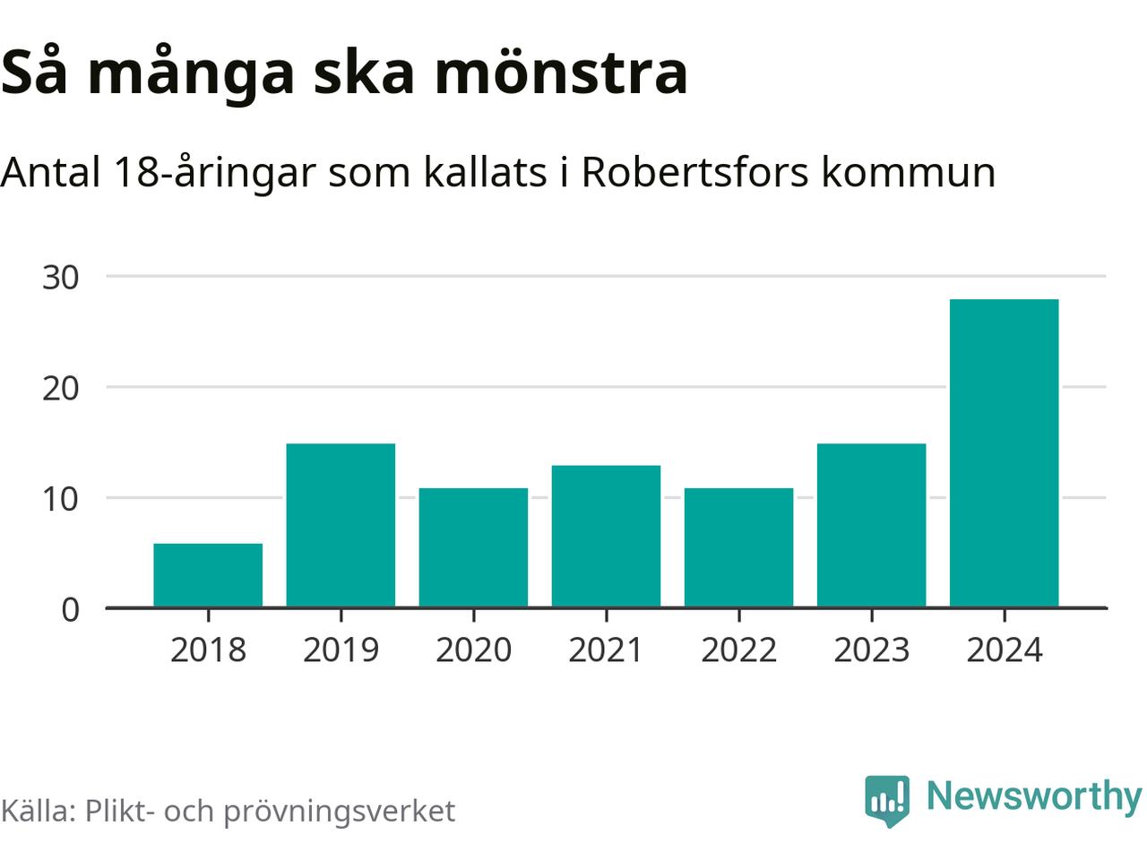 28 personer är det högsta antalet kallade i Robertsfors sedan 2018, som är första året med statistik på kommunnivå (värnplikten återinfördes 2017), och 13 mönstrande mer än 2023. 2018 kallades som jämförelse sex 18-åringar från Robertsfors till mönstring. Det motsvarade ungefär 9 procent av årskullen född år 2000. Totalt från Västerbottens län kallas 721 personer födda 2006 i år.