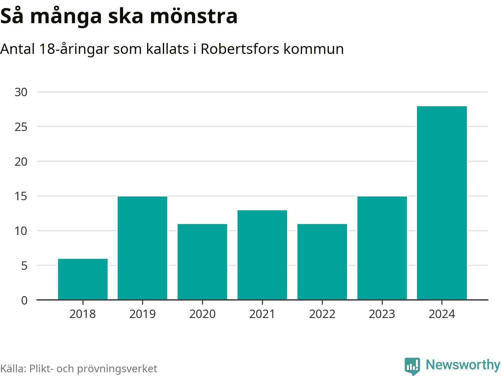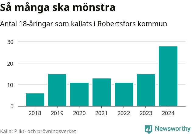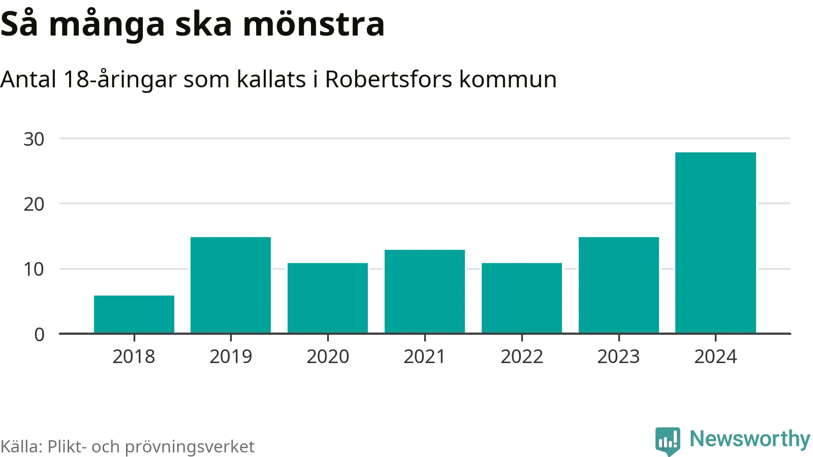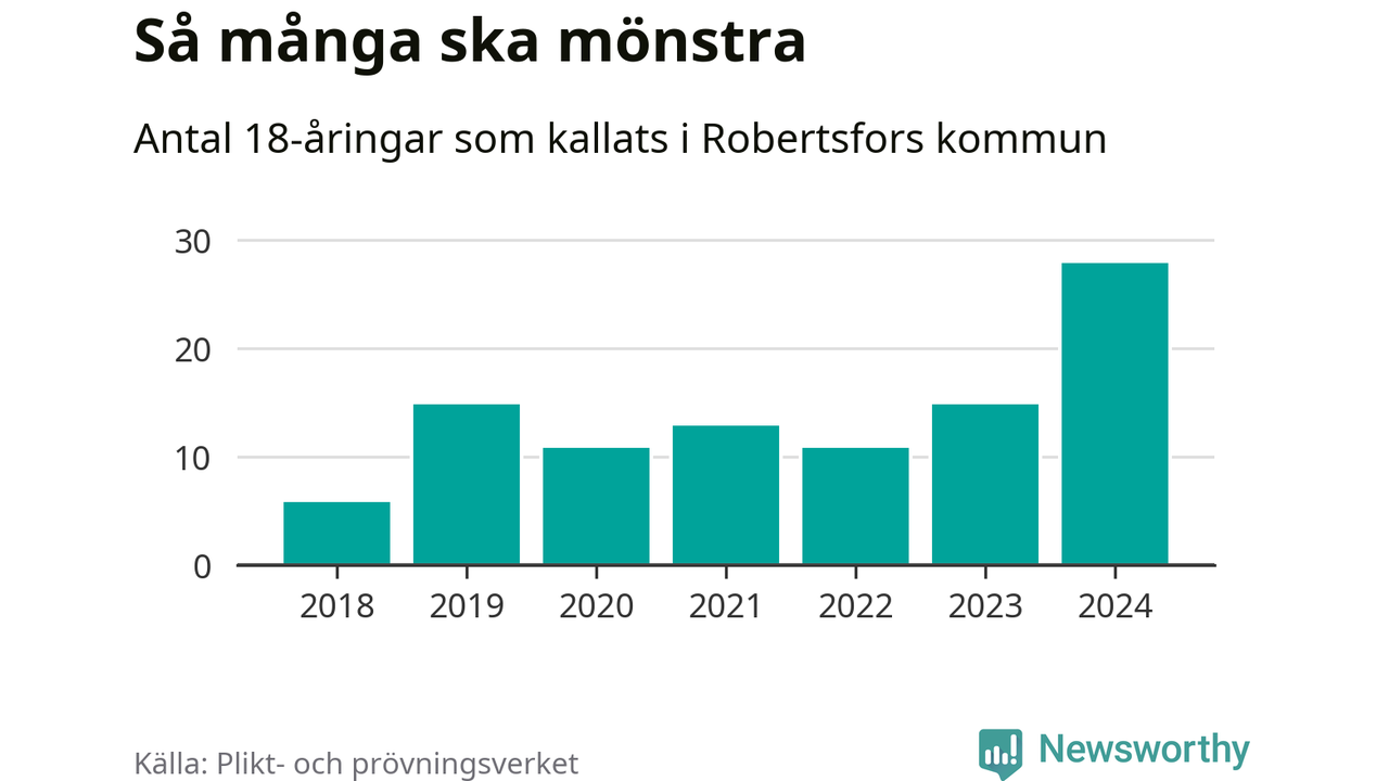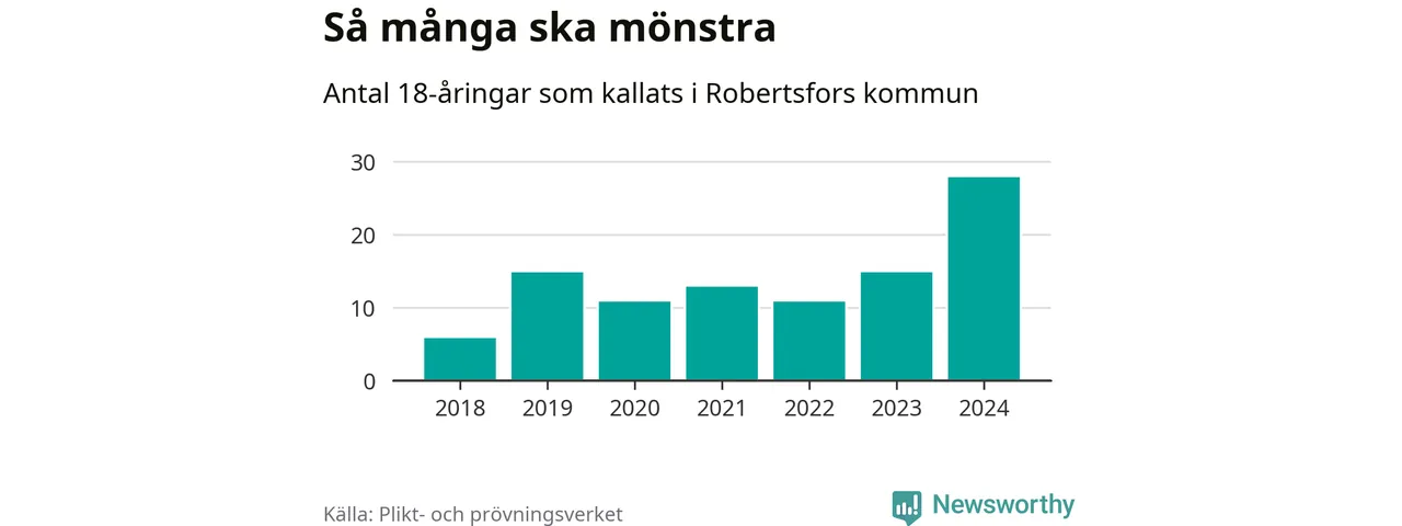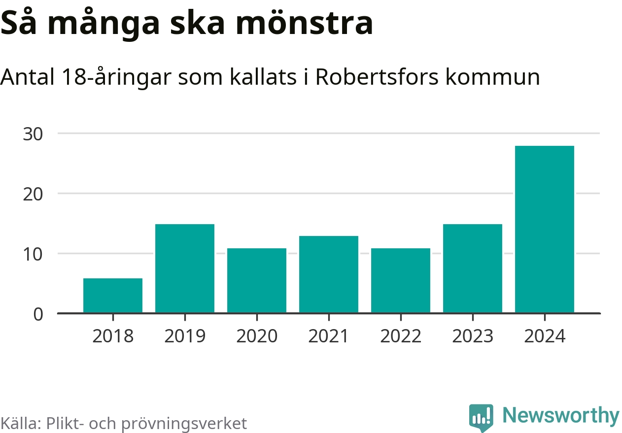 28 personer är det högsta antalet kallade i Robertsfors sedan 2018, som är första året med statistik på kommunnivå (värnplikten återinfördes 2017), och 13 mönstrande mer än 2023. 2018 kallades som jämförelse sex 18-åringar från Robertsfors till mönstring. Det motsvarade ungefär 9 procent av årskullen född år 2000. Totalt från Västerbottens län kallas 721 personer födda 2006 i år.