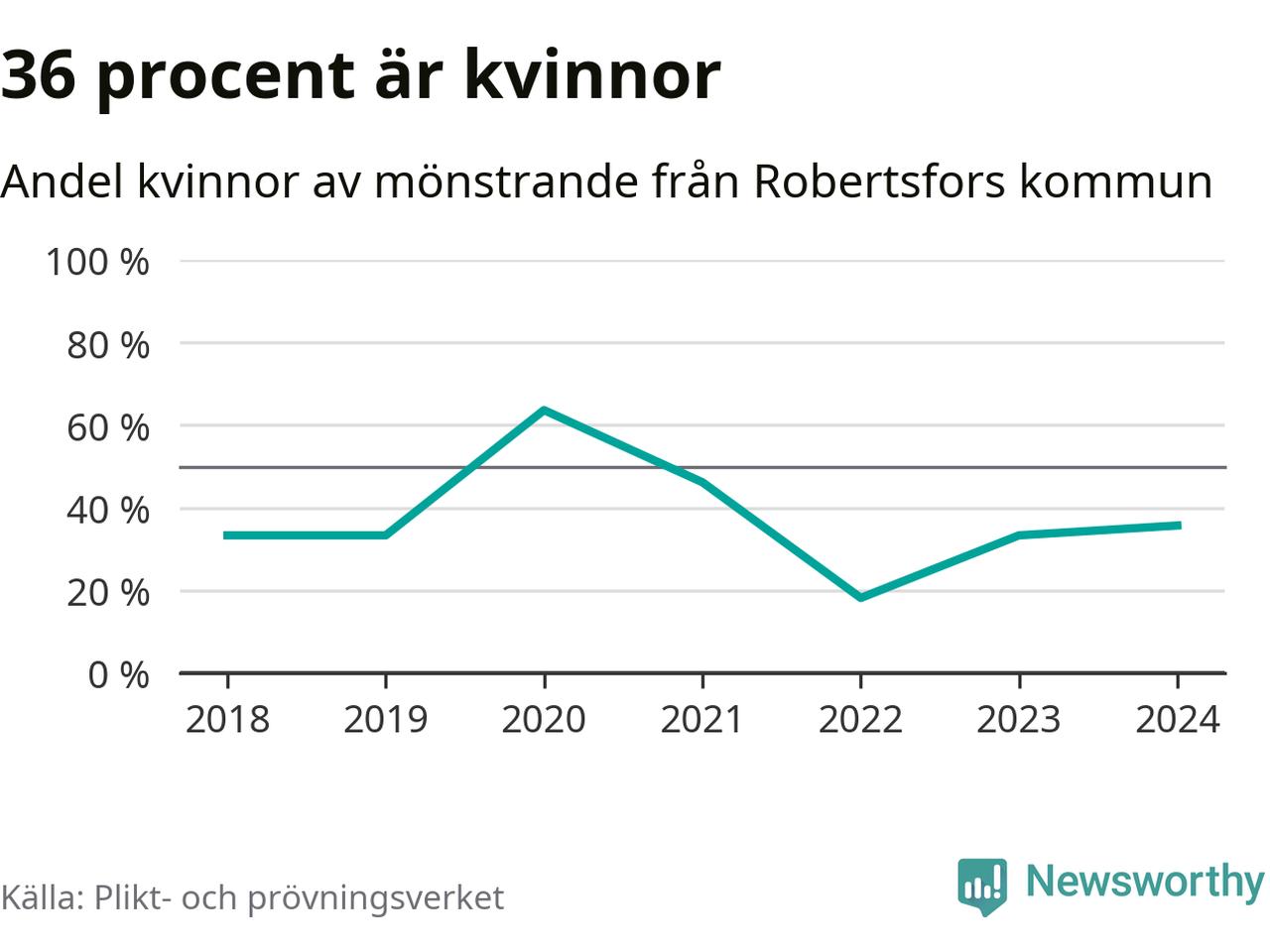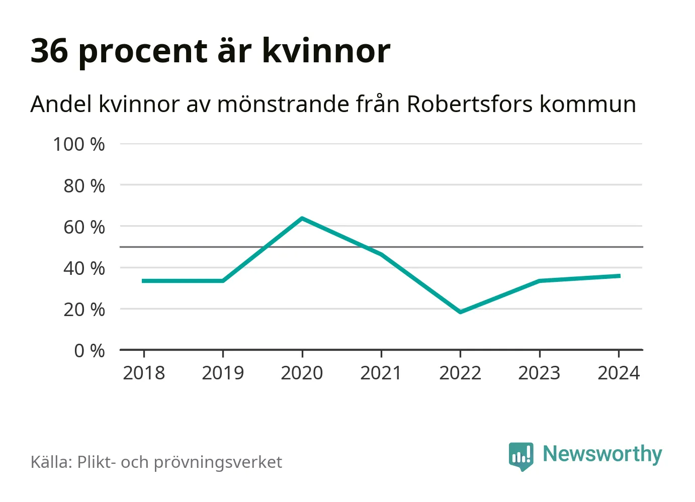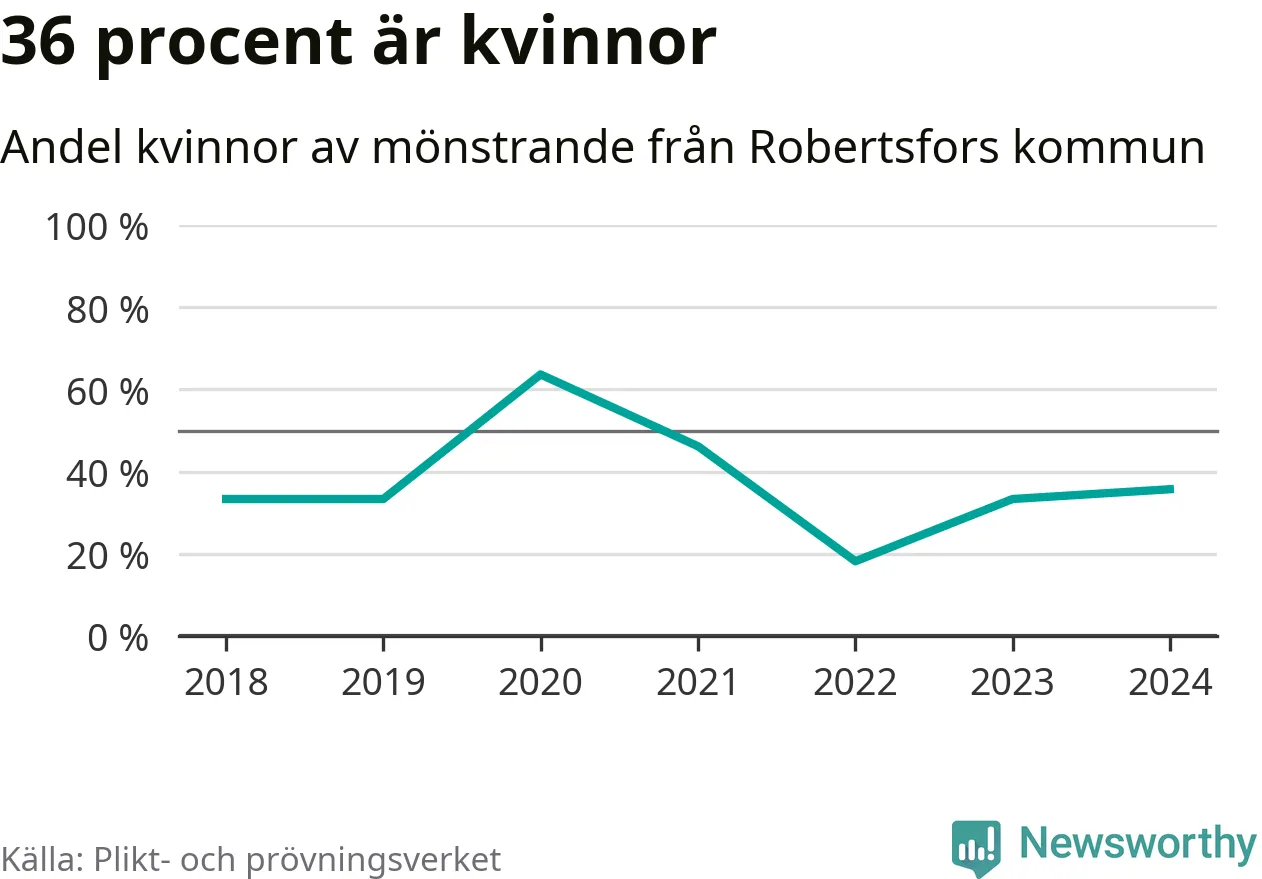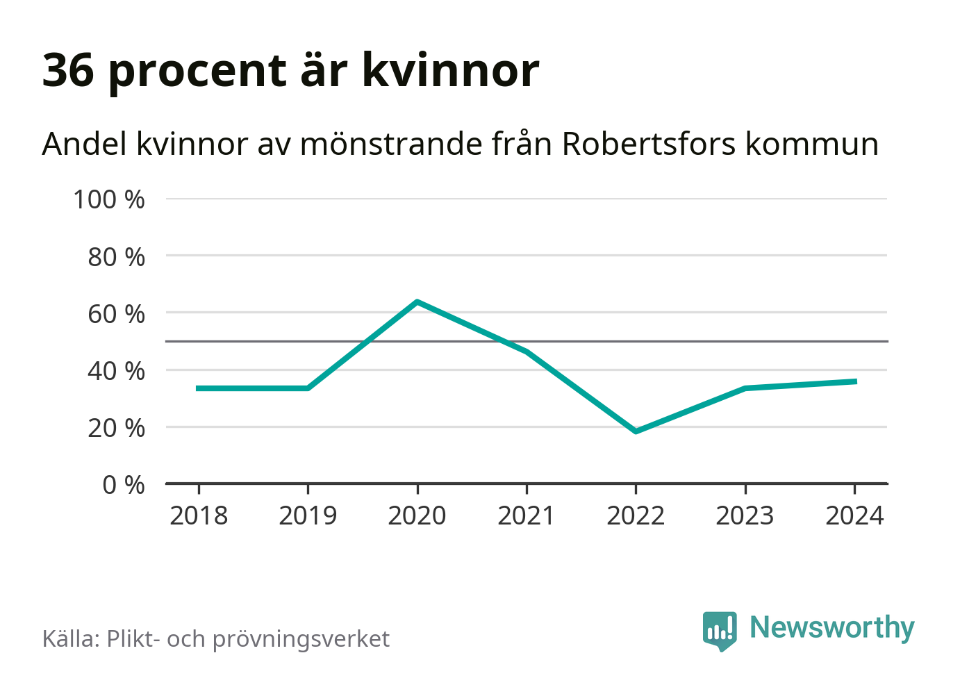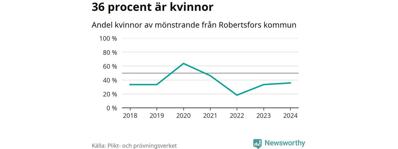 Tio av de som kallats till mönstring från Robertsfors är kvinnor, vilket motsvarar 36 procent av de mönstrande. I absoluta tal är det fler kvinnor än något år sedan värnplikten återinfördes, men 2020 var en större andel av de mönstrande från kommunen kvinnor (64 procent). I riket som helhet är 30 procent av de mönstrande tjejer.