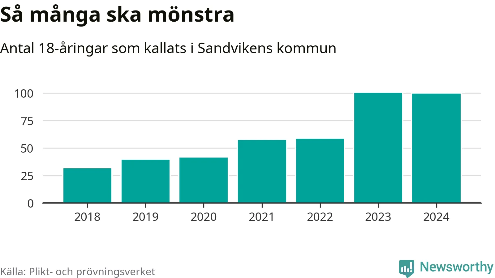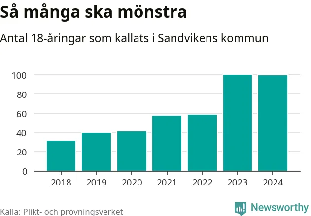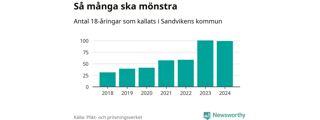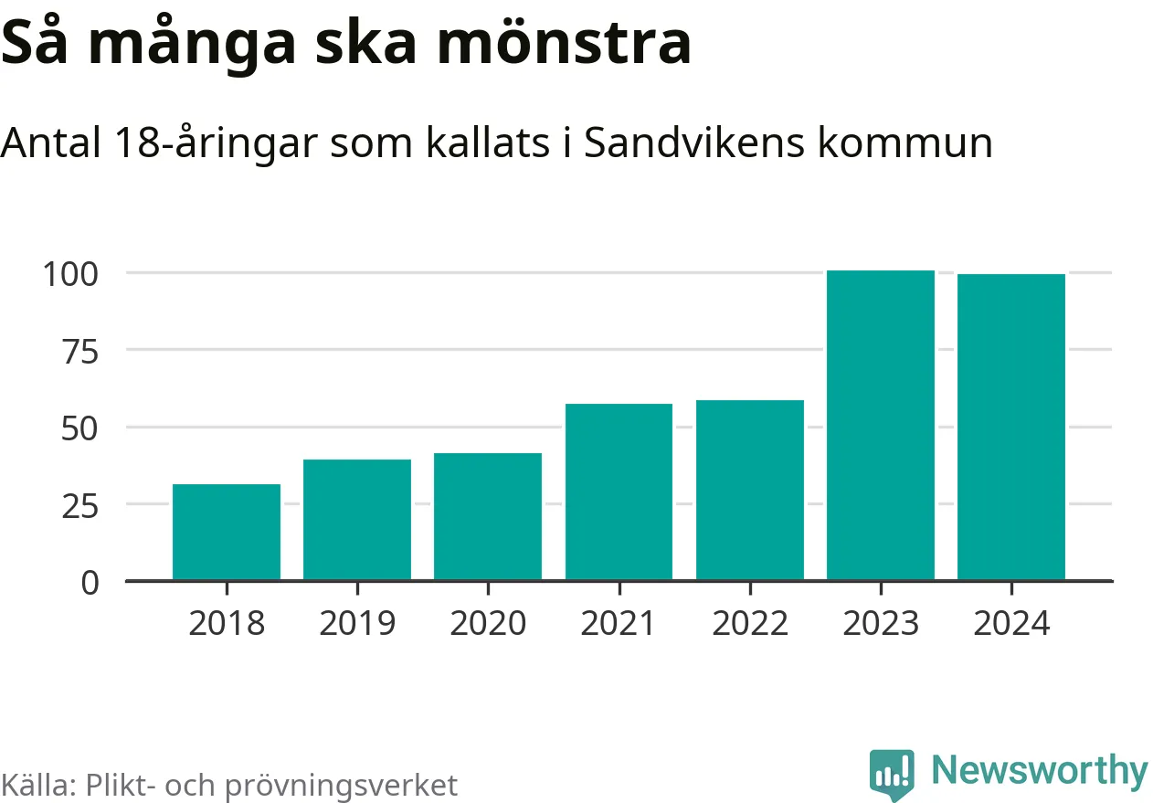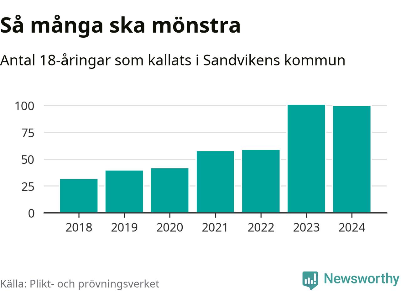 Nu kallas 27 900 svenskar födda 2006 till mönstring. Och 100 av dem kommer från Sandviken, enligt ny statistik från Plikt- och prövningsverket. Det innebär att var femte invånare i åldersgruppen i kommunen kallas till mönstring. Det är ungefär lika stor andel som i Gävleborg totalt. I riket som helhet kallas nästan var fjärde person i årskullen.