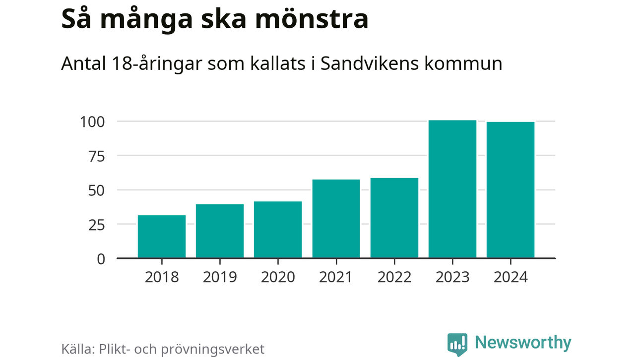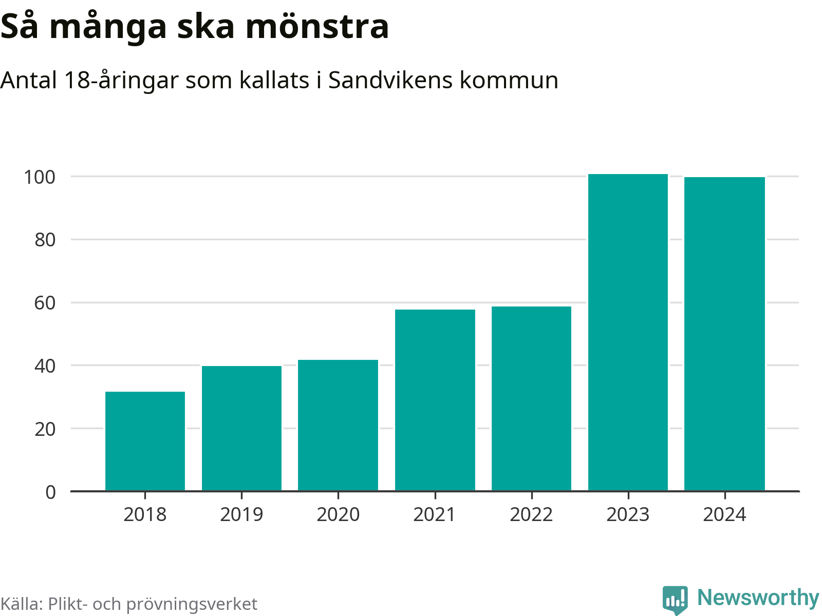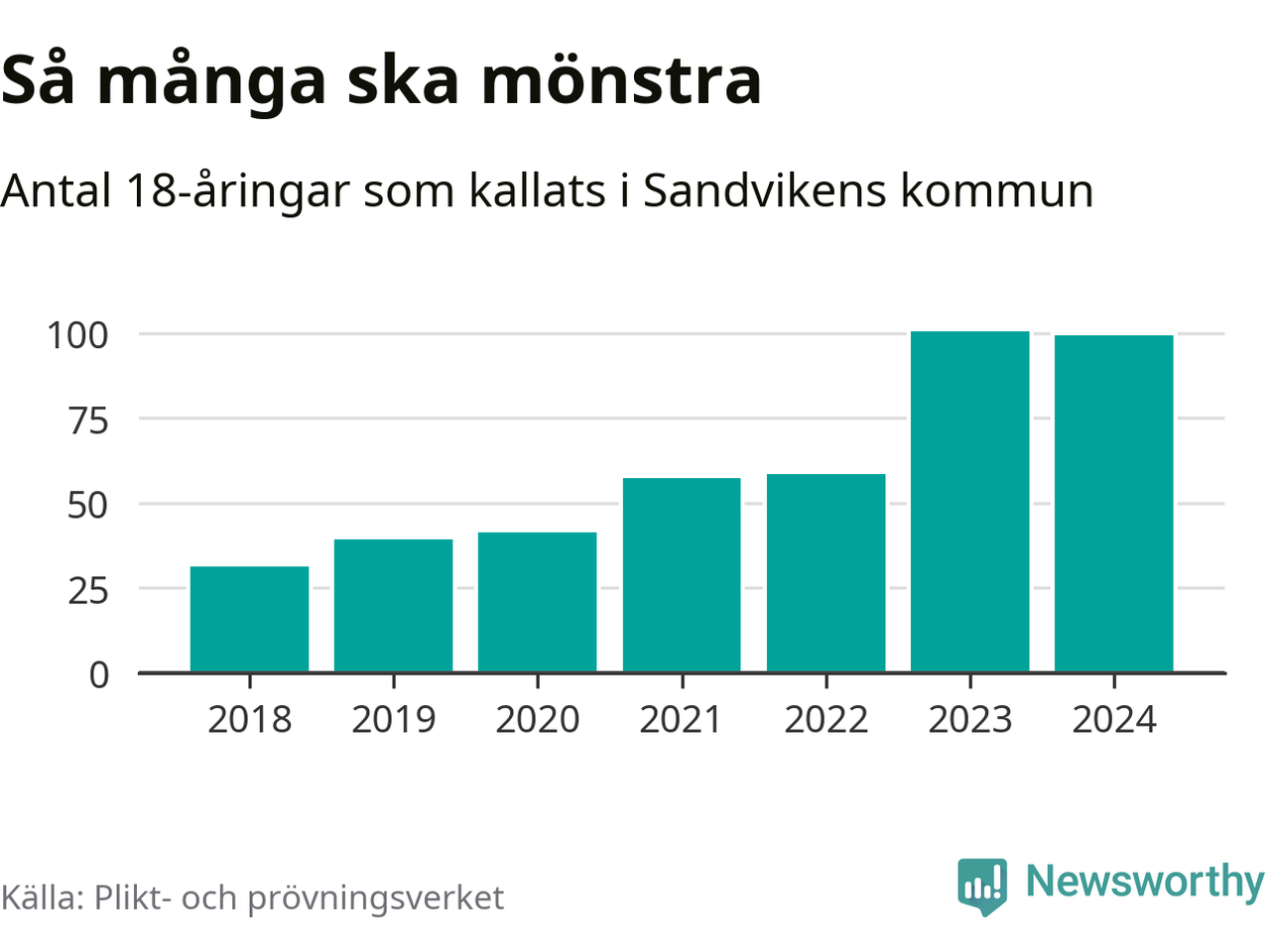 Nu kallas 27 900 svenskar födda 2006 till mönstring. Och 100 av dem kommer från Sandviken, enligt ny statistik från Plikt- och prövningsverket. Det innebär att var femte invånare i åldersgruppen i kommunen kallas till mönstring. Det är ungefär lika stor andel som i Gävleborg totalt. I riket som helhet kallas nästan var fjärde person i årskullen.