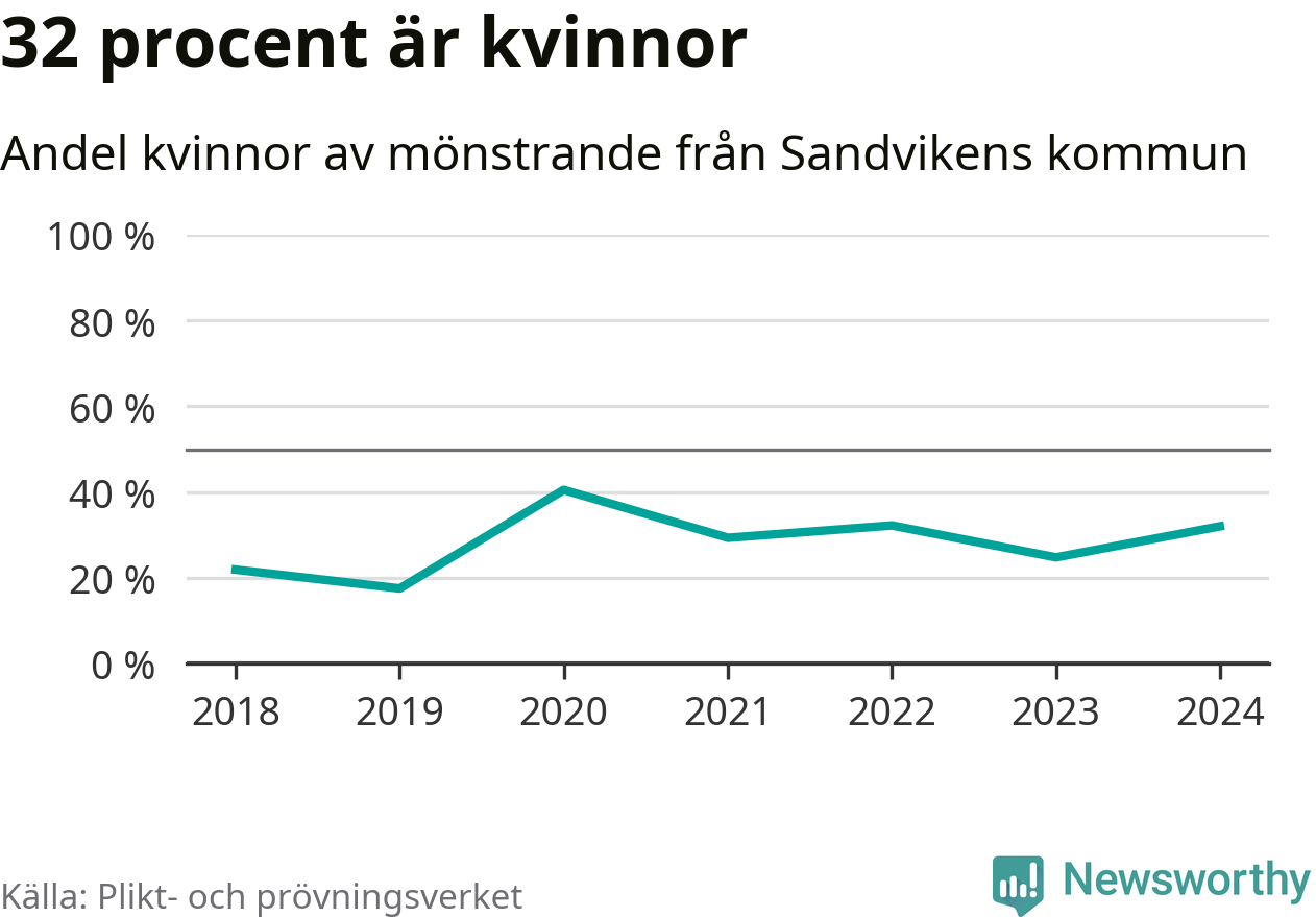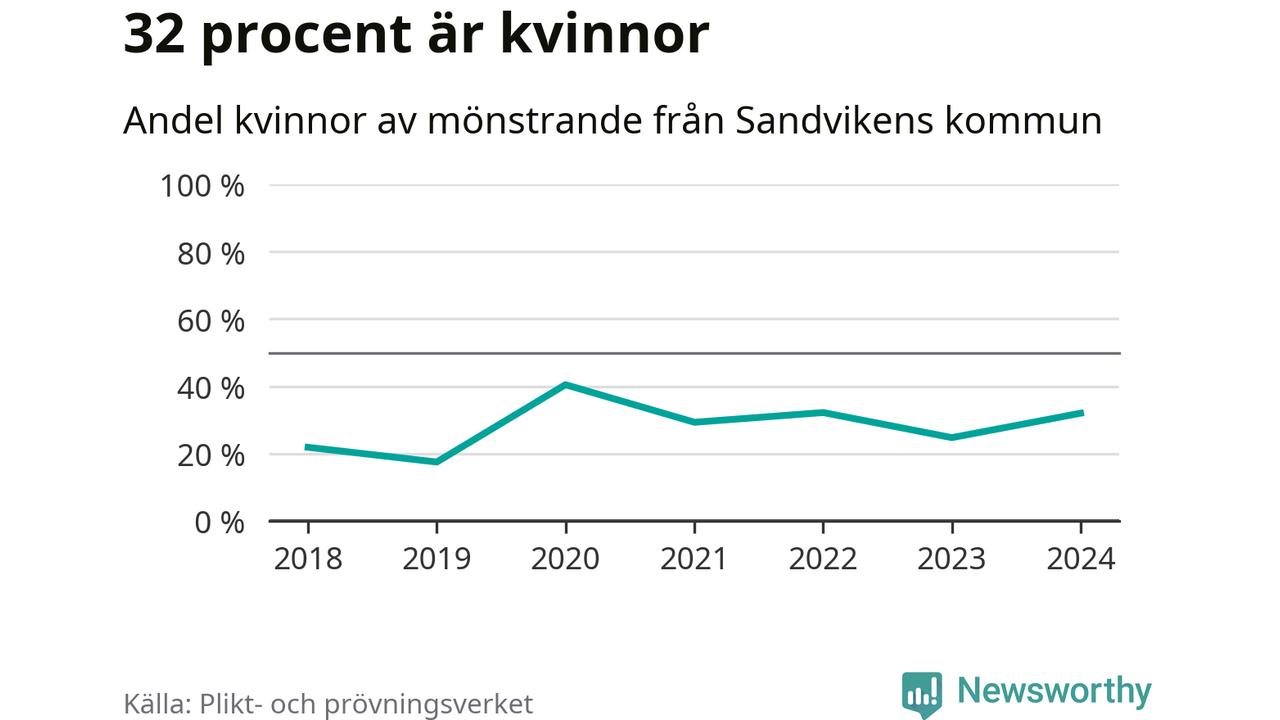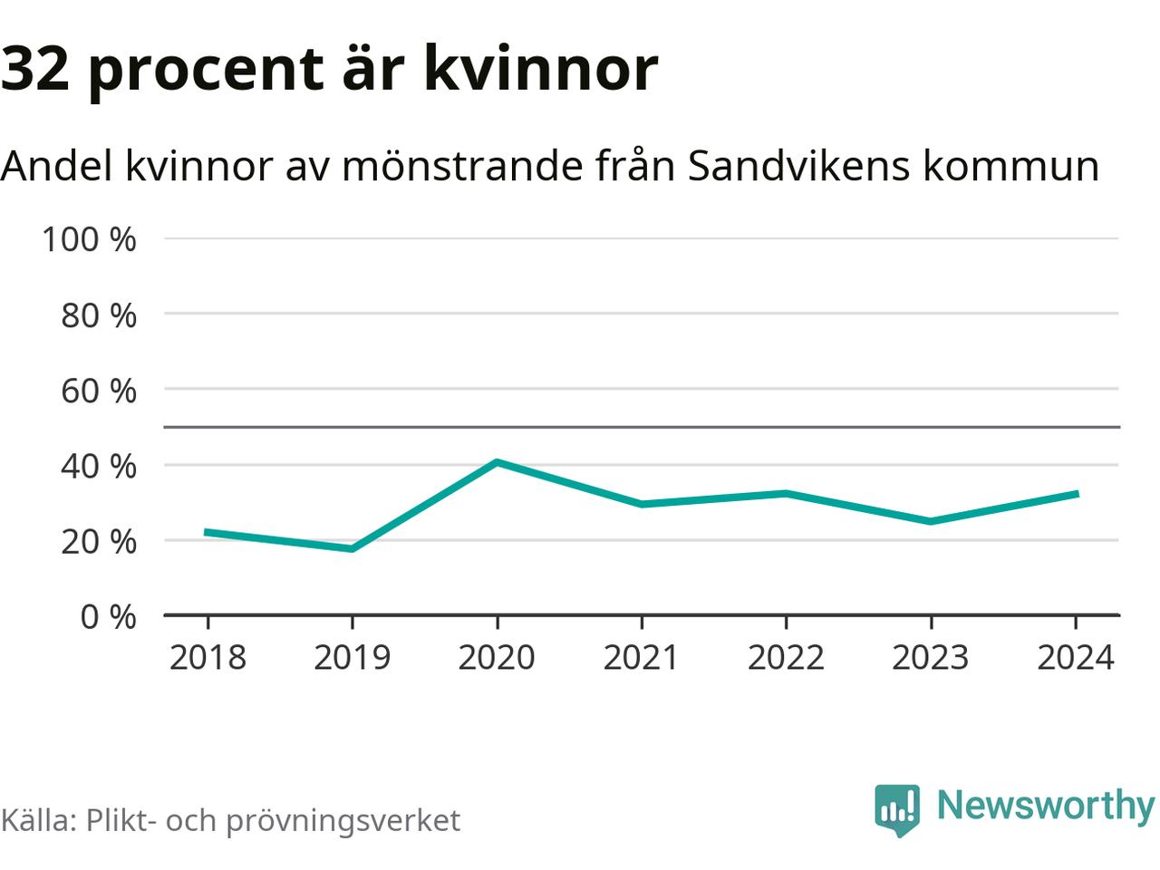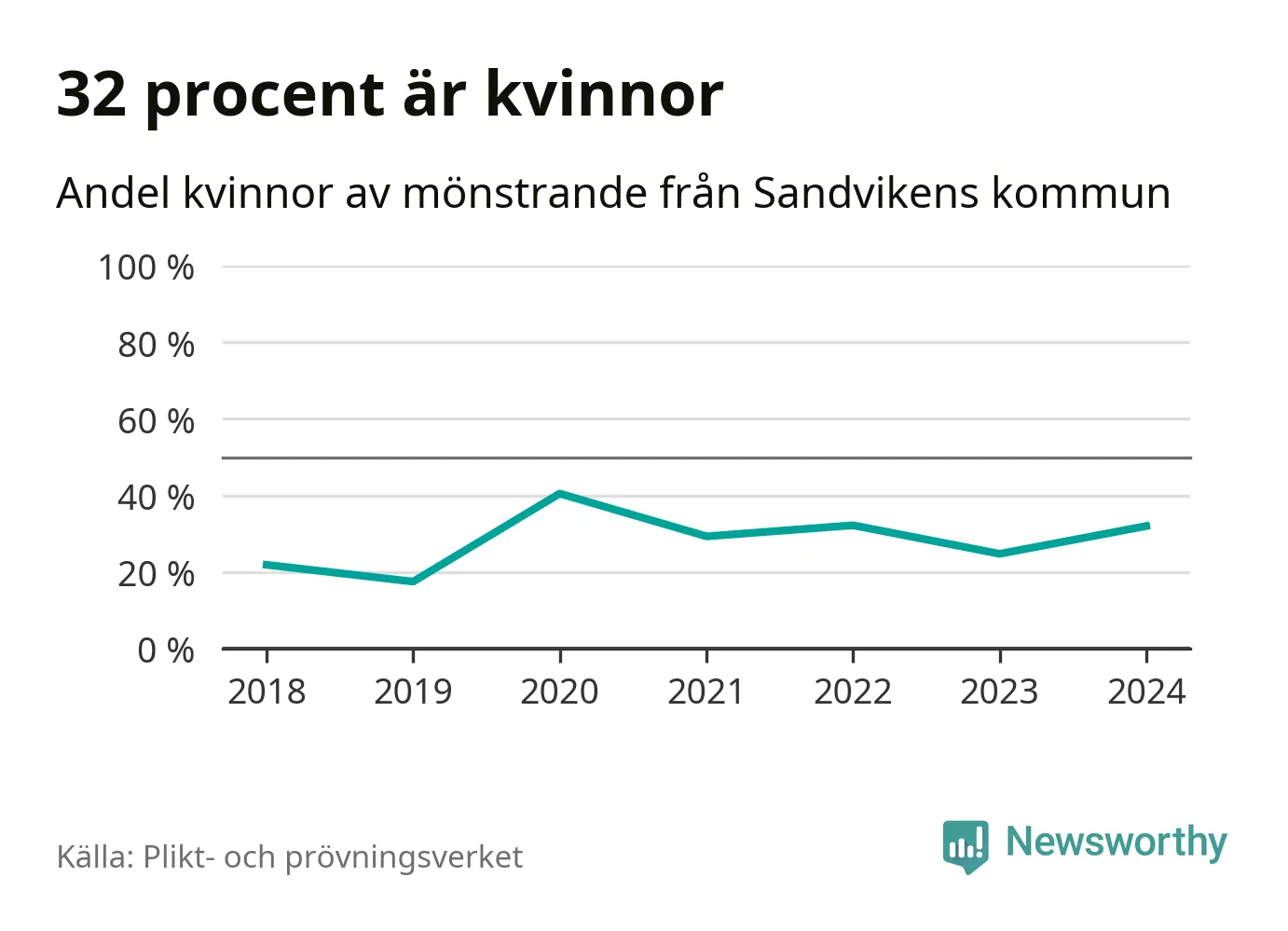 32 av de som kallats till mönstring från Sandviken är kvinnor, vilket motsvarar 32 procent av de mönstrande. I absoluta tal är det fler kvinnor än något år sedan värnplikten återinfördes, men 2020 var en större andel av de mönstrande från kommunen kvinnor (40 procent). I riket som helhet är 30 procent av de mönstrande tjejer.