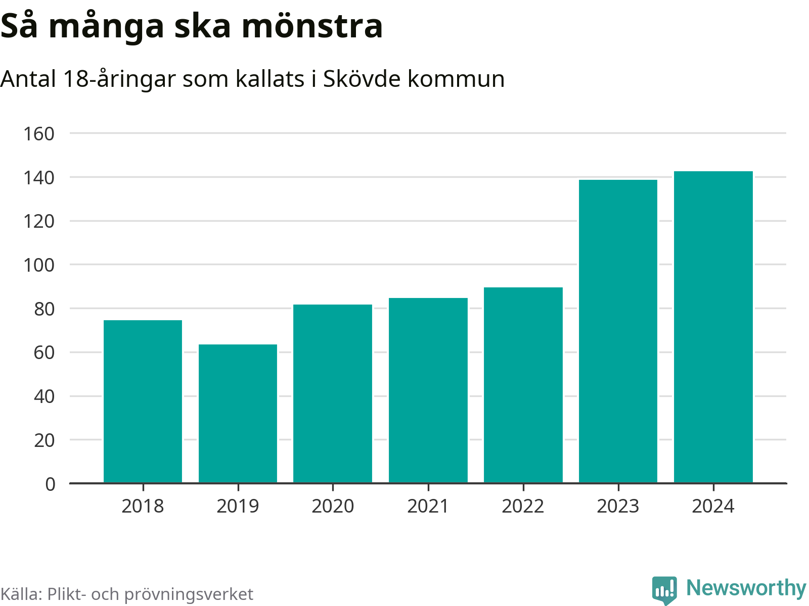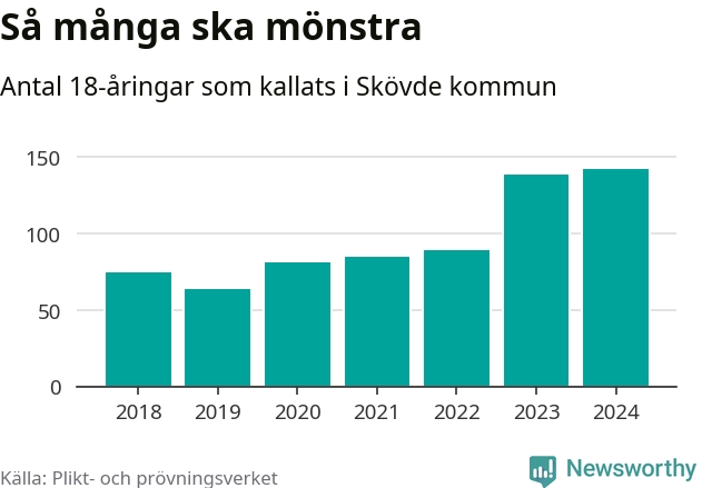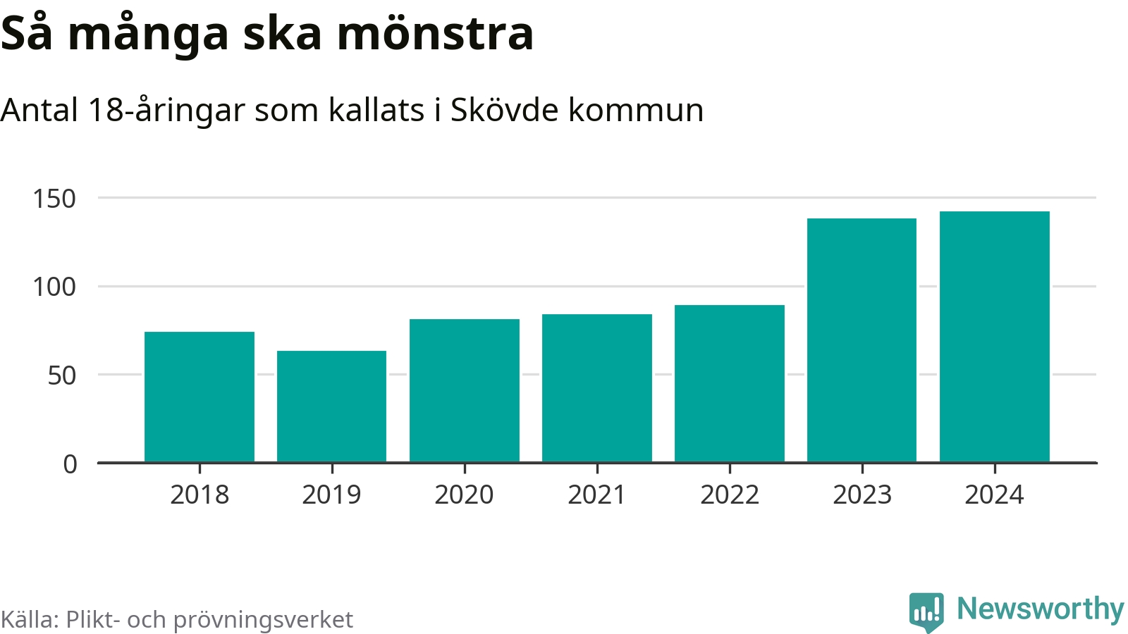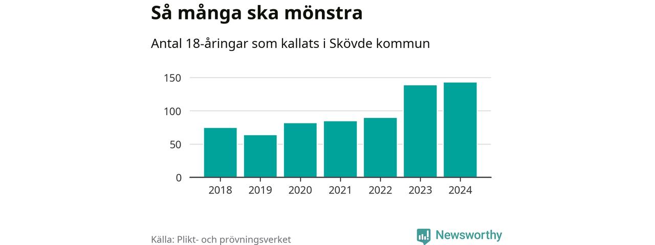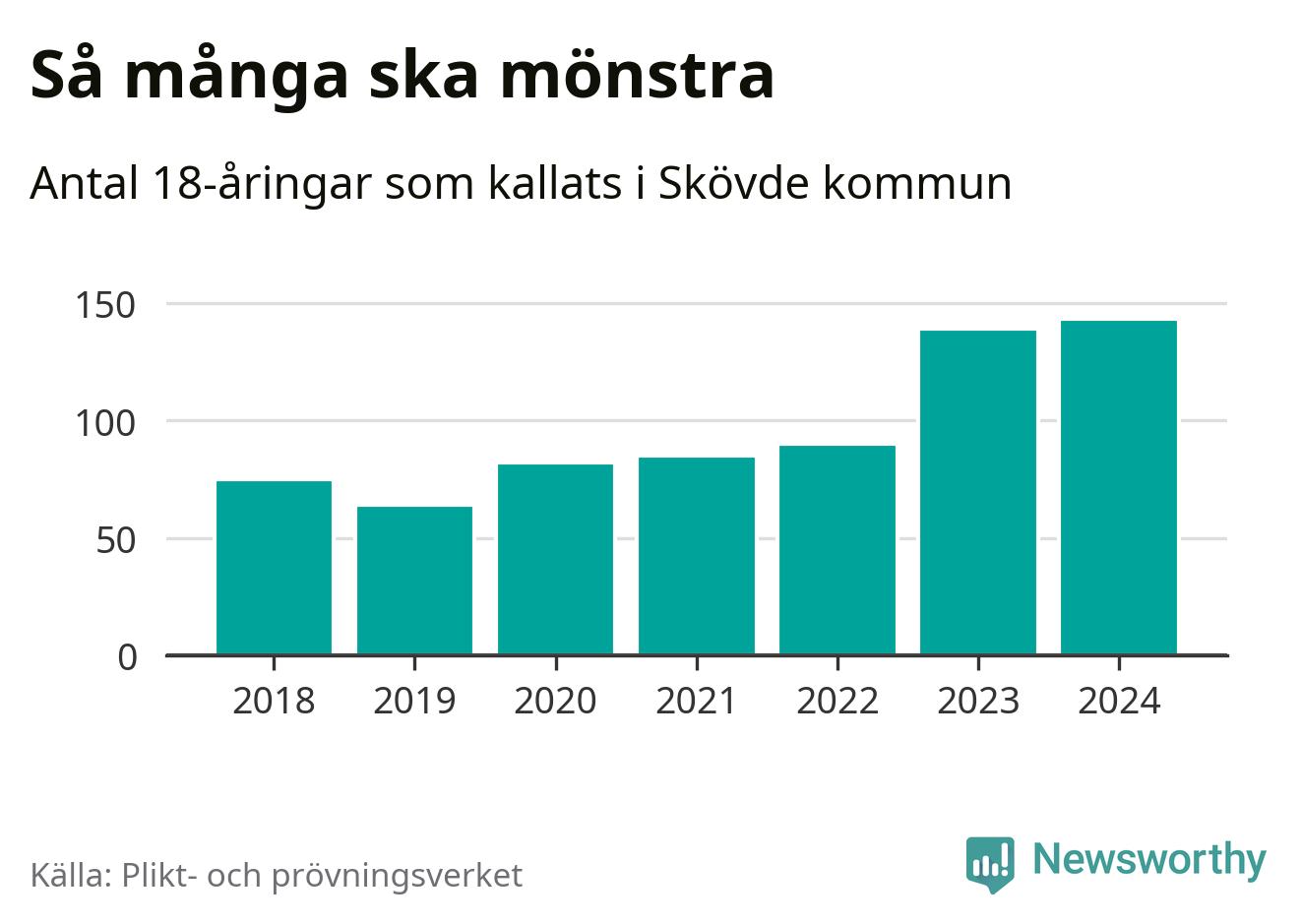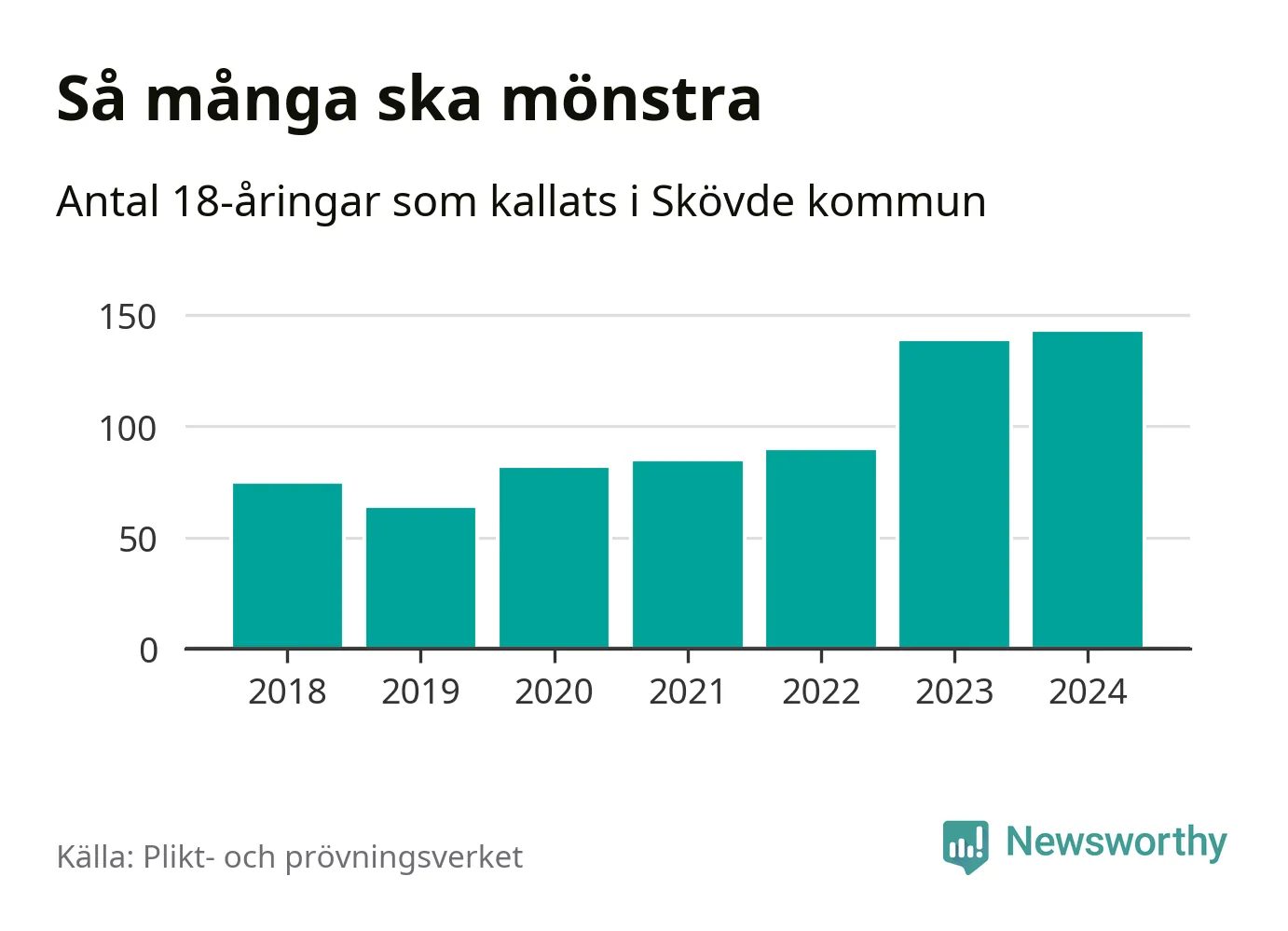 143 personer är det högsta antalet kallade i Skövde sedan 2018, som är första året med statistik på kommunnivå (värnplikten återinfördes 2017), och fyra mönstrande mer än 2023. 2018 kallades som jämförelse 75 artonåringar från Skövde till mönstring. Det motsvarade ungefär 13 procent av årskullen född år 2000. Totalt från Västra Götalands län kallas 4 562 personer födda 2006 i år.
