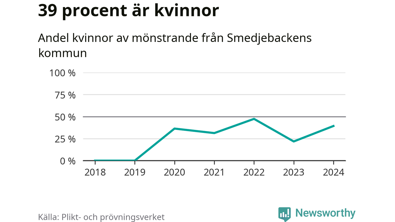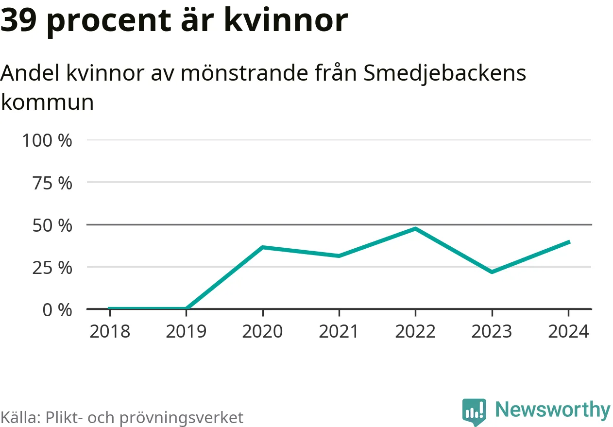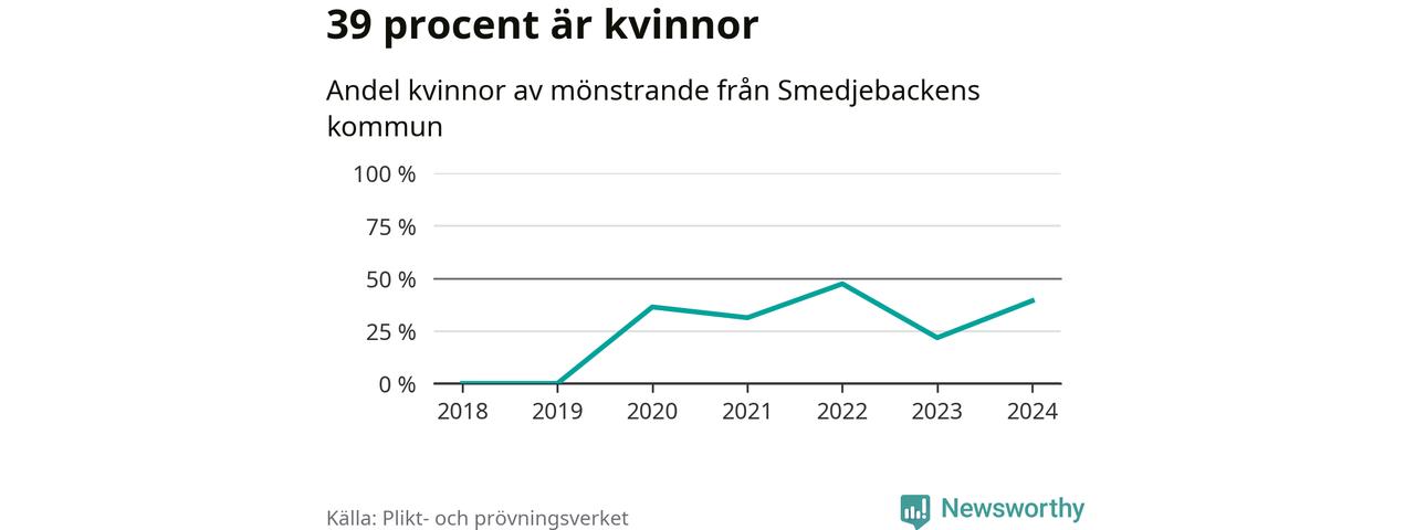 Elva av de som kallats till mönstring från Smedjebacken är kvinnor, vilket motsvarar 39 procent av de mönstrande. I absoluta tal är det fler kvinnor än något år sedan värnplikten återinfördes, men 2022 var en större andel av de mönstrande från kommunen kvinnor (47 procent). I riket som helhet är 30 procent av de mönstrande tjejer.