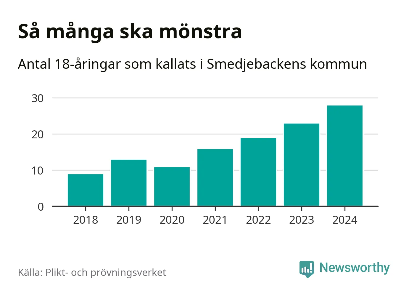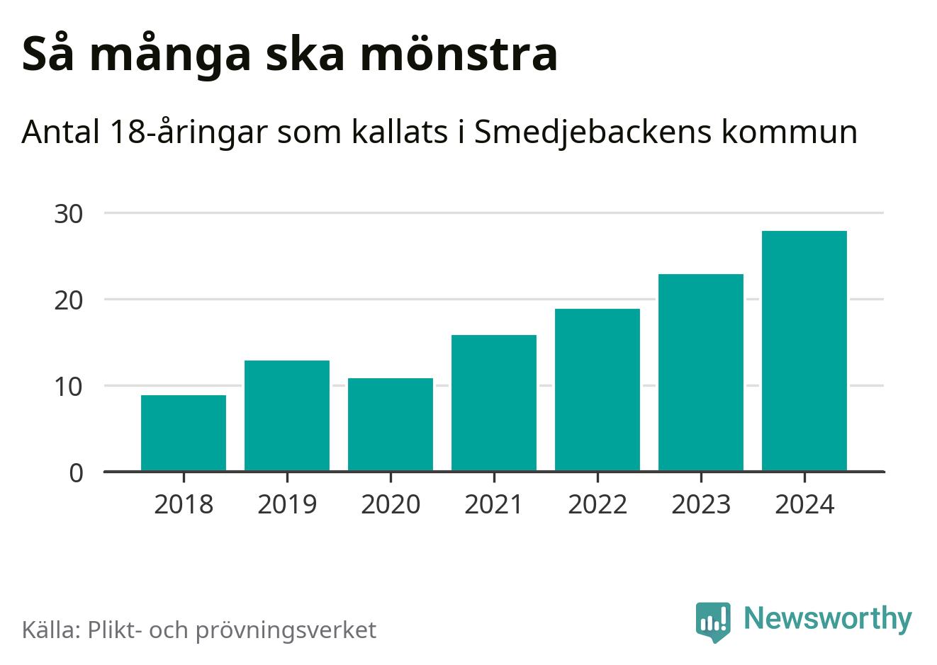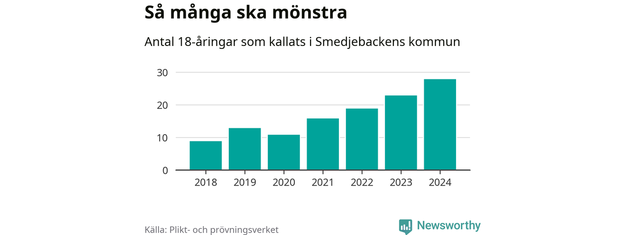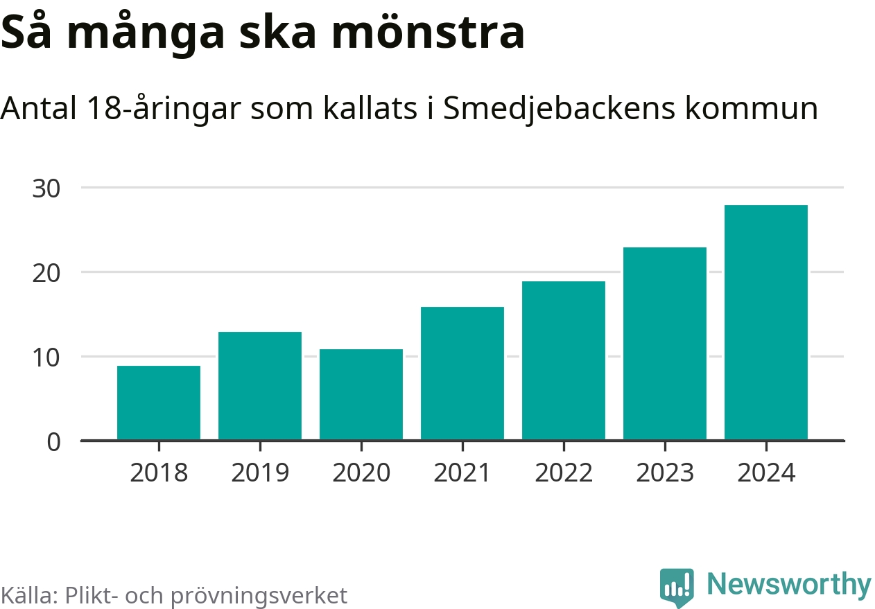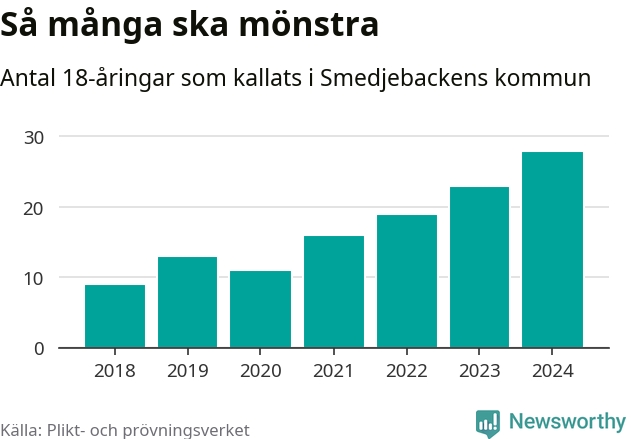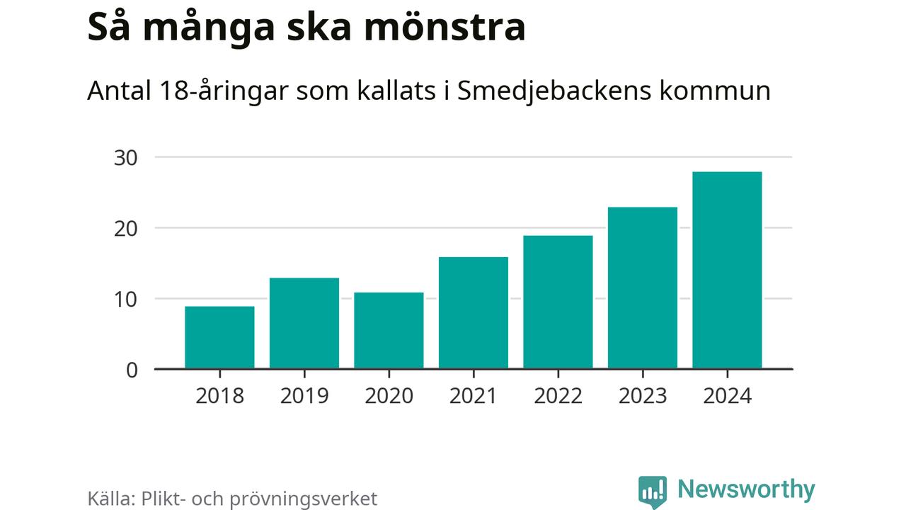 28 personer är det högsta antalet kallade i Smedjebacken sedan 2018, som är första året med statistik på kommunnivå (värnplikten återinfördes 2017), och fem mönstrande mer än 2023. 2018 kallades som jämförelse nio 18-åringar från Smedjebacken till mönstring. Det motsvarade ungefär 9 procent av årskullen född år 2000. Totalt från Dalarnas län kallas 729 personer födda 2006 i år.