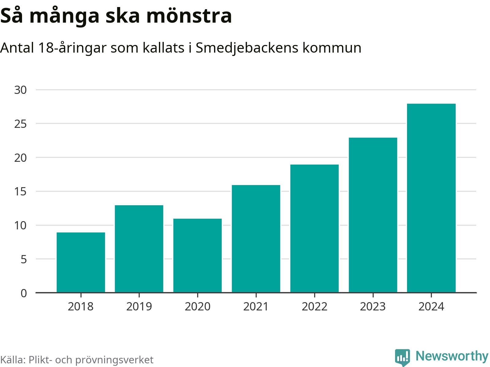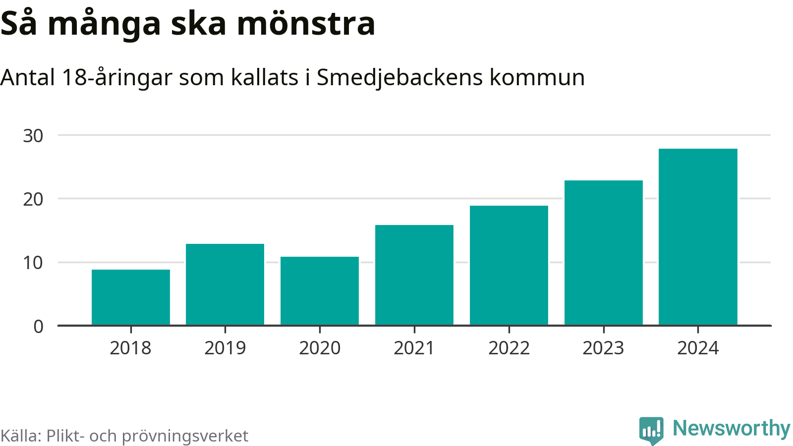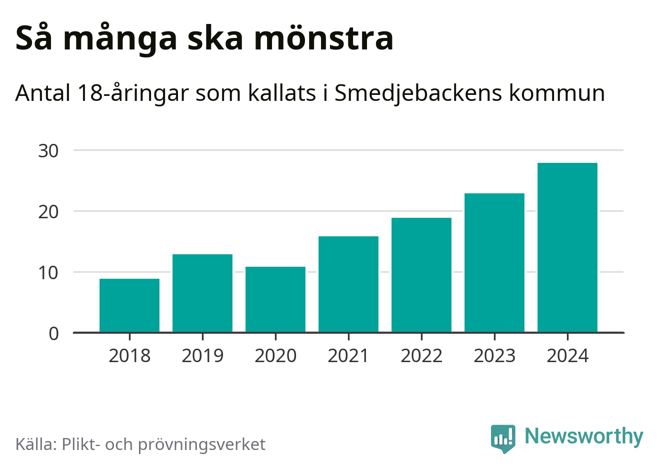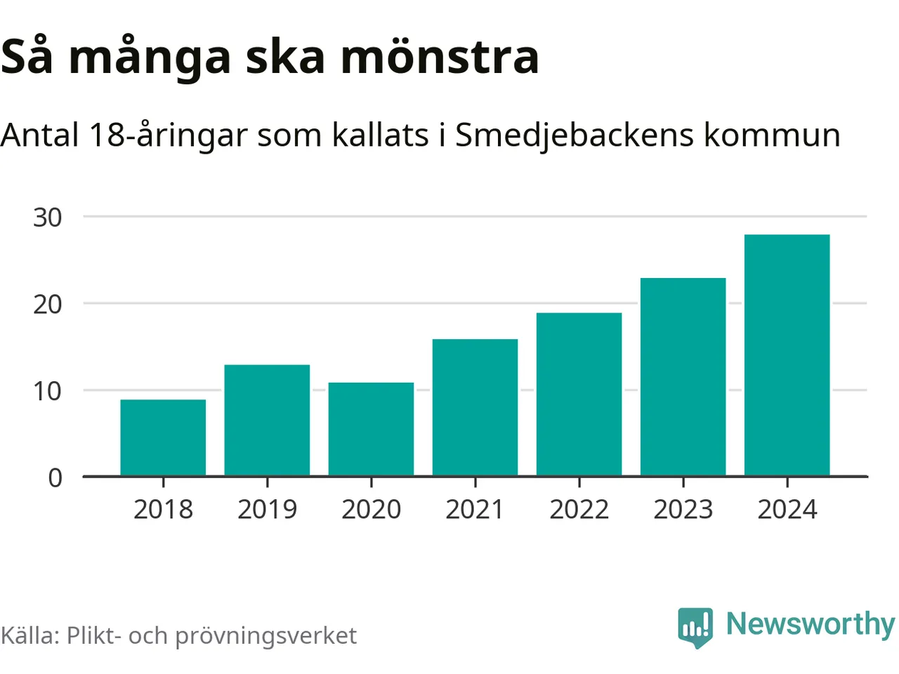 28 personer är det högsta antalet kallade i Smedjebacken sedan 2018, som är första året med statistik på kommunnivå (värnplikten återinfördes 2017), och fem mönstrande mer än 2023. 2018 kallades som jämförelse nio 18-åringar från Smedjebacken till mönstring. Det motsvarade ungefär 9 procent av årskullen född år 2000. Totalt från Dalarnas län kallas 729 personer födda 2006 i år.