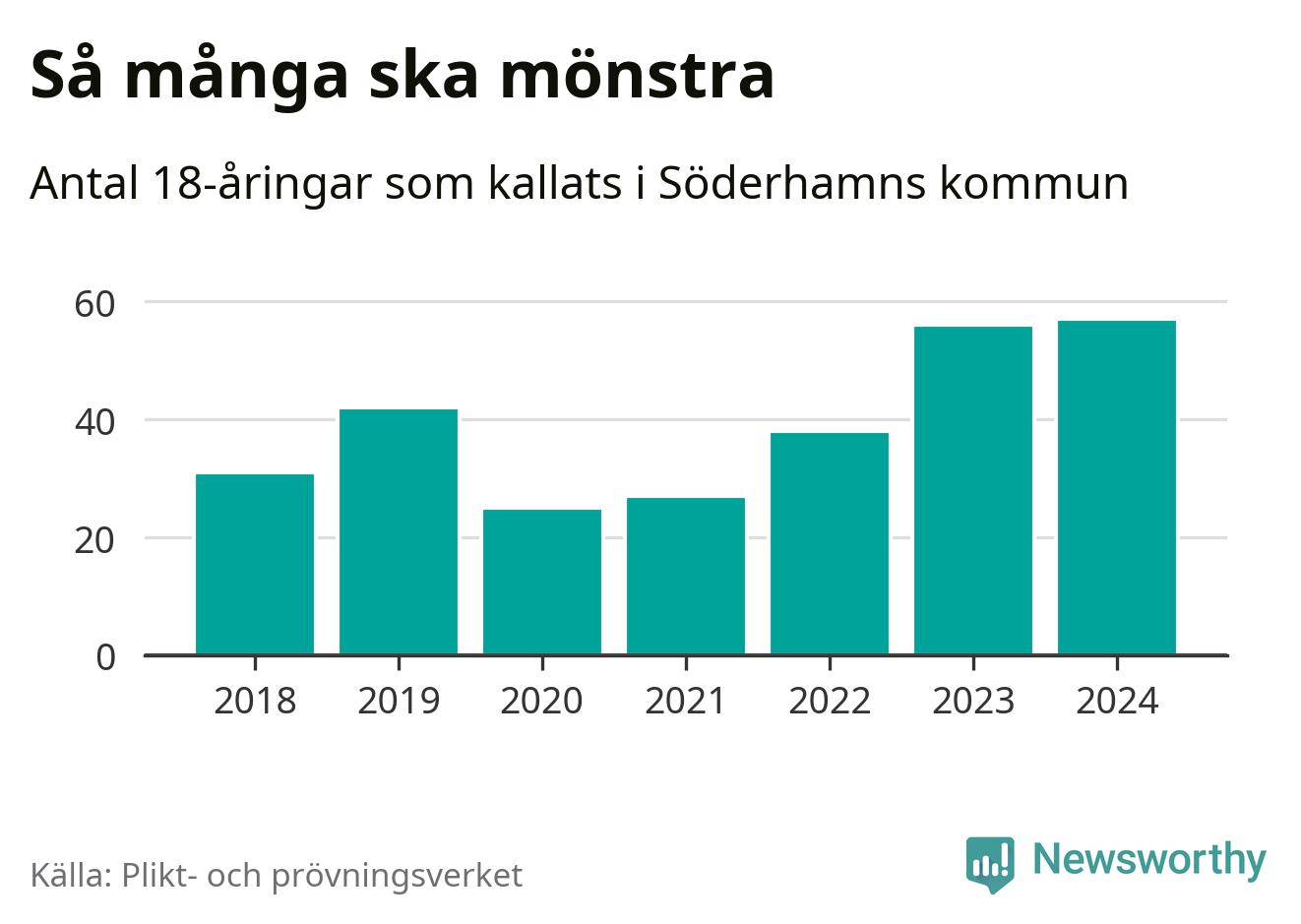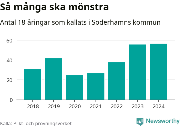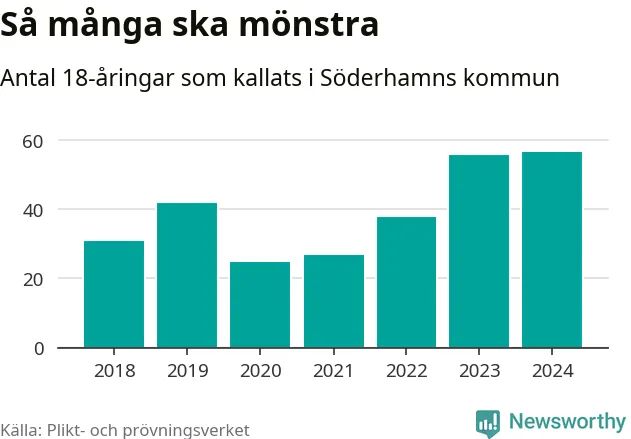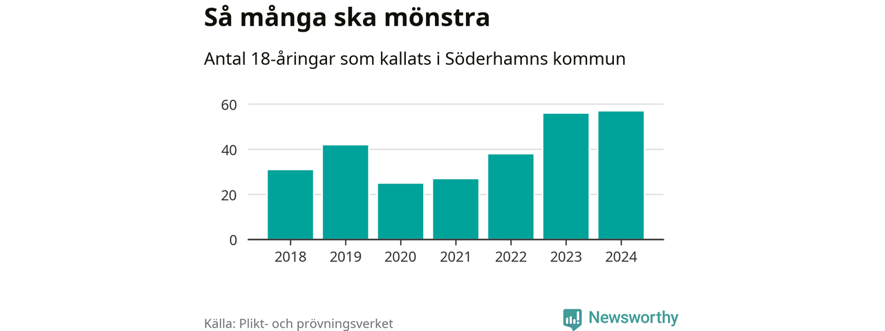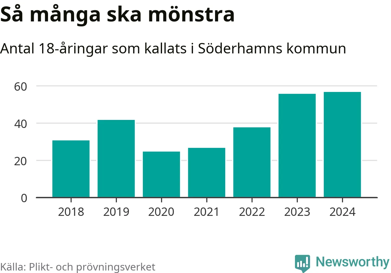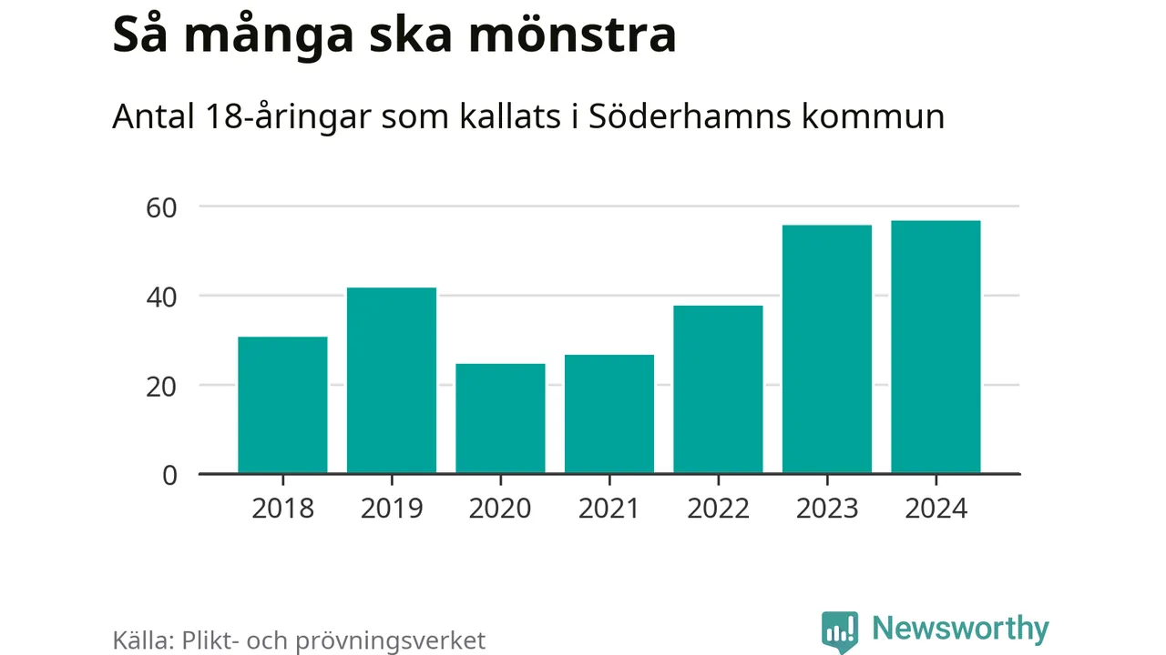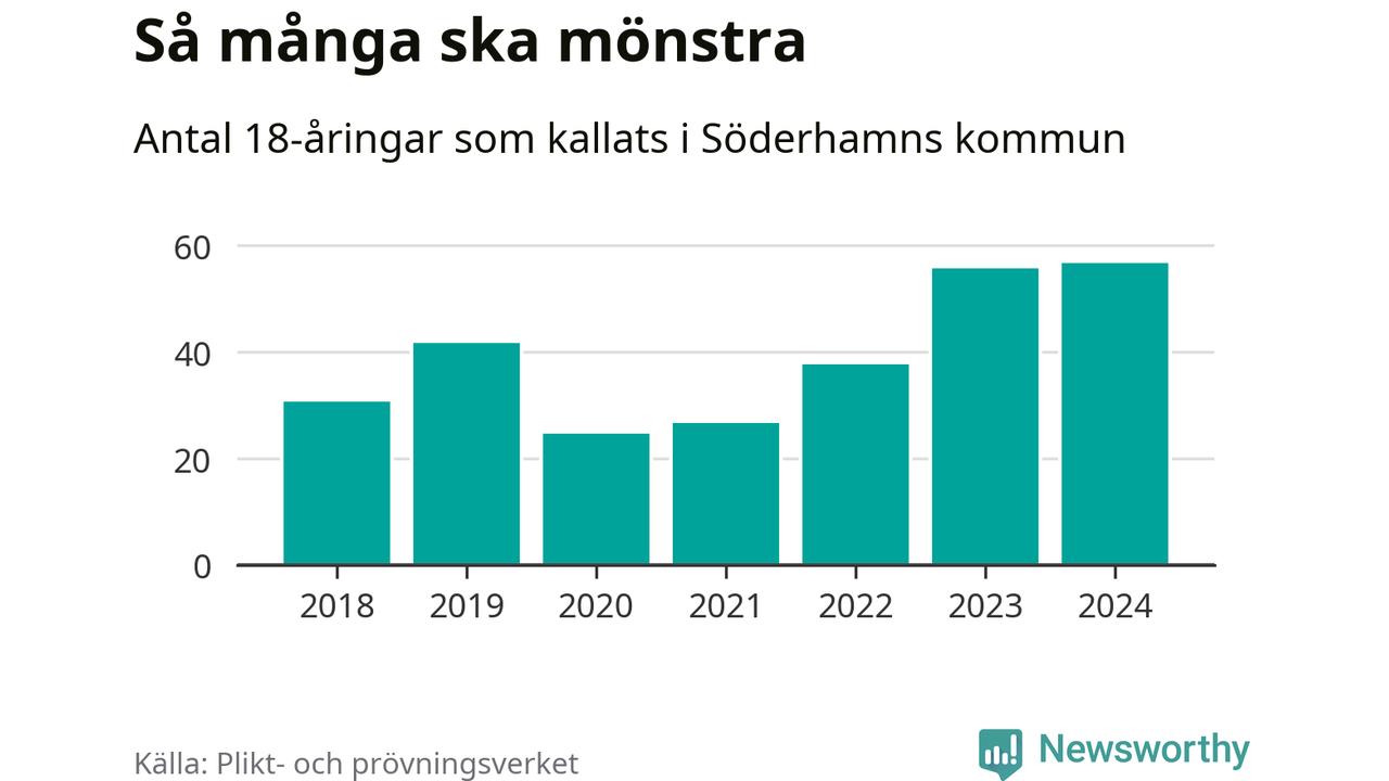 57 personer är det högsta antalet kallade i Söderhamn sedan 2018, som är första året med statistik på kommunnivå (värnplikten återinfördes 2017), och en mönstrande mer än 2023. 2018 kallades som jämförelse 31 artonåringar från Söderhamn till mönstring. Det motsvarade ungefär 11 procent av årskullen född år 2000. Totalt från Gävleborgs län kallas 715 personer födda 2006 i år.