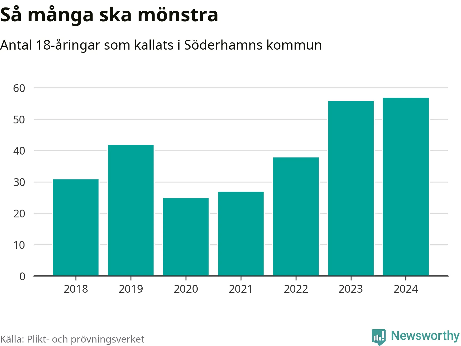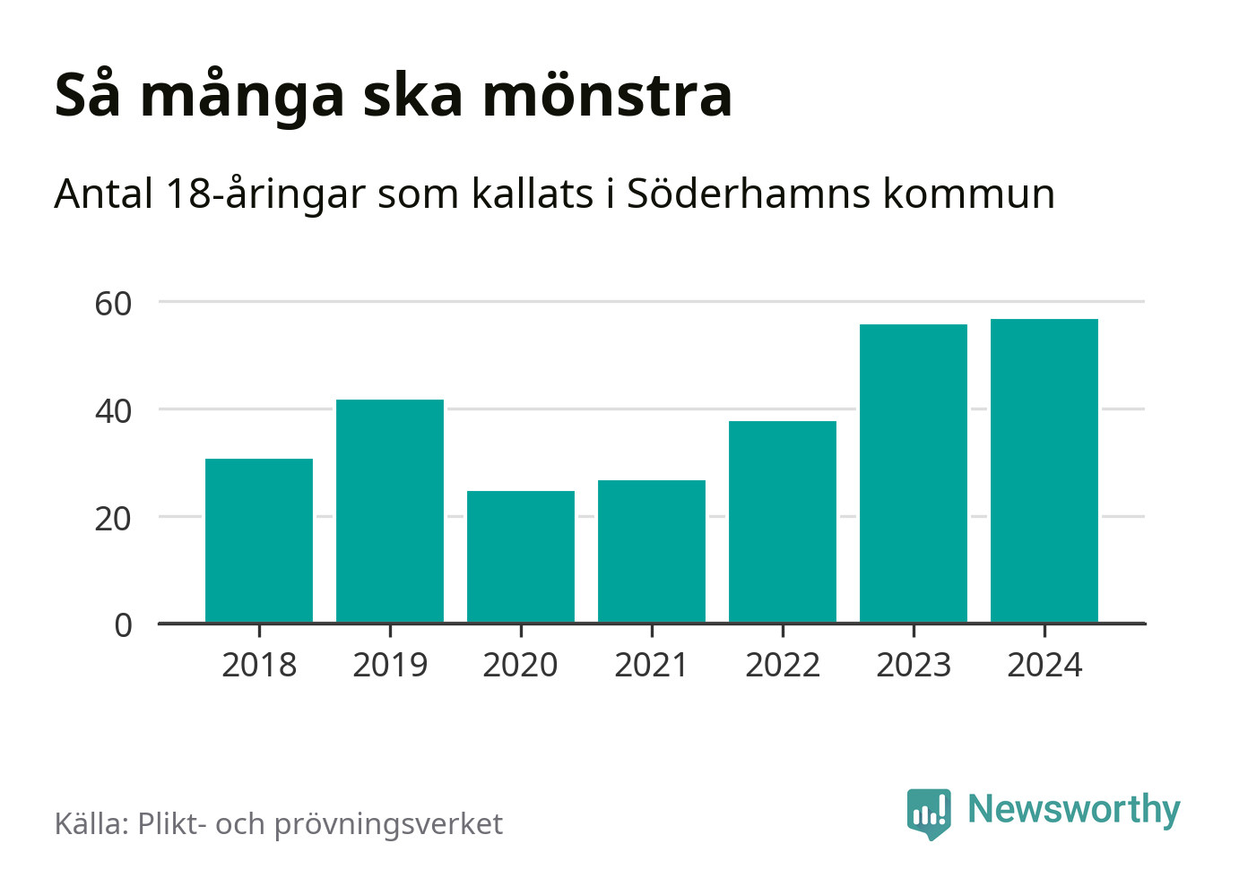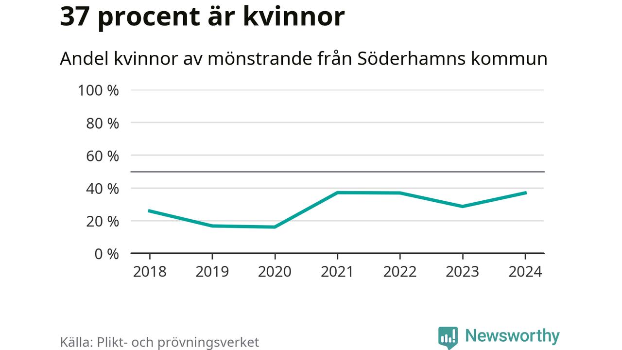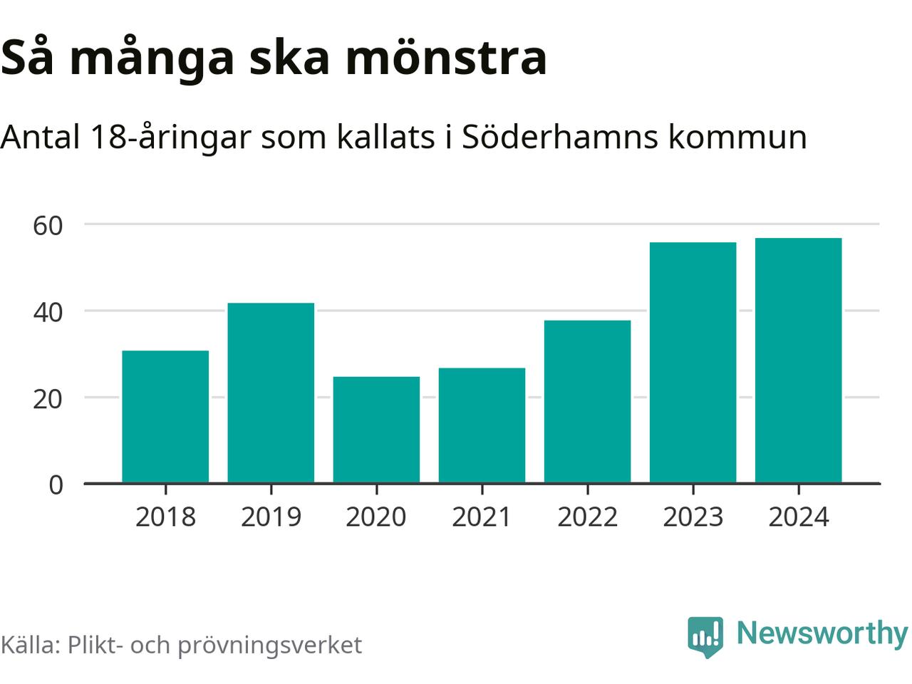 57 personer är det högsta antalet kallade i Söderhamn sedan 2018, som är första året med statistik på kommunnivå (värnplikten återinfördes 2017), och en mönstrande mer än 2023. 2018 kallades som jämförelse 31 artonåringar från Söderhamn till mönstring. Det motsvarade ungefär 11 procent av årskullen född år 2000. Totalt från Gävleborgs län kallas 715 personer födda 2006 i år.