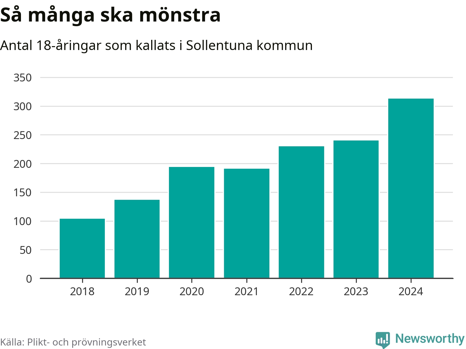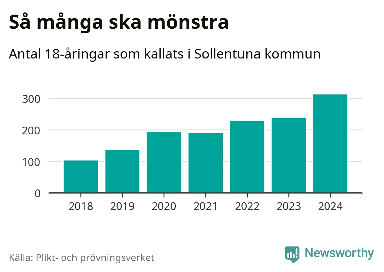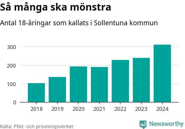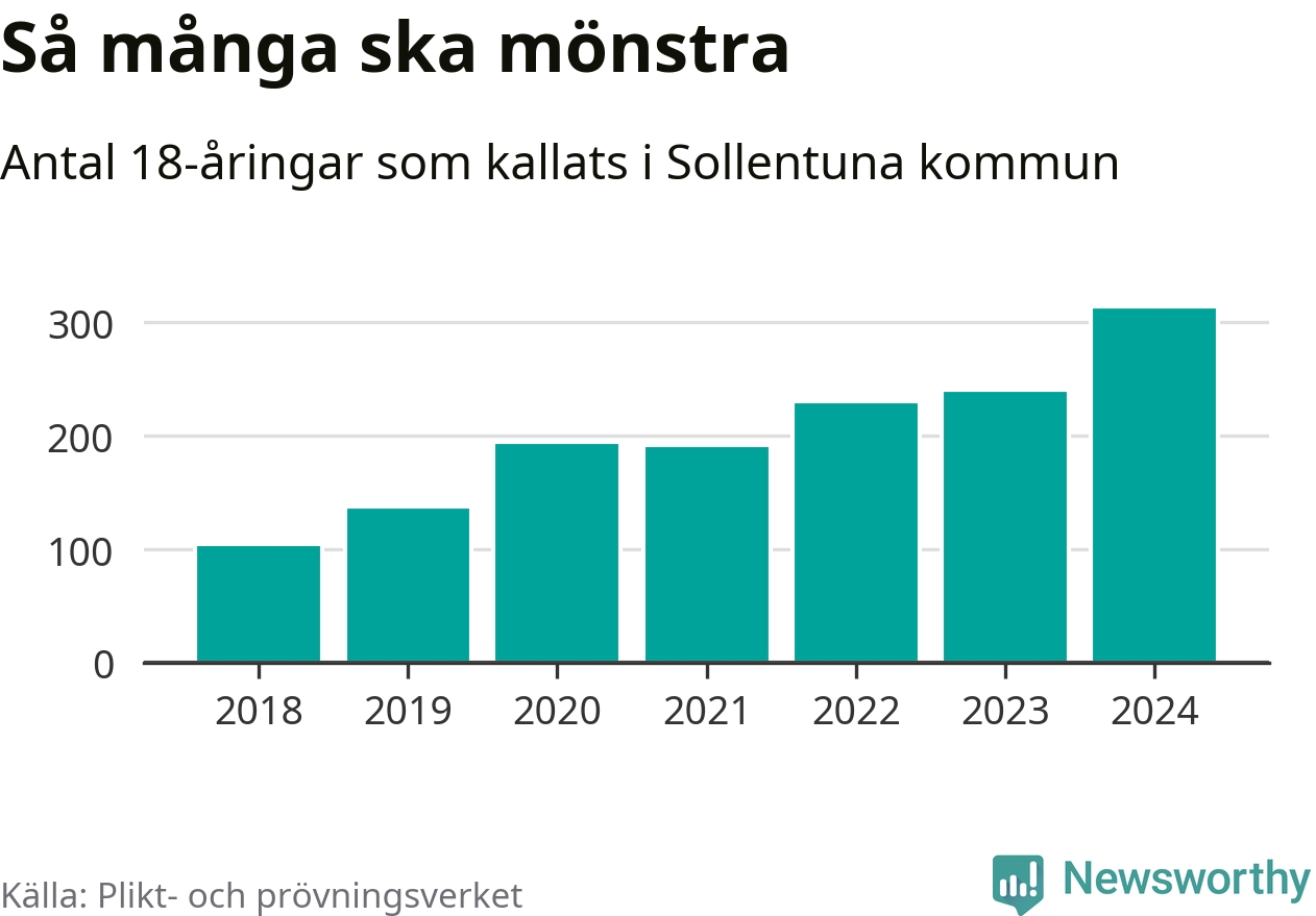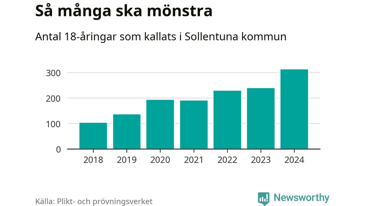 314 personer är det högsta antalet kallade i Sollentuna sedan 2018, som är första året med statistik på kommunnivå (värnplikten återinfördes 2017), och 73 mönstrande mer än 2023. 2018 kallades som jämförelse 105 artonåringar från Sollentuna till mönstring. Det motsvarade ungefär 12 procent av årskullen född år 2000. Totalt från Stockholms län kallas 6 488 personer födda 2006 i år.