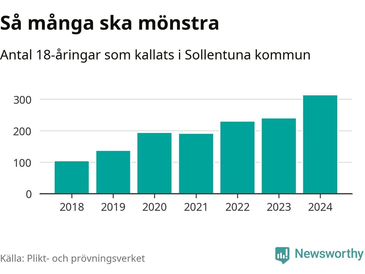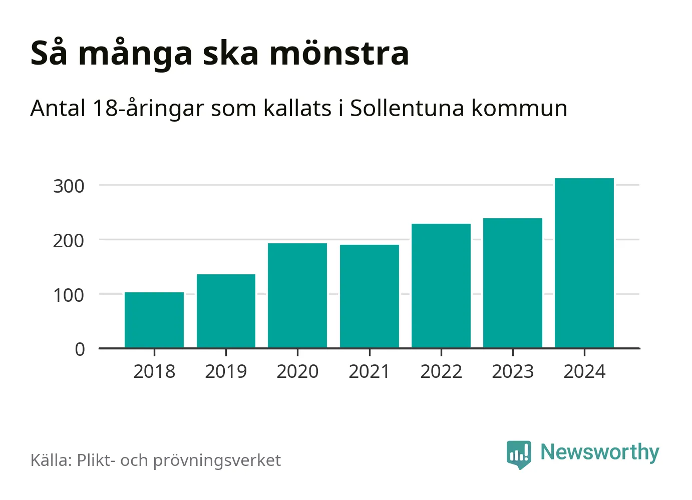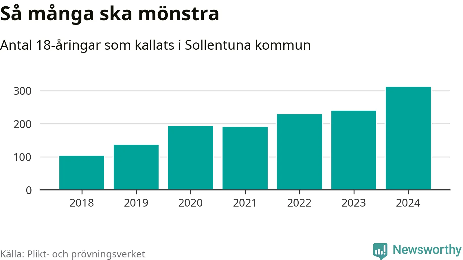 314 personer är det högsta antalet kallade i Sollentuna sedan 2018, som är första året med statistik på kommunnivå (värnplikten återinfördes 2017), och 73 mönstrande mer än 2023. 2018 kallades som jämförelse 105 artonåringar från Sollentuna till mönstring. Det motsvarade ungefär 12 procent av årskullen född år 2000. Totalt från Stockholms län kallas 6 488 personer födda 2006 i år.