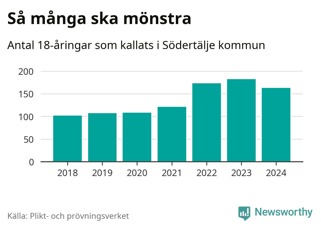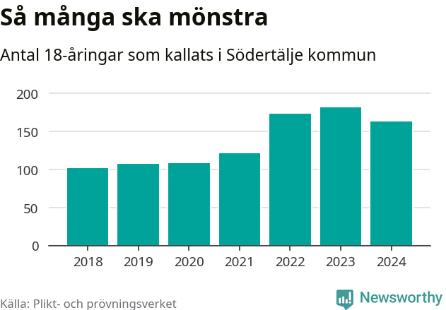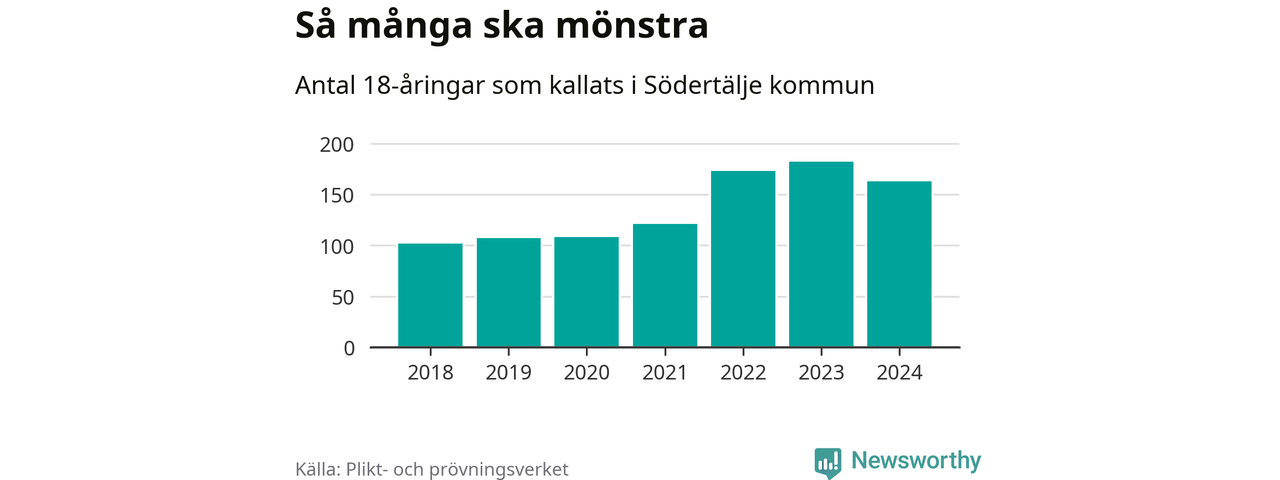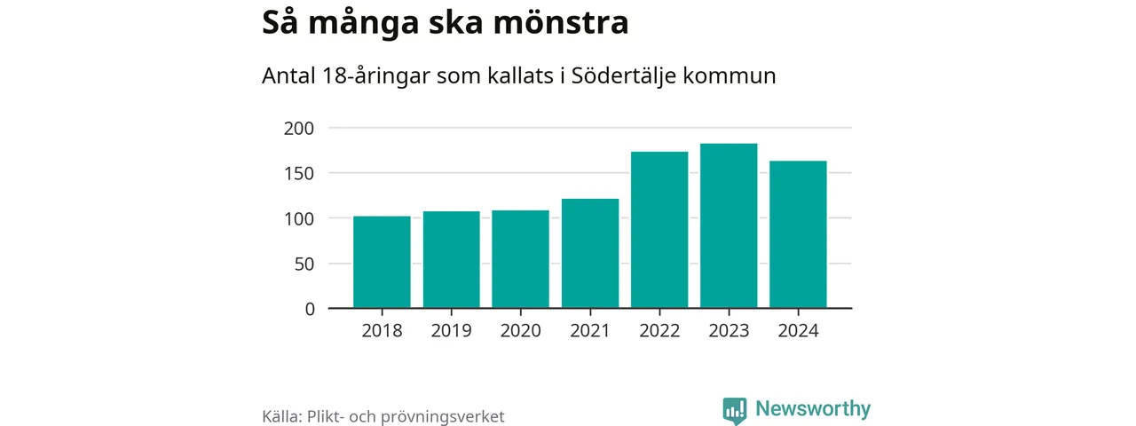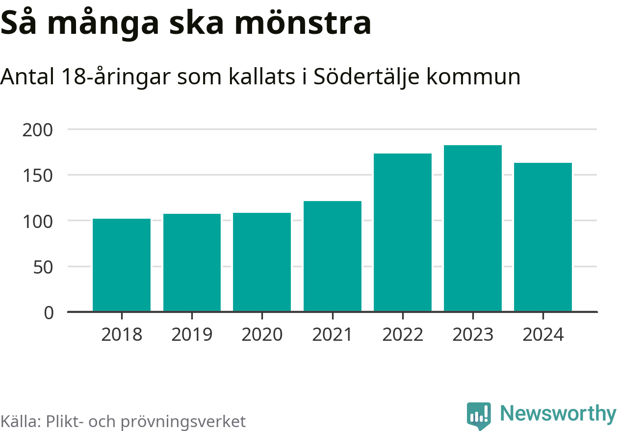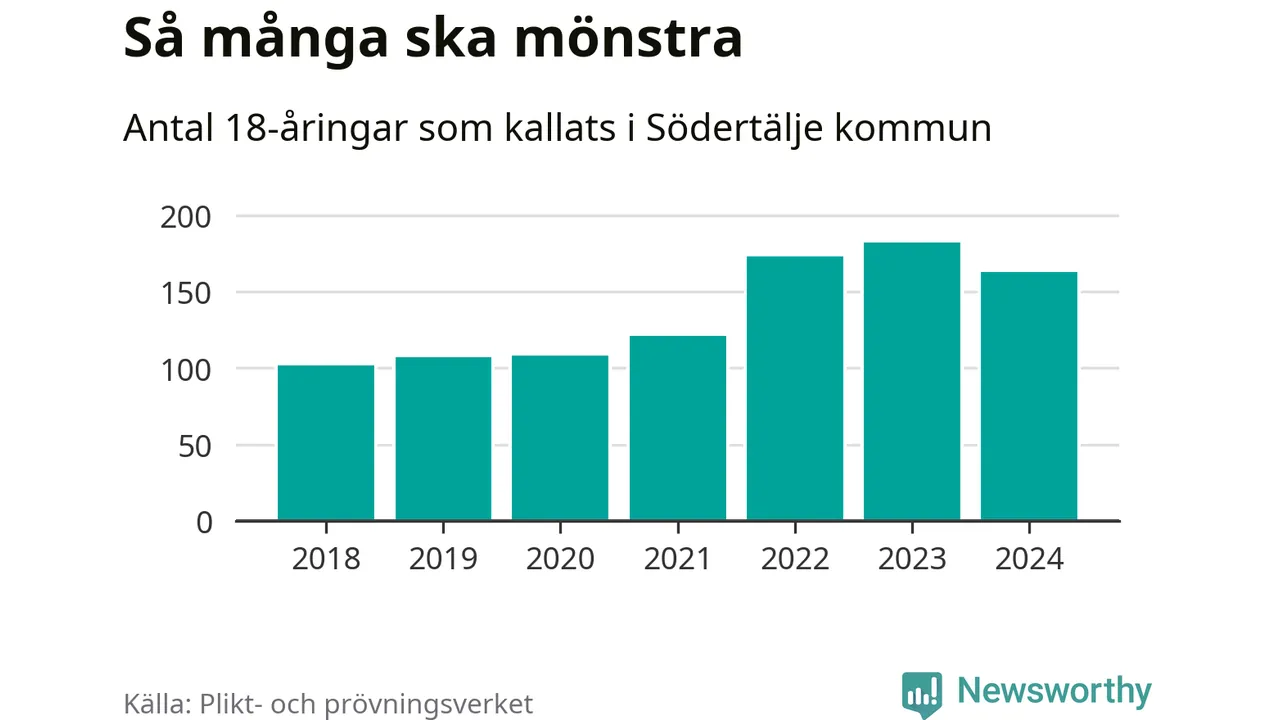 164 personer är 19 färre än 2023, men sett som andel av respektive åldersgrupp är skillnaden liten. 2018 kallades som jämförelse 103 artonåringar från Södertälje till mönstring. Det motsvarade ungefär 9 procent av årskullen född år 2000. Totalt från Stockholms län kallas 6 488 personer födda 2006 i år.