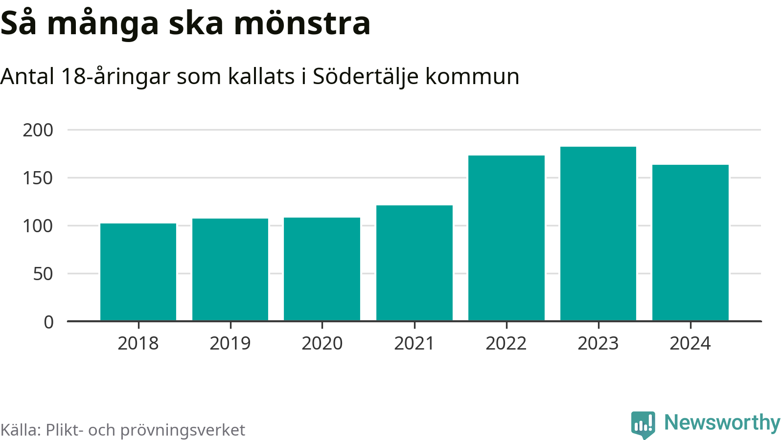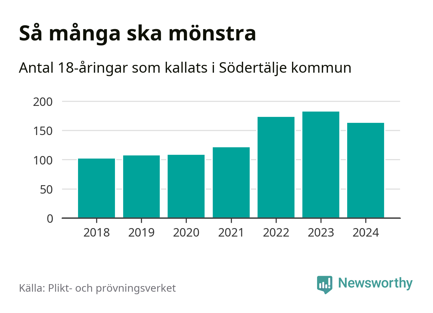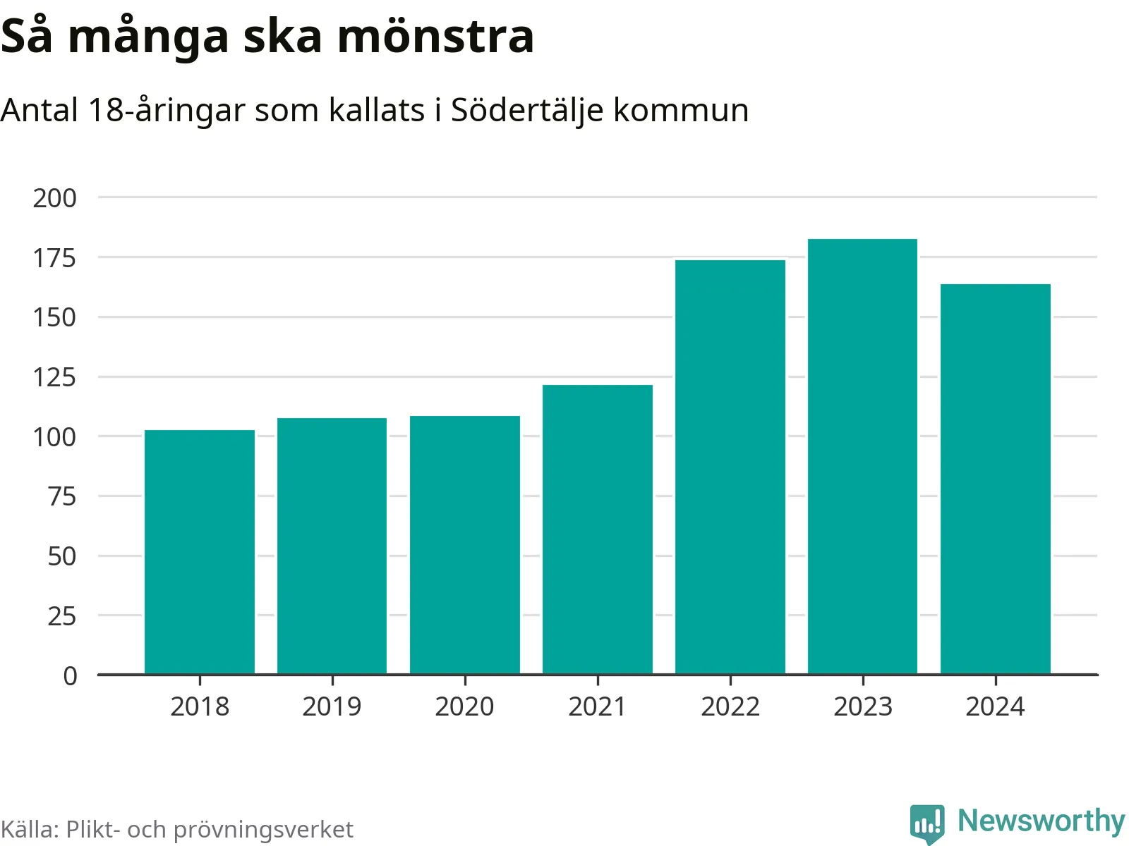 164 personer är 19 färre än 2023, men sett som andel av respektive åldersgrupp är skillnaden liten. 2018 kallades som jämförelse 103 artonåringar från Södertälje till mönstring. Det motsvarade ungefär 9 procent av årskullen född år 2000. Totalt från Stockholms län kallas 6 488 personer födda 2006 i år.