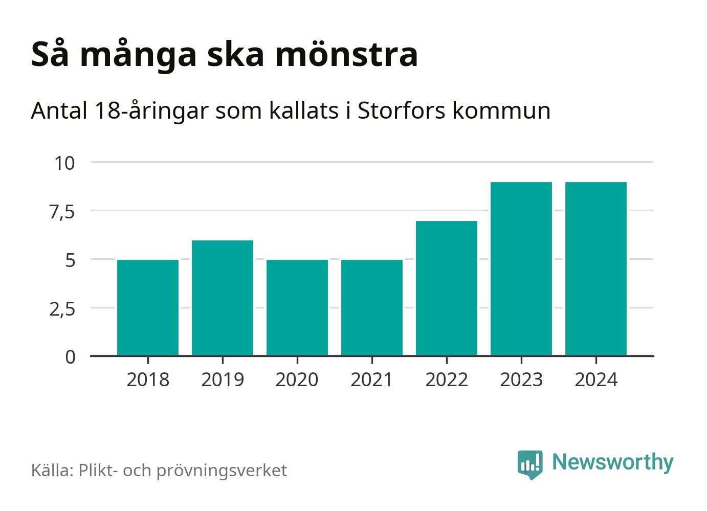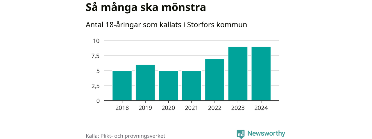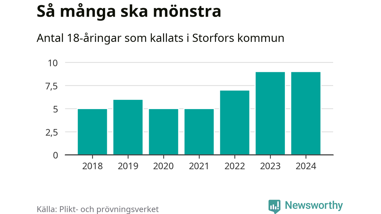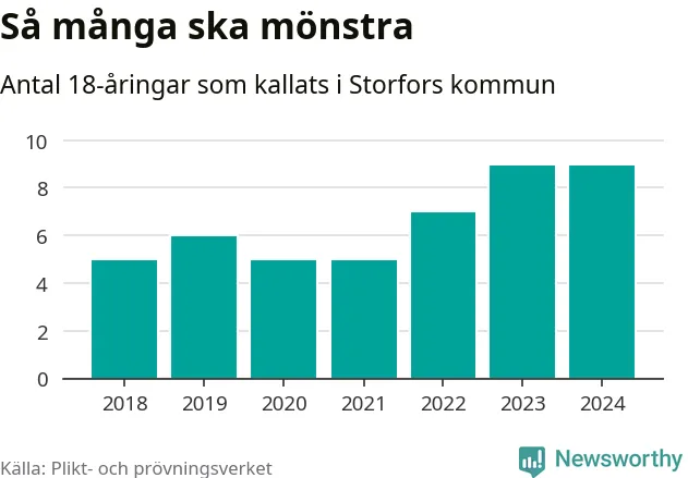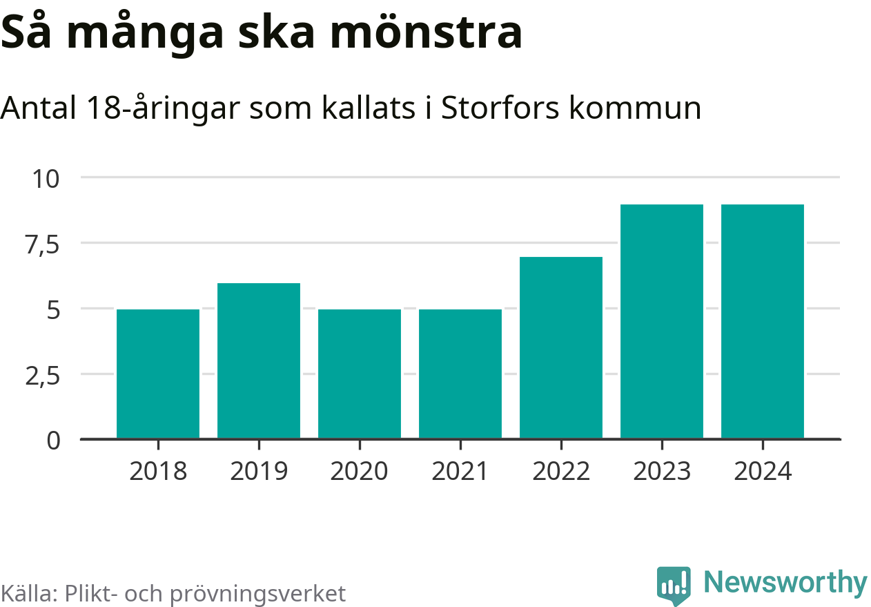 Nio personer är lika många som kallades i fjol. Det är också det högsta antalet kallade 2018, som är första året med statistik på kommunnivå (värnplikten återinfördes 2017). 2018 kallades som jämförelse fem 18-åringar från Storfors till mönstring. Det motsvarade ungefär 11 procent av årskullen född år 2000. Totalt från Värmlands län kallas 705 personer födda 2006 i år.