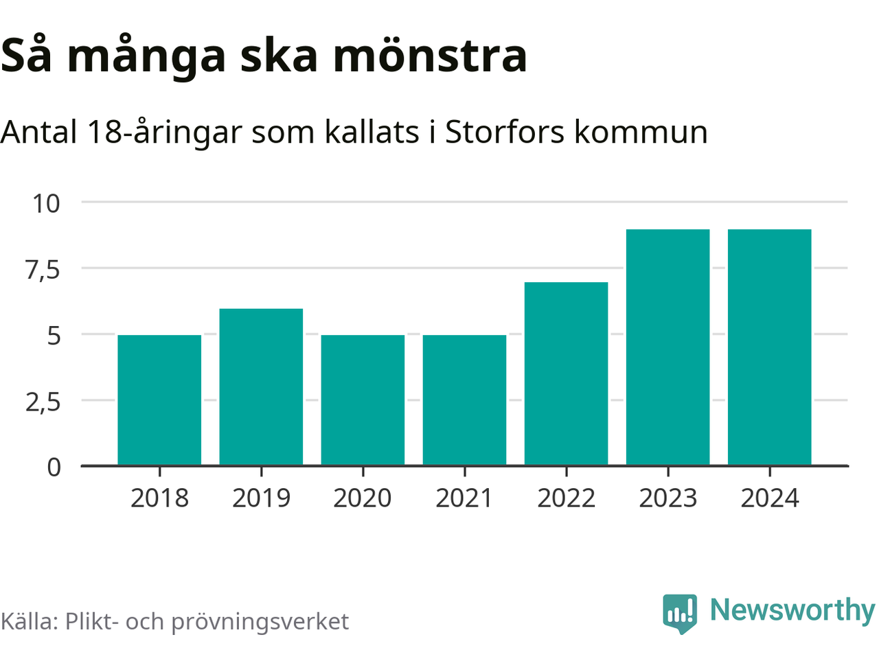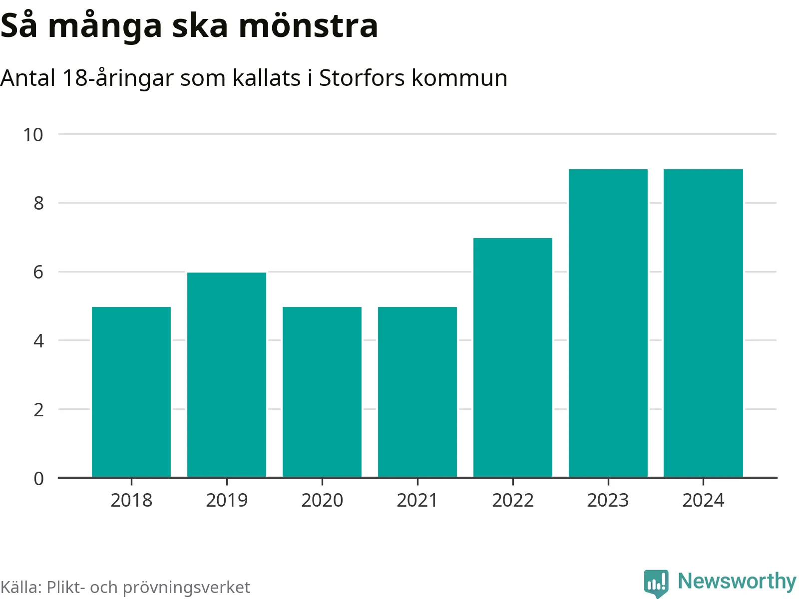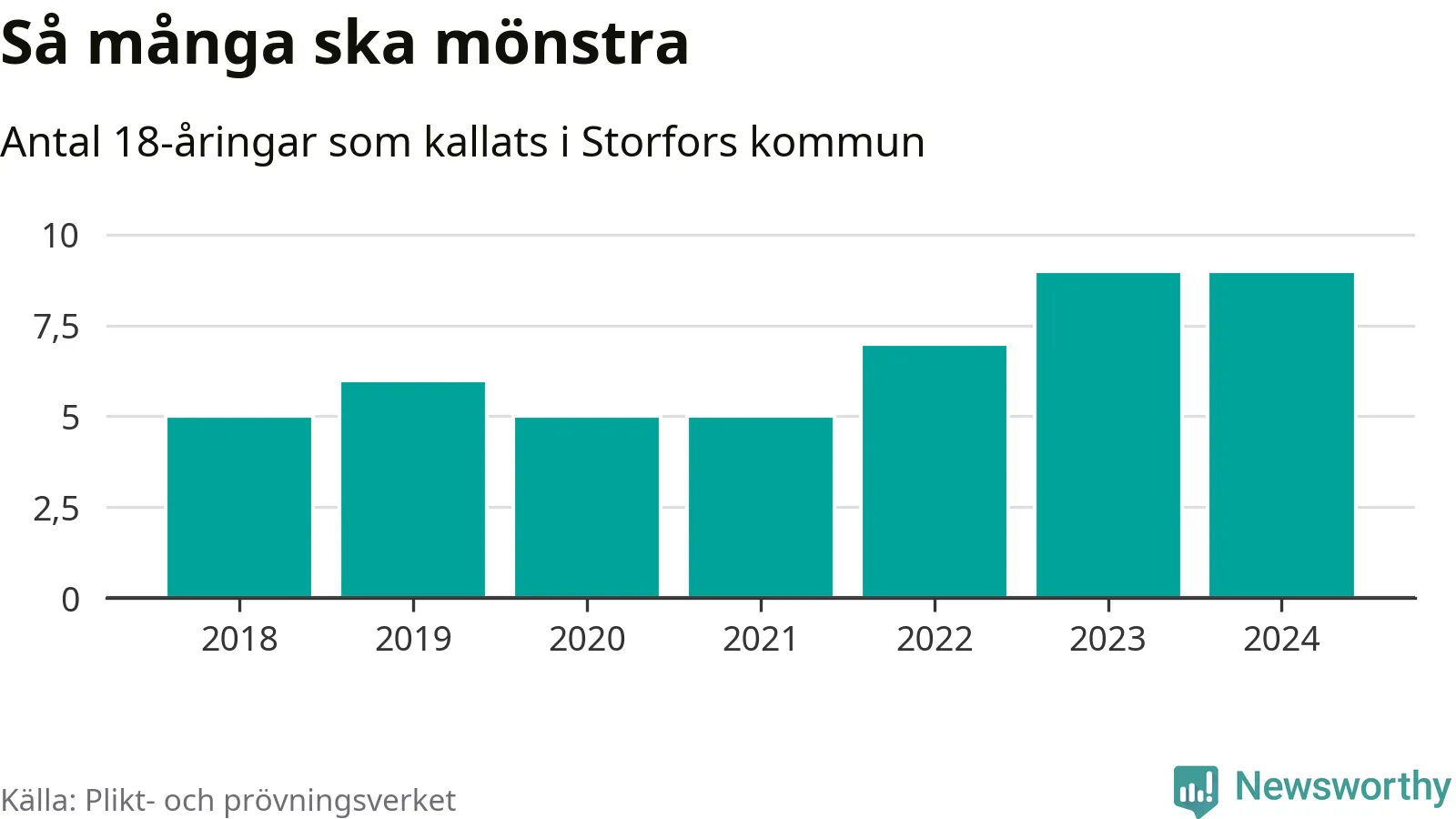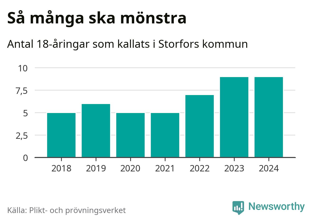 Nio personer är lika många som kallades i fjol. Det är också det högsta antalet kallade 2018, som är första året med statistik på kommunnivå (värnplikten återinfördes 2017). 2018 kallades som jämförelse fem 18-åringar från Storfors till mönstring. Det motsvarade ungefär 11 procent av årskullen född år 2000. Totalt från Värmlands län kallas 705 personer födda 2006 i år.