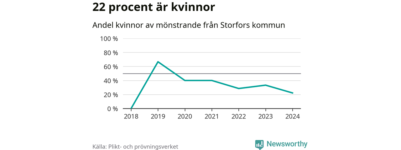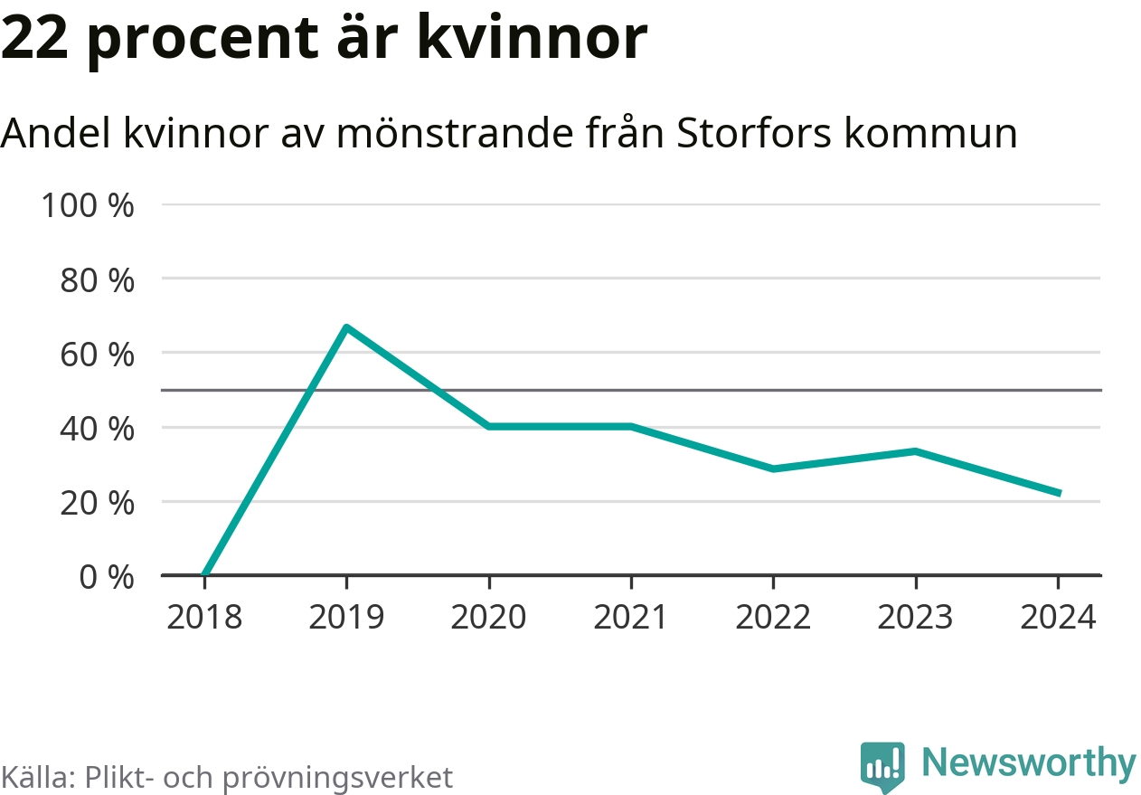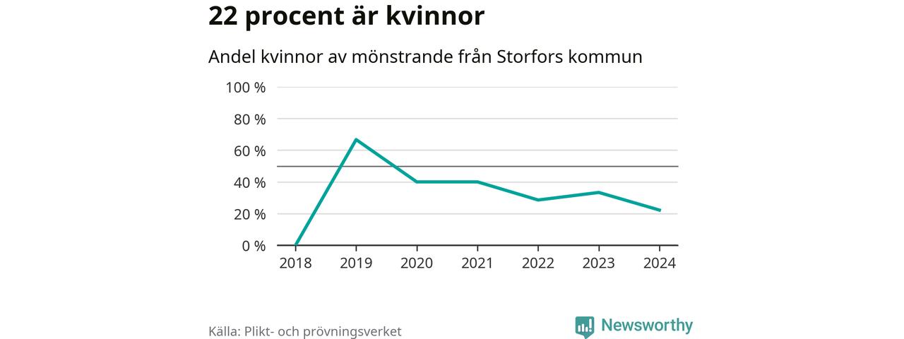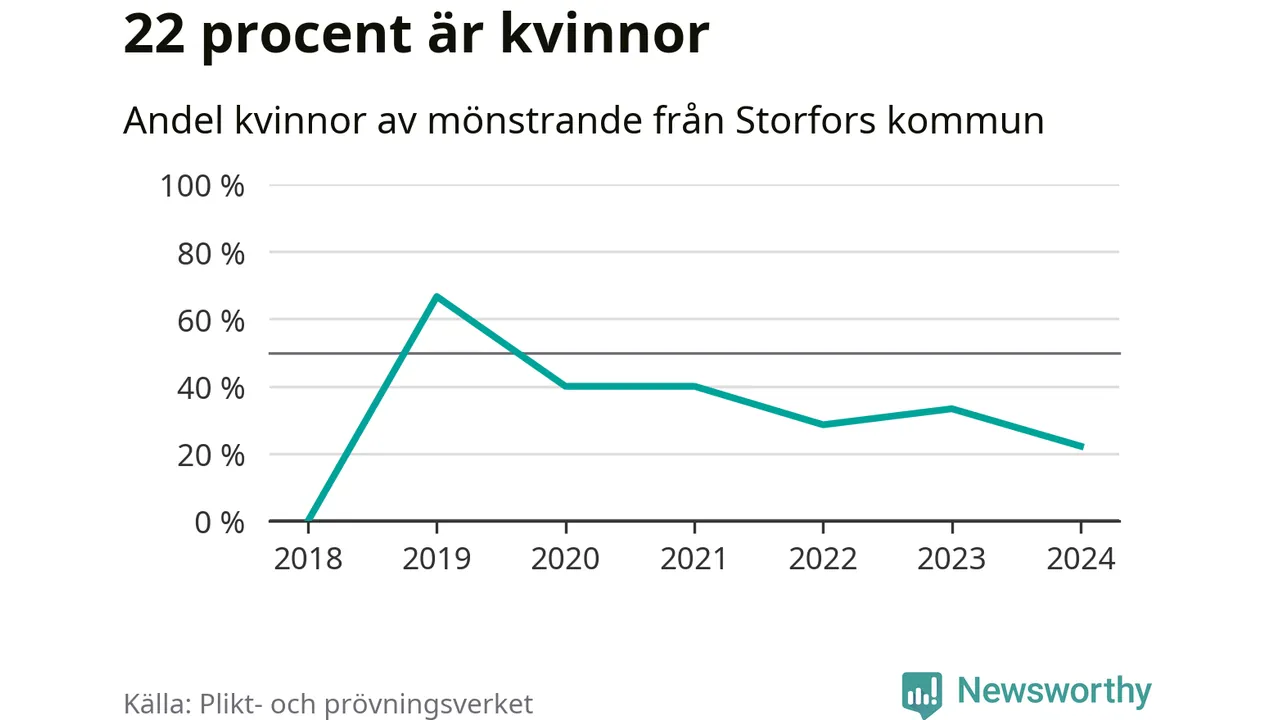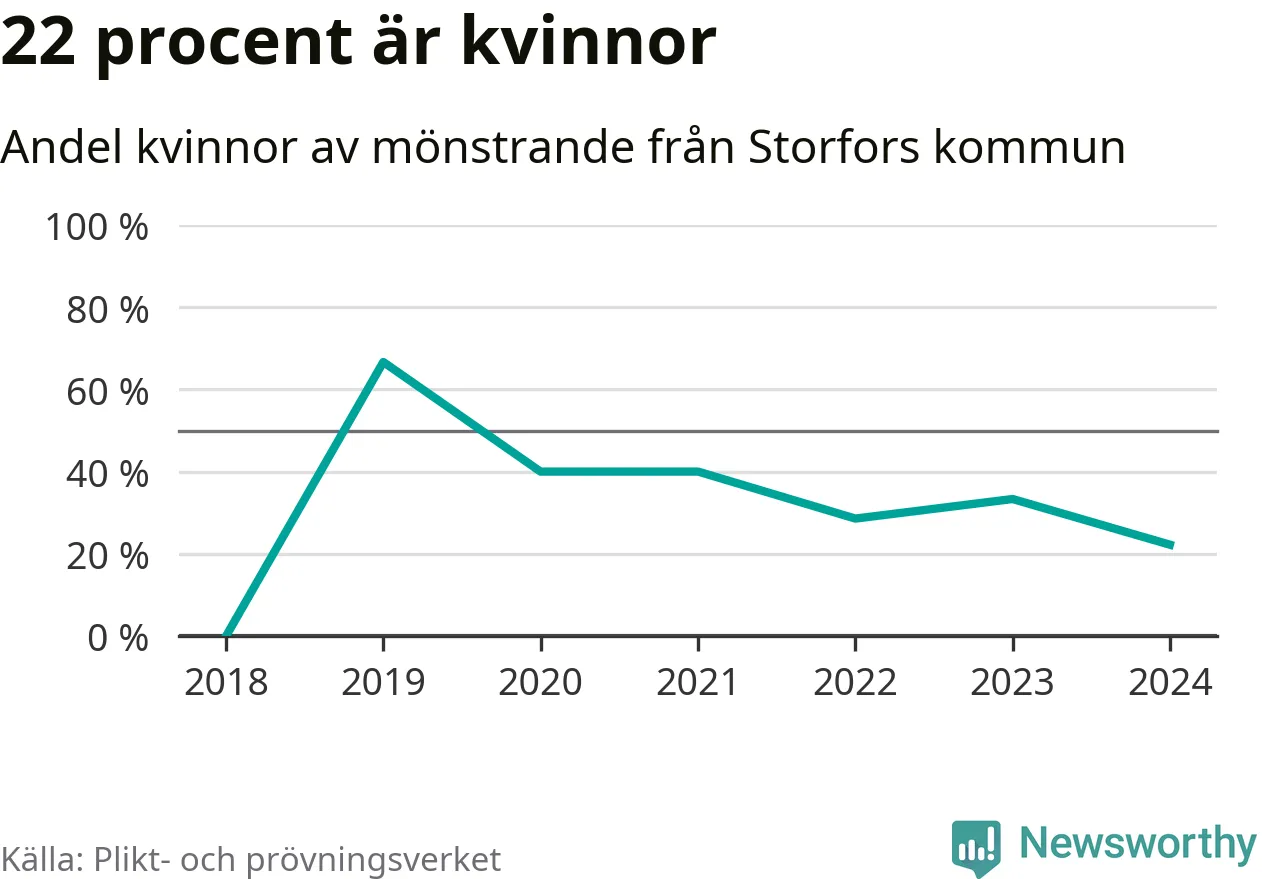 Två av de som kallats till mönstring från Storfors är kvinnor, vilket motsvarar 22 procent av de mönstrande. Som mest har fyra kvinnor kallats från kommunen (2019). I riket som helhet är 30 procent av de mönstrande tjejer.