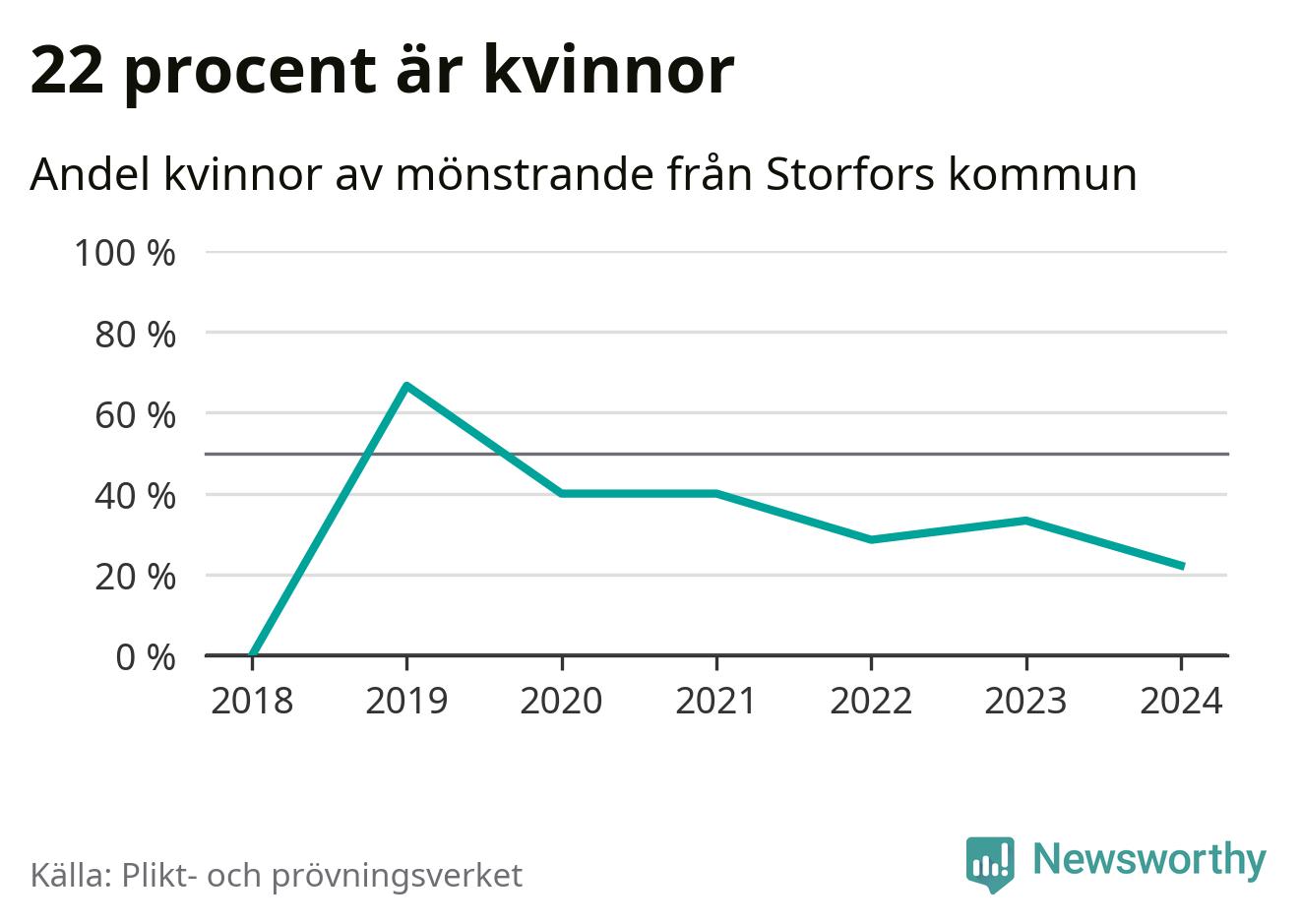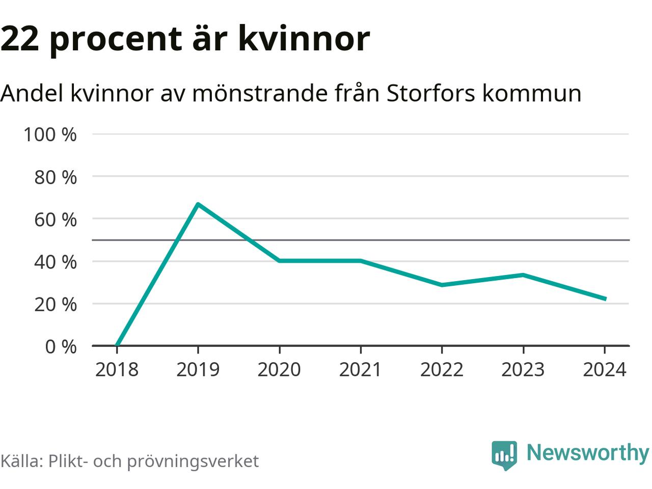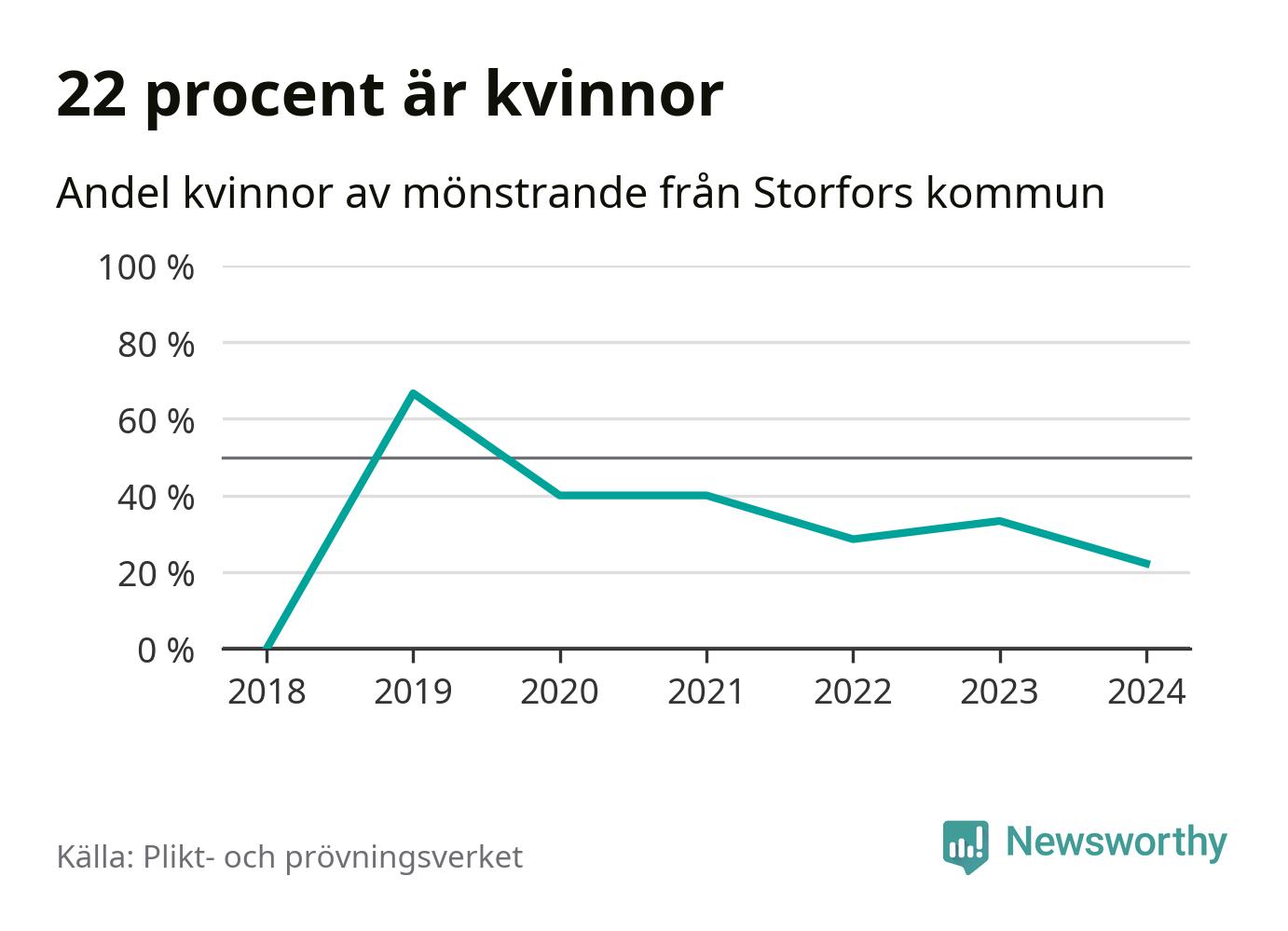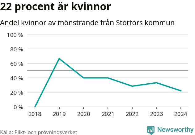Två av de som kallats till mönstring från Storfors är kvinnor, vilket motsvarar 22 procent av de mönstrande. Som mest har fyra kvinnor kallats från kommunen (2019). I riket som helhet är 30 procent av de mönstrande tjejer.