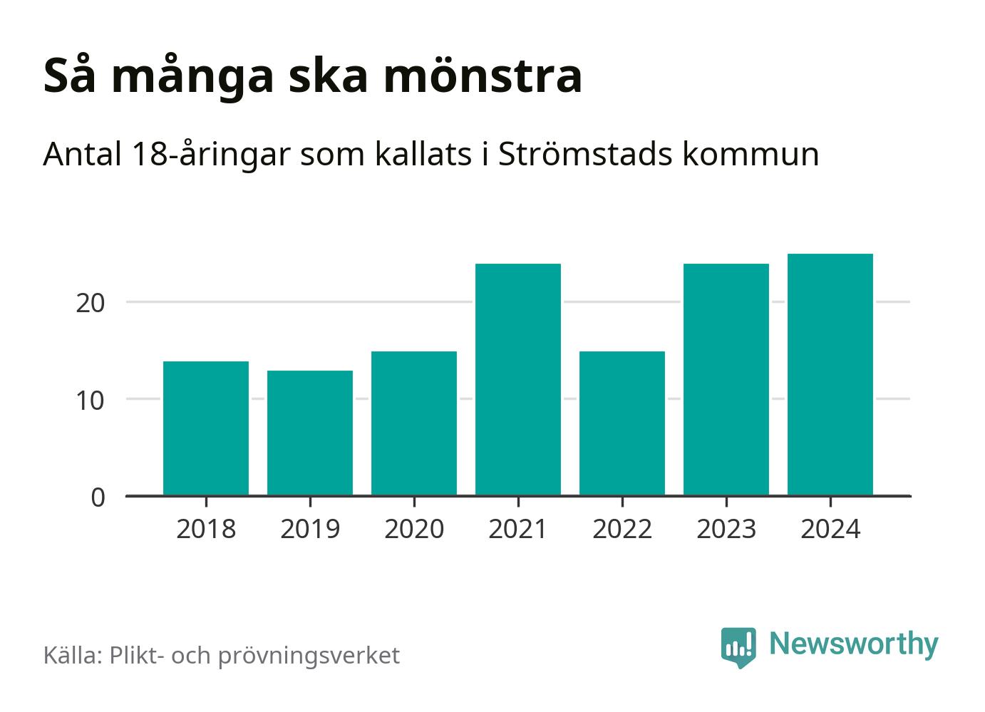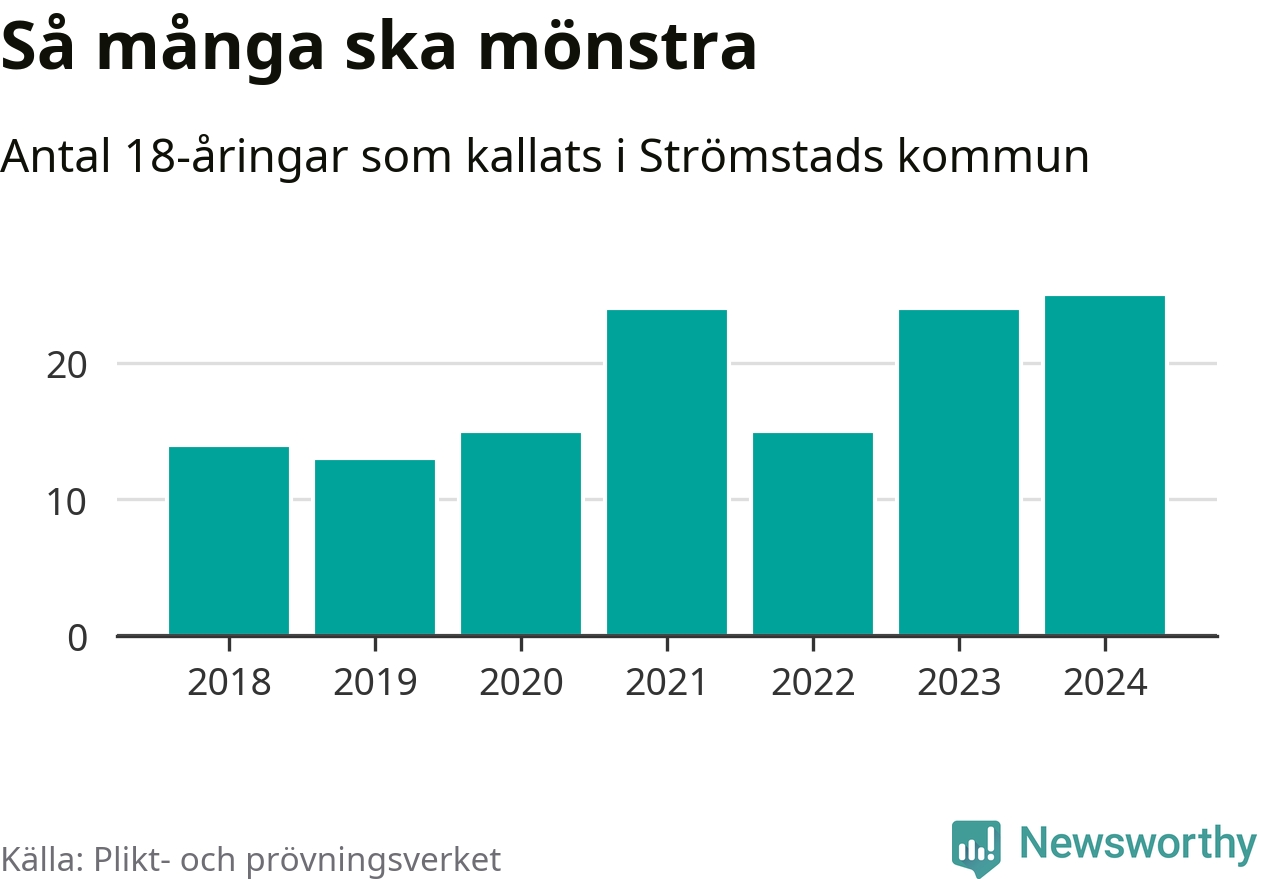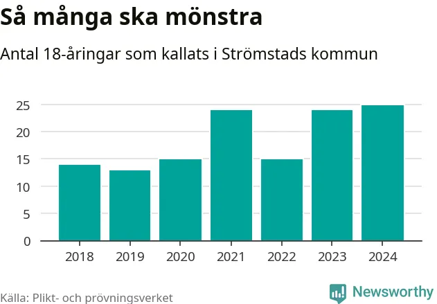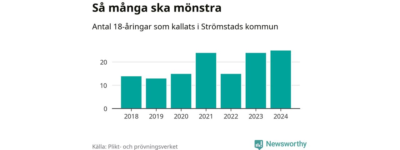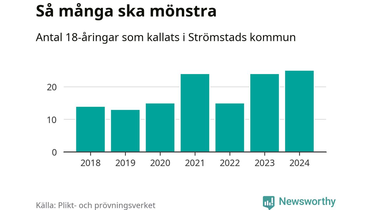 25 personer är det högsta antalet kallade i Strömstad sedan 2018, som är första året med statistik på kommunnivå (värnplikten återinfördes 2017), och en mönstrande mer än 2023. 2018 kallades som jämförelse 14 artonåringar från Strömstad till mönstring. Det motsvarade ungefär 10 procent av årskullen född år 2000. Totalt från Västra Götalands län kallas 4 562 personer födda 2006 i år.