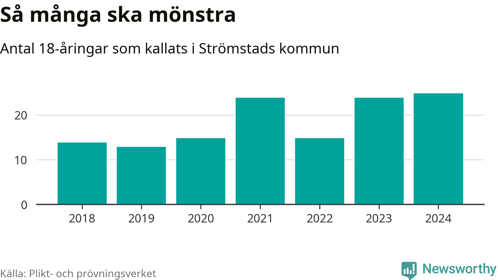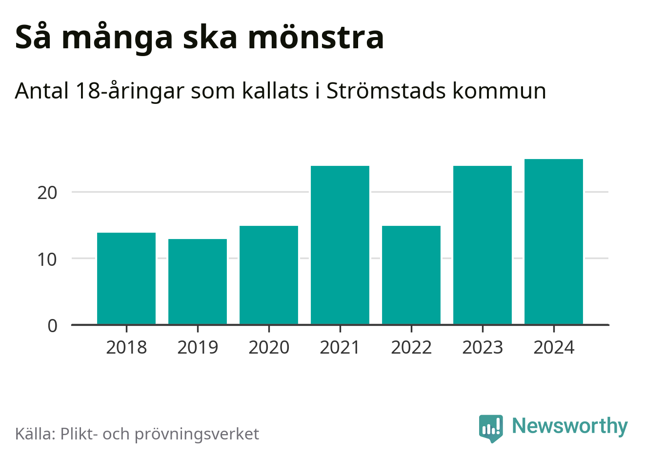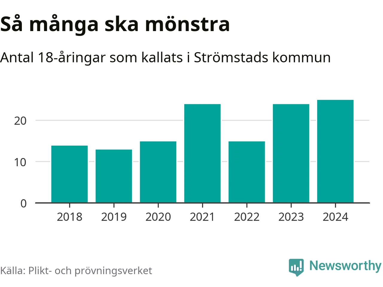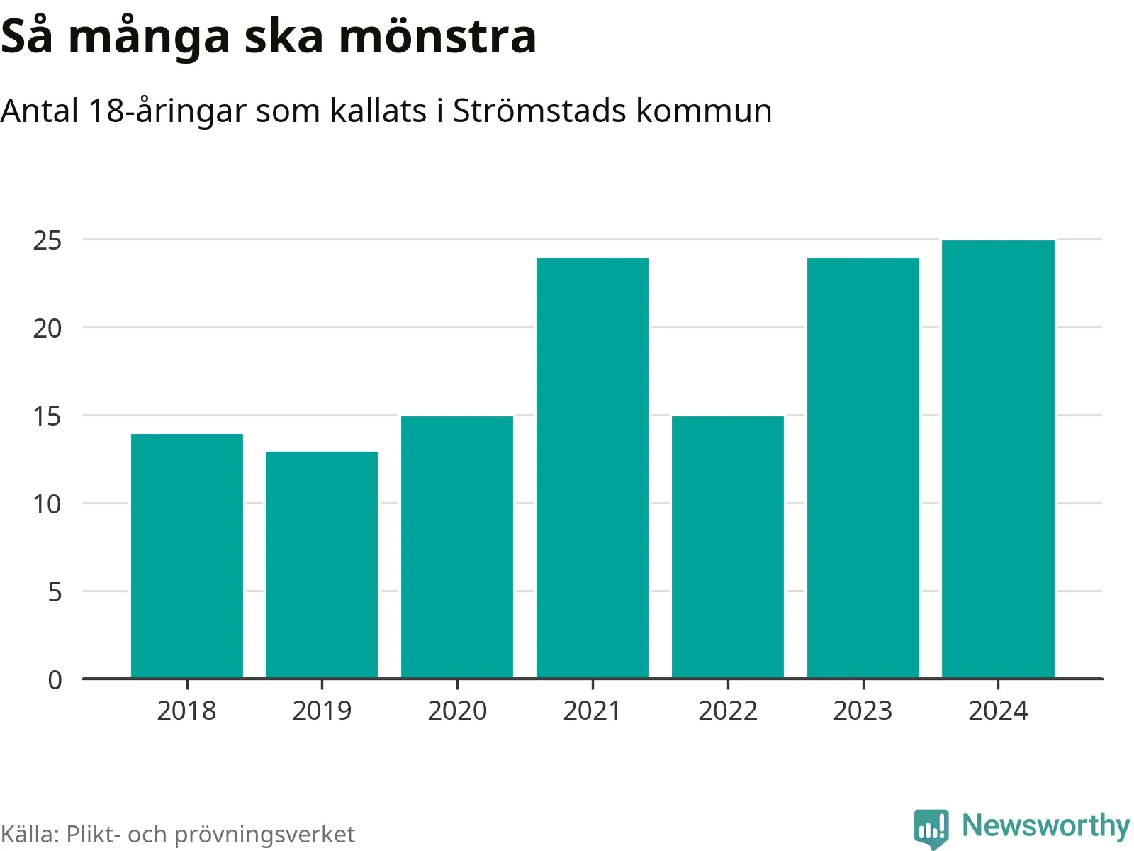 25 personer är det högsta antalet kallade i Strömstad sedan 2018, som är första året med statistik på kommunnivå (värnplikten återinfördes 2017), och en mönstrande mer än 2023. 2018 kallades som jämförelse 14 artonåringar från Strömstad till mönstring. Det motsvarade ungefär 10 procent av årskullen född år 2000. Totalt från Västra Götalands län kallas 4 562 personer födda 2006 i år.