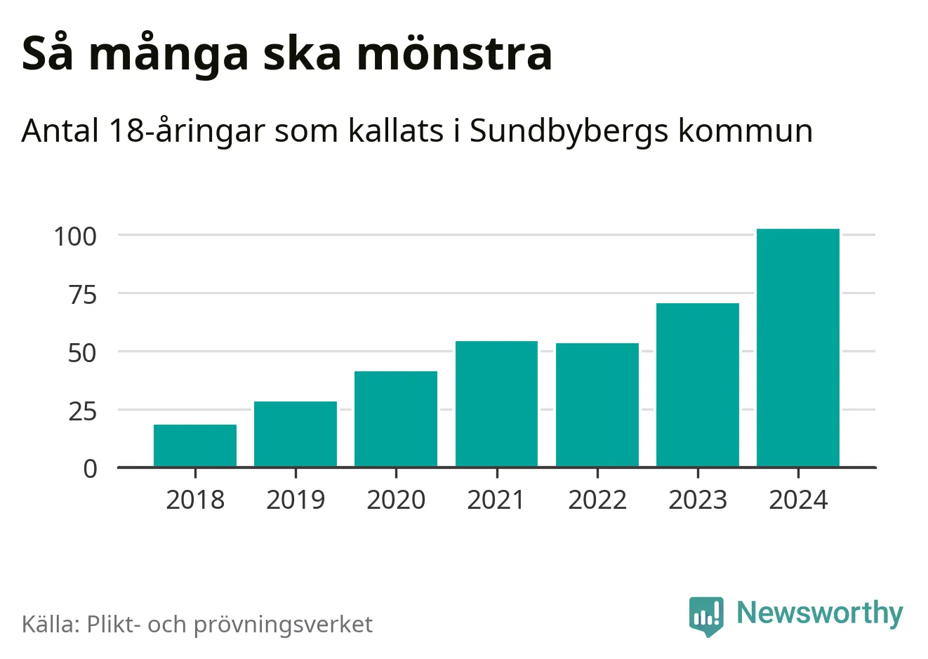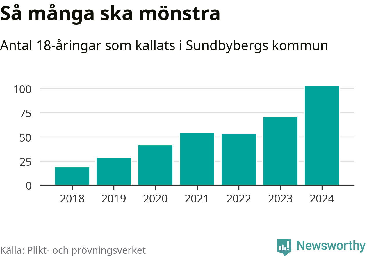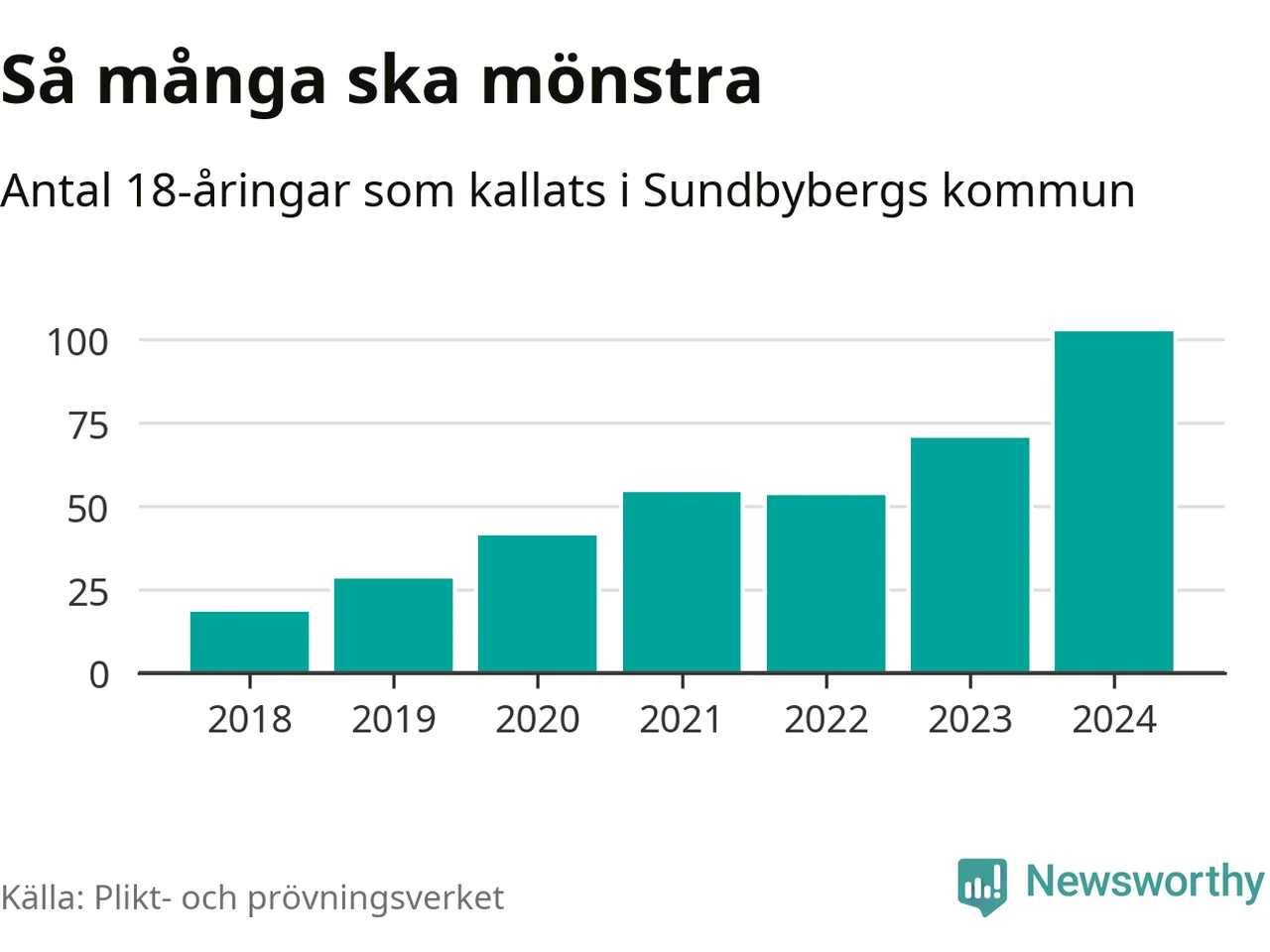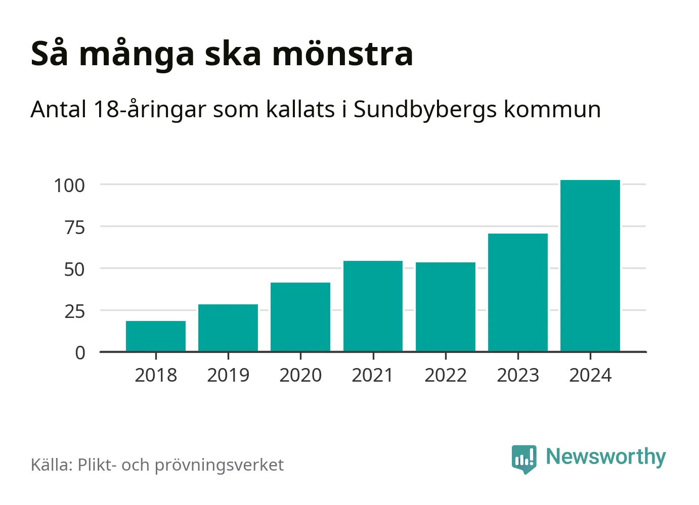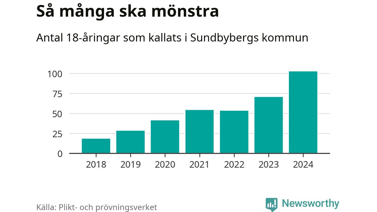 103 personer är det högsta antalet kallade i Sundbyberg sedan 2018, som är första året med statistik på kommunnivå (värnplikten återinfördes 2017), och 32 mönstrande mer än 2023. 2018 kallades som jämförelse 19 artonåringar från Sundbyberg till mönstring. Det motsvarade ungefär 5 procent av årskullen född år 2000. Totalt från Stockholms län kallas 6 488 personer födda 2006 i år.