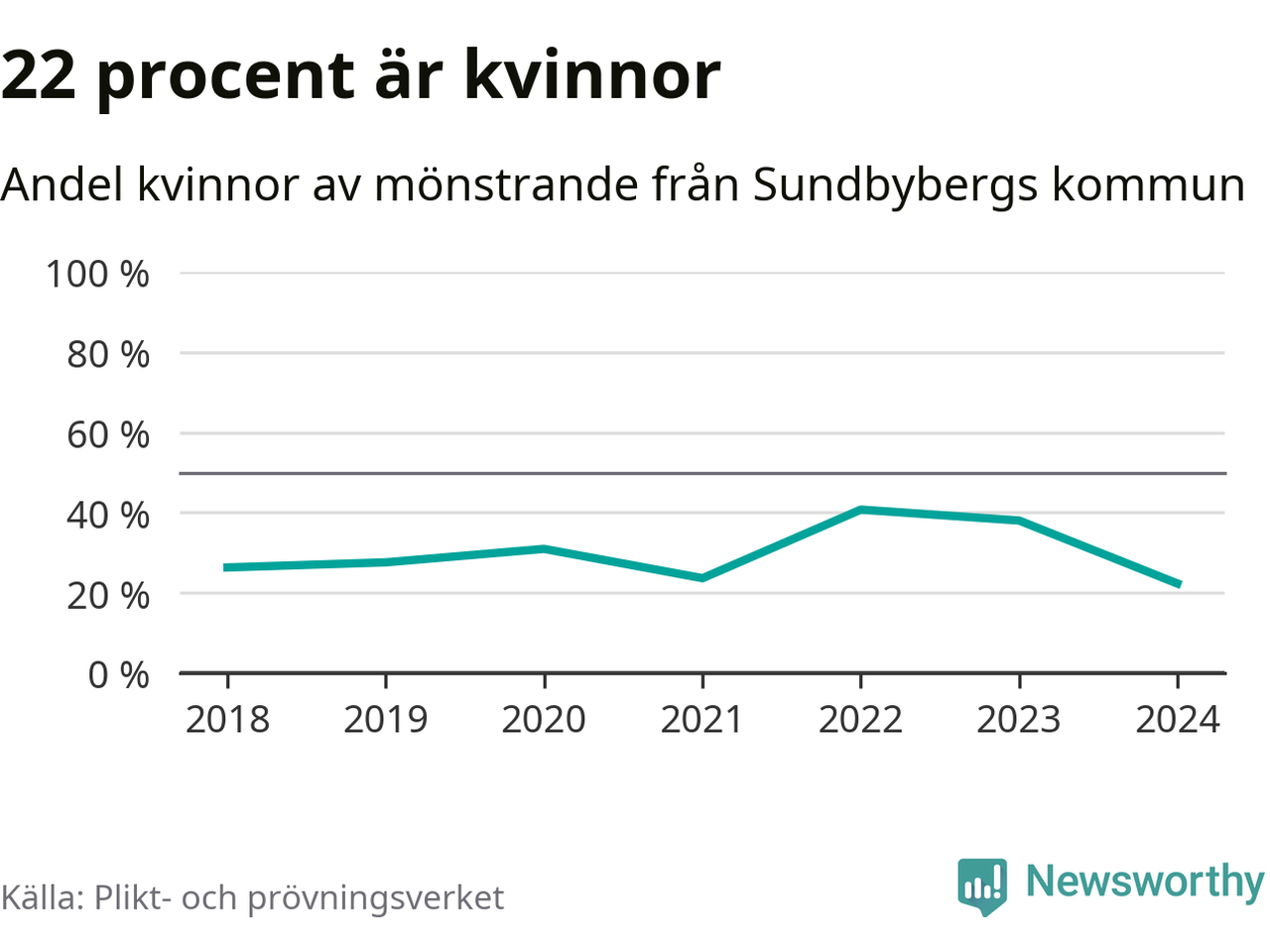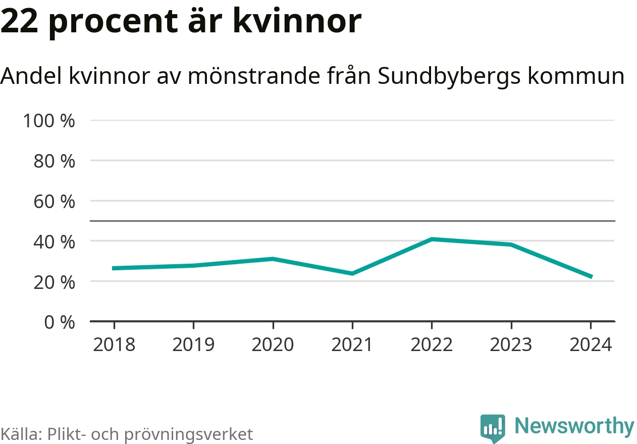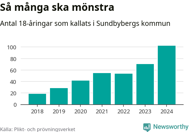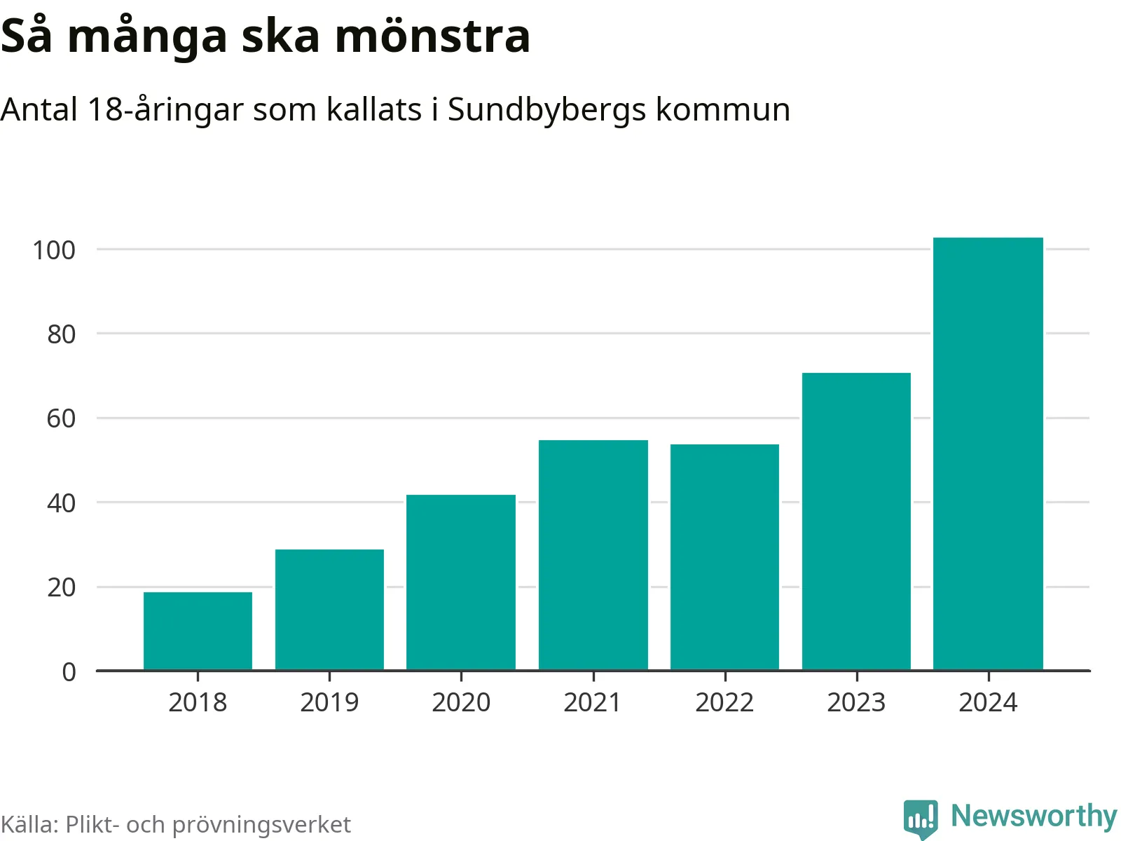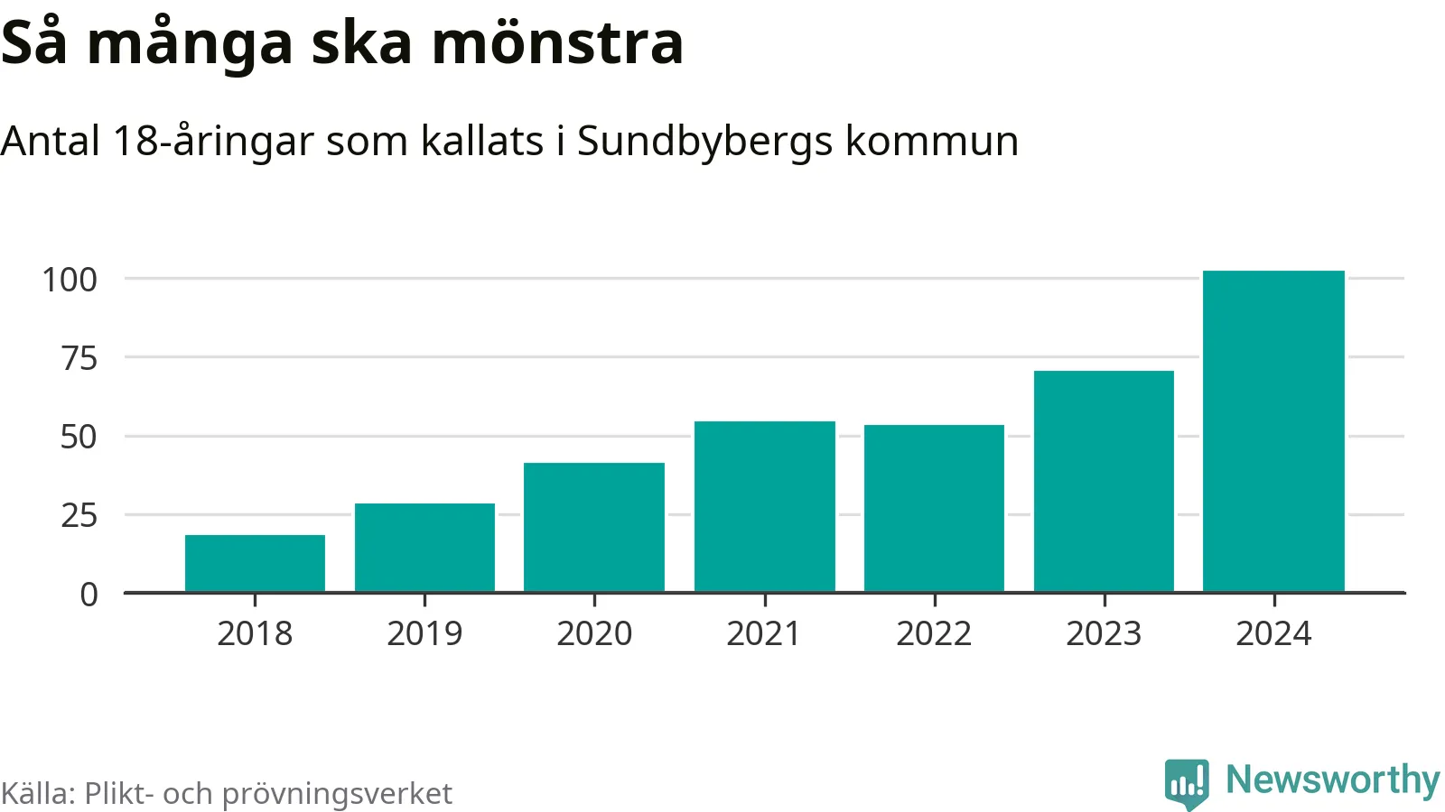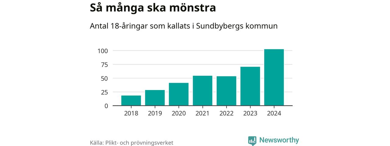 103 personer är det högsta antalet kallade i Sundbyberg sedan 2018, som är första året med statistik på kommunnivå (värnplikten återinfördes 2017), och 32 mönstrande mer än 2023. 2018 kallades som jämförelse 19 artonåringar från Sundbyberg till mönstring. Det motsvarade ungefär 5 procent av årskullen född år 2000. Totalt från Stockholms län kallas 6 488 personer födda 2006 i år.