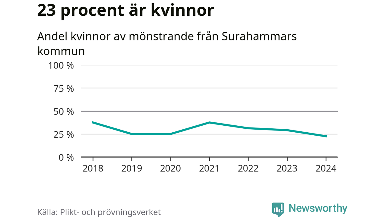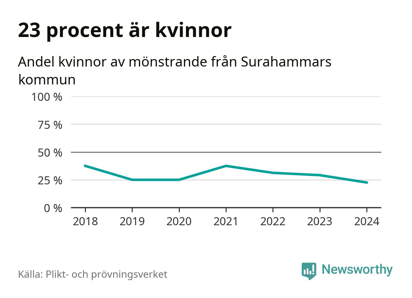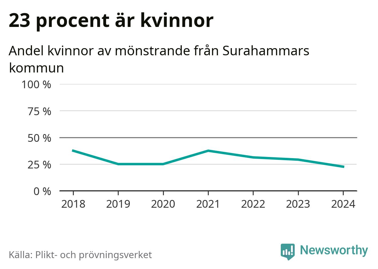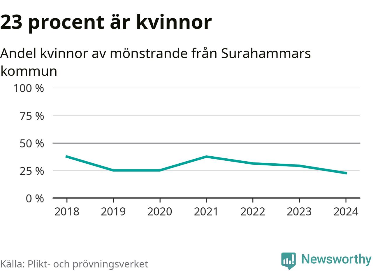 Sju av de som kallats till mönstring från Surahammar är kvinnor, vilket motsvarar 23 procent av de mönstrande. I absoluta tal är det fler kvinnor än något år sedan värnplikten återinfördes, men 2021 och 2018 var en större andel av de mönstrande från kommunen kvinnor (38 procent). I riket som helhet är 30 procent av de mönstrande tjejer.