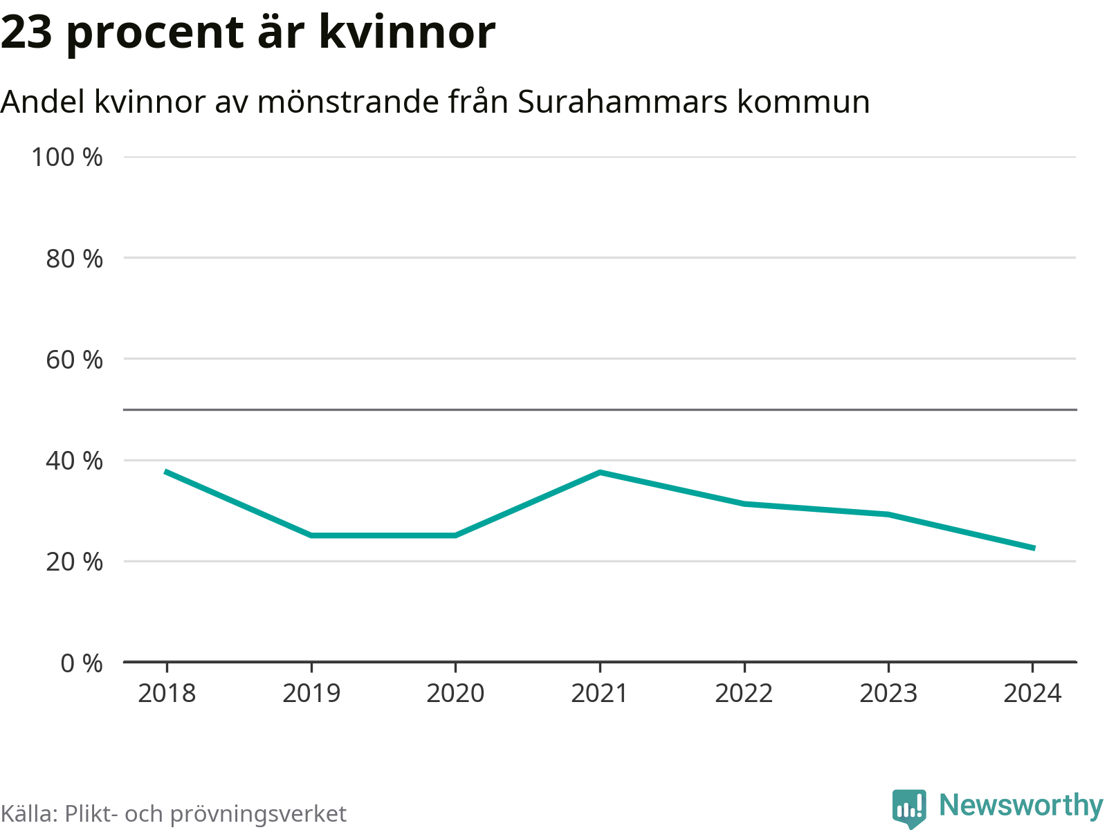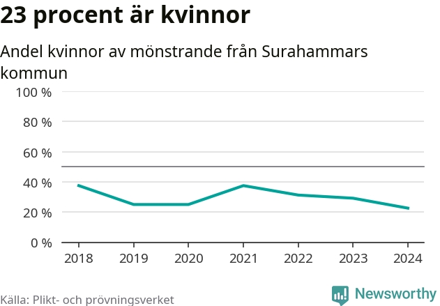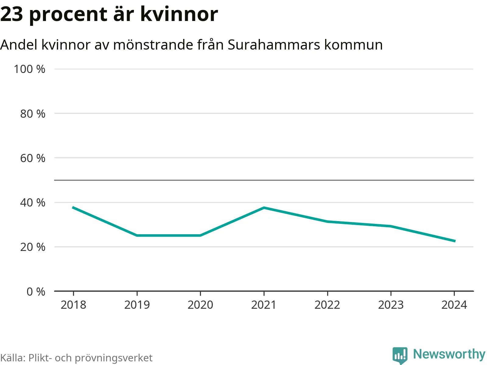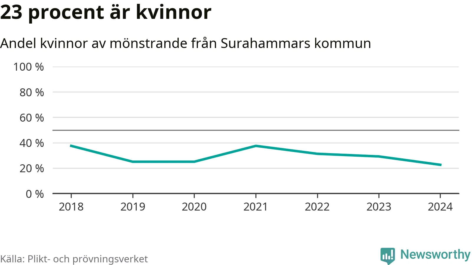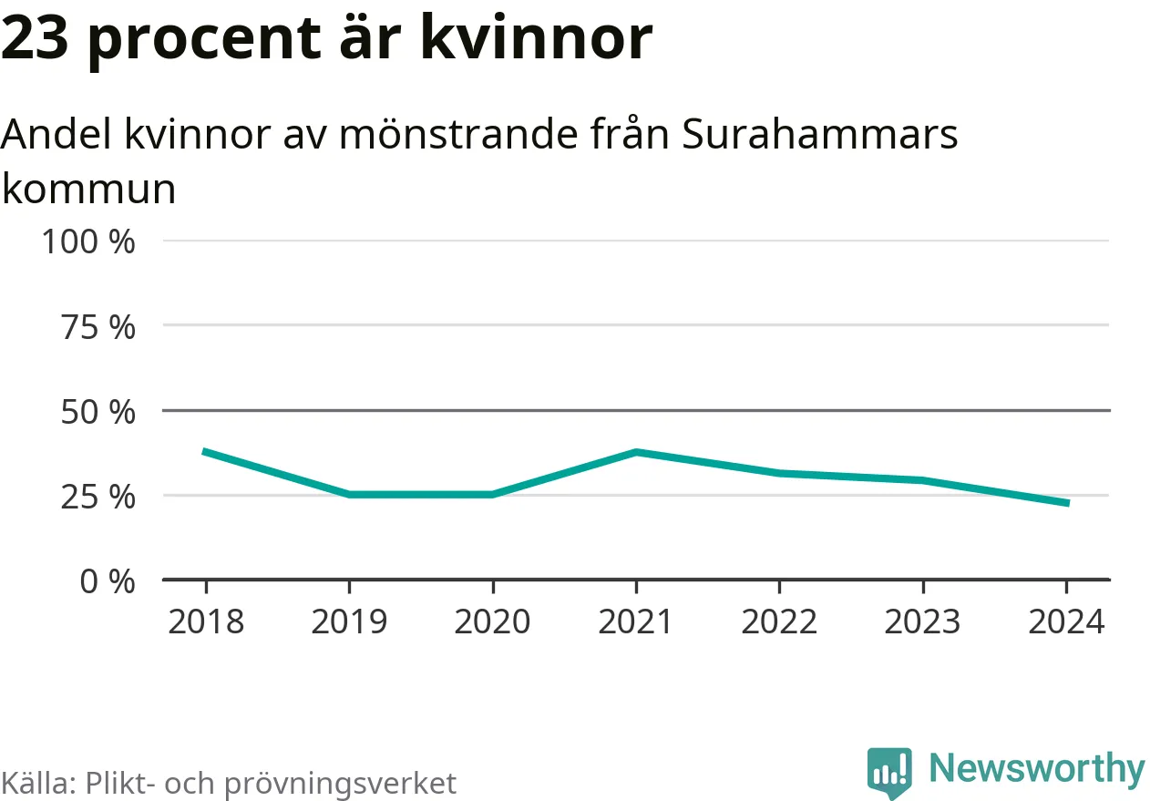 Sju av de som kallats till mönstring från Surahammar är kvinnor, vilket motsvarar 23 procent av de mönstrande. I absoluta tal är det fler kvinnor än något år sedan värnplikten återinfördes, men 2021 och 2018 var en större andel av de mönstrande från kommunen kvinnor (38 procent). I riket som helhet är 30 procent av de mönstrande tjejer.