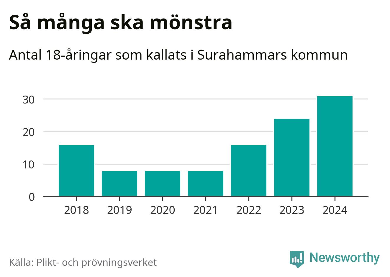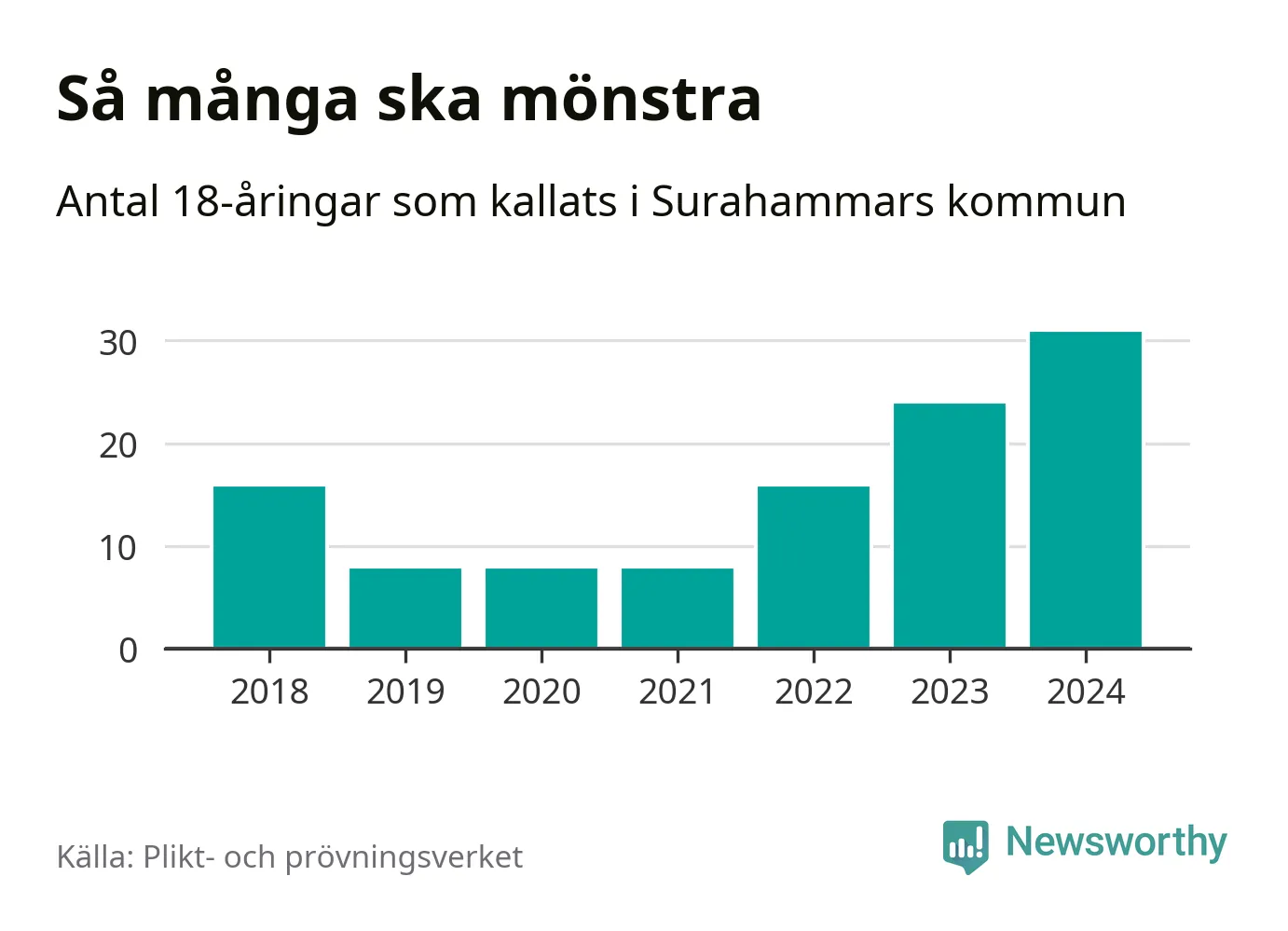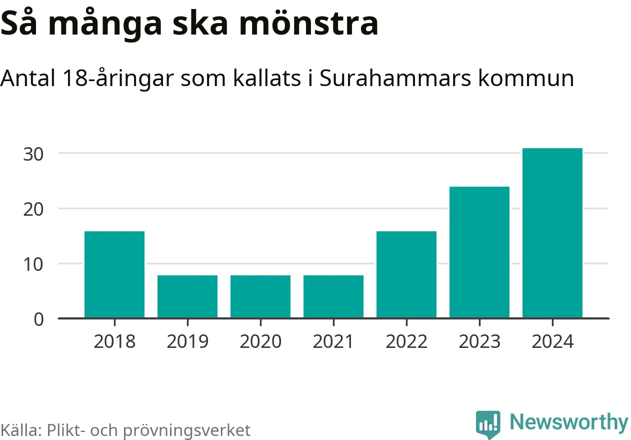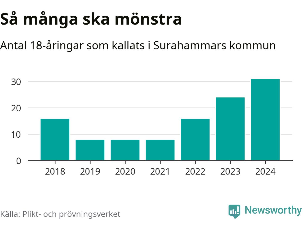 31 personer är det högsta antalet kallade i Surahammar sedan 2018, som är första året med statistik på kommunnivå (värnplikten återinfördes 2017), och sju mönstrande mer än 2023. 2018 kallades som jämförelse 16 artonåringar från Surahammar till mönstring. Det motsvarade ungefär 12 procent av årskullen född år 2000. Totalt från Västmanlands län kallas 717 personer födda 2006 i år.