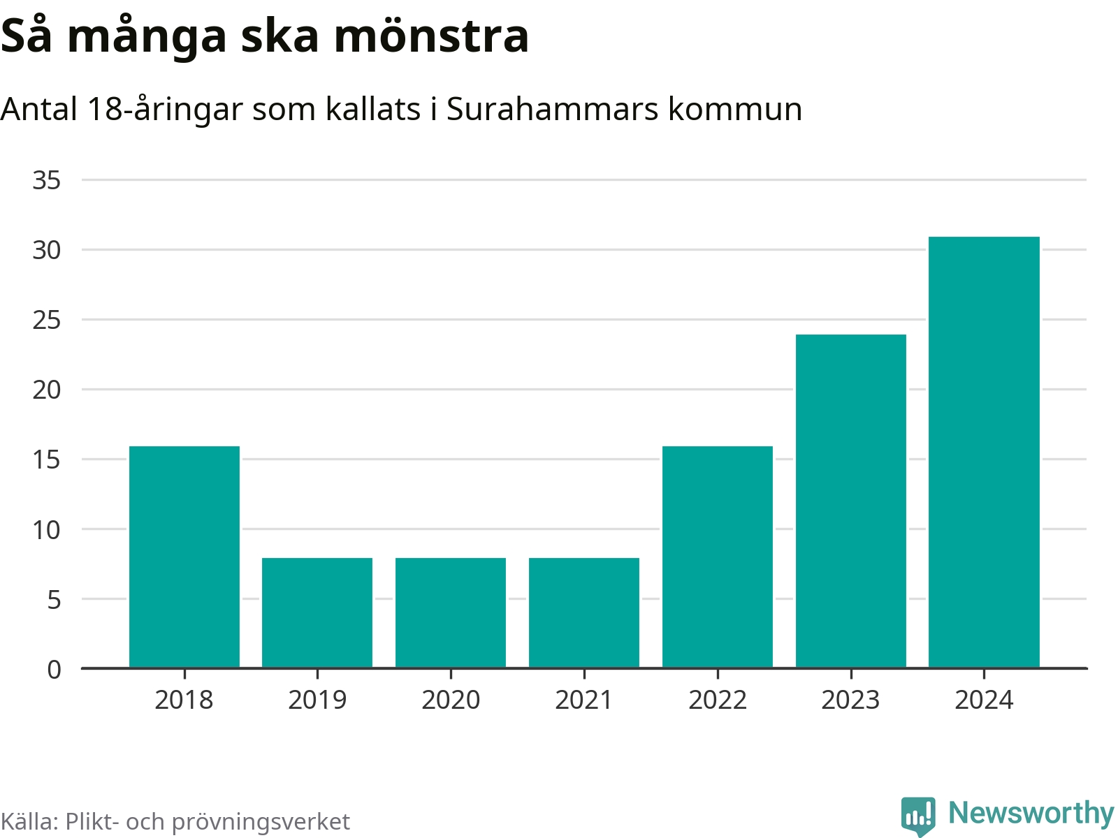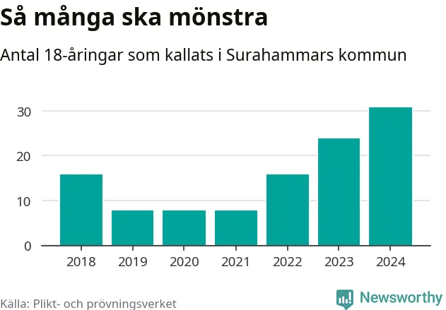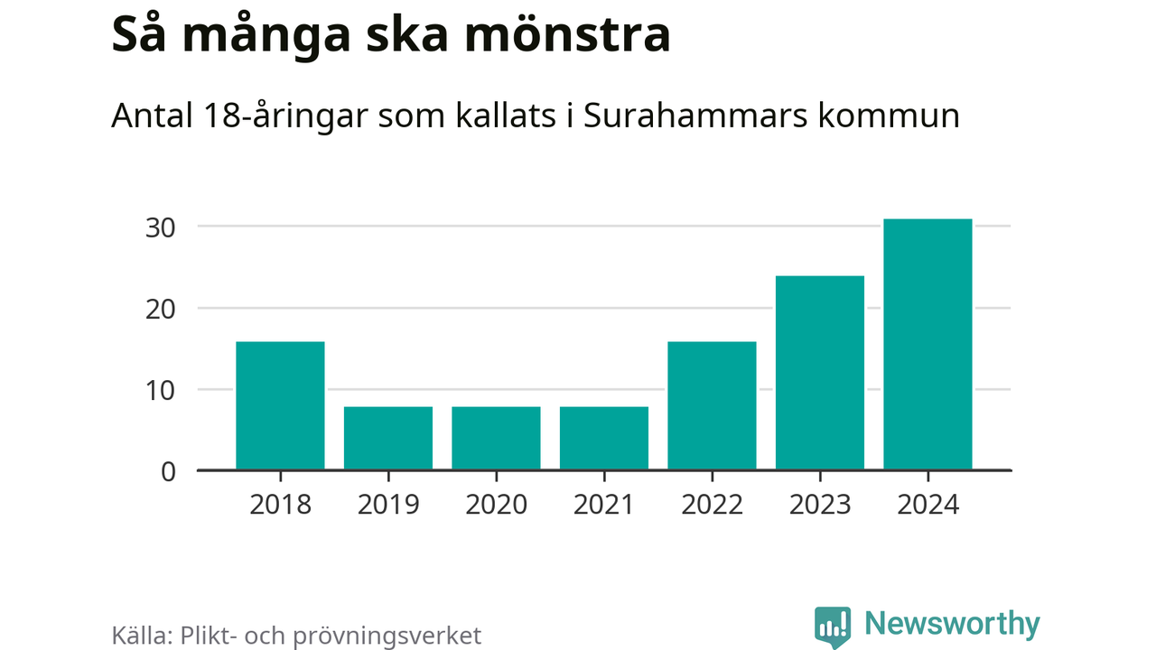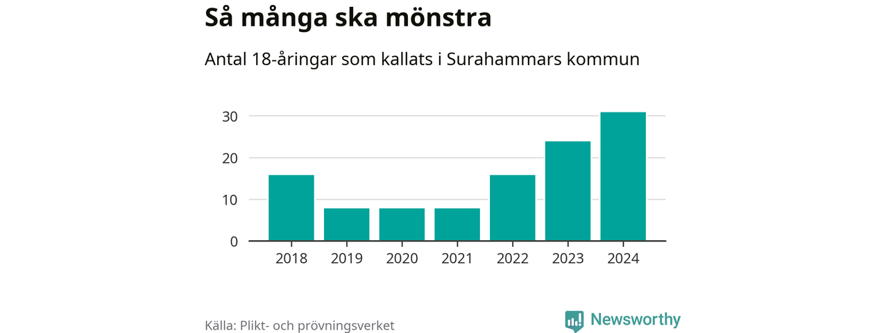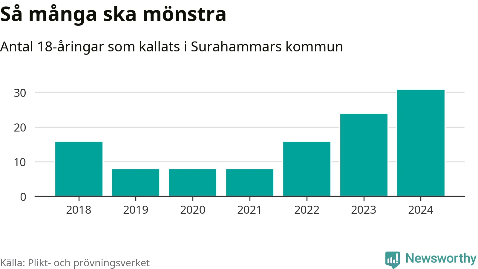31 personer är det högsta antalet kallade i Surahammar sedan 2018, som är första året med statistik på kommunnivå (värnplikten återinfördes 2017), och sju mönstrande mer än 2023. 2018 kallades som jämförelse 16 artonåringar från Surahammar till mönstring. Det motsvarade ungefär 12 procent av årskullen född år 2000. Totalt från Västmanlands län kallas 717 personer födda 2006 i år.