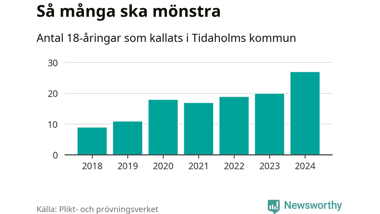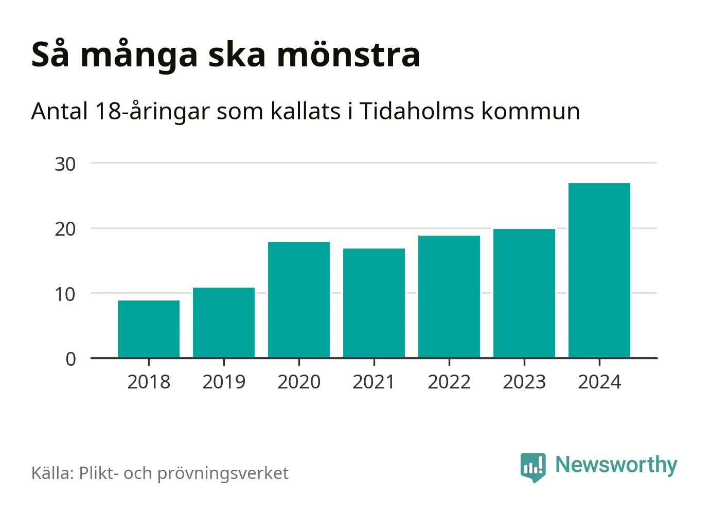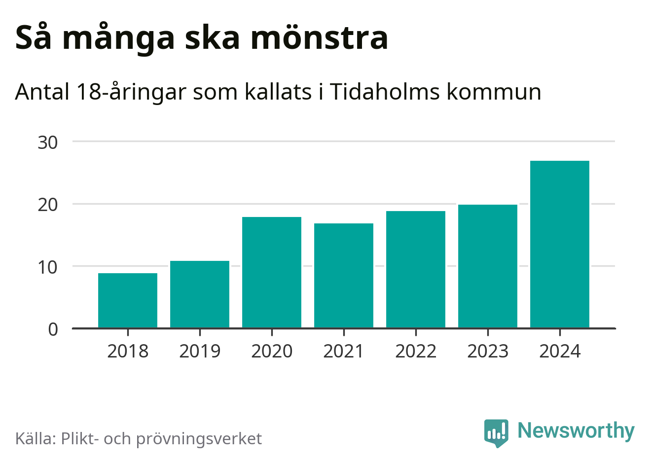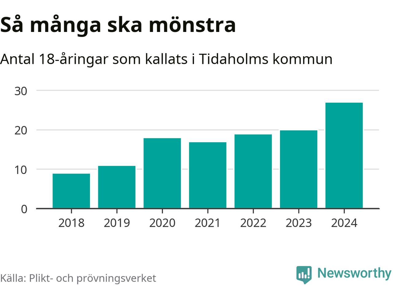27 personer är det högsta antalet kallade i Tidaholm sedan 2018, som är första året med statistik på kommunnivå (värnplikten återinfördes 2017), och sju mönstrande mer än 2023. 2018 kallades som jämförelse nio 18-åringar från Tidaholm till mönstring. Det motsvarade ungefär 6 procent av årskullen född år 2000. Totalt från Västra Götalands län kallas 4 562 personer födda 2006 i år.