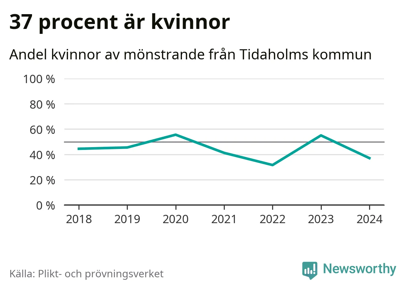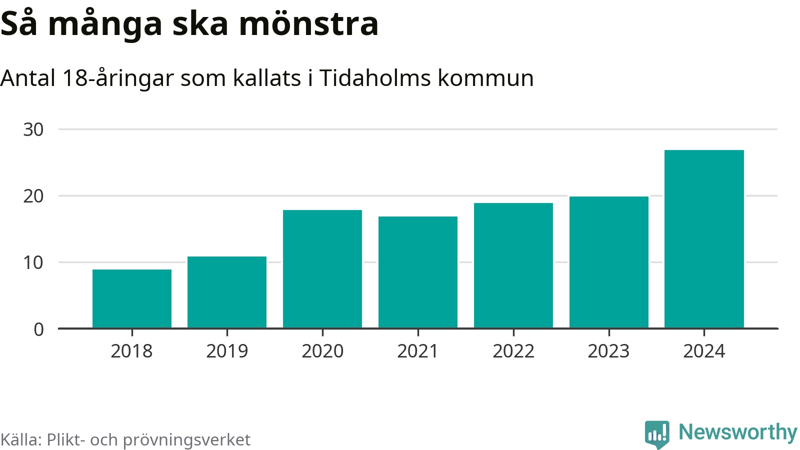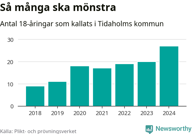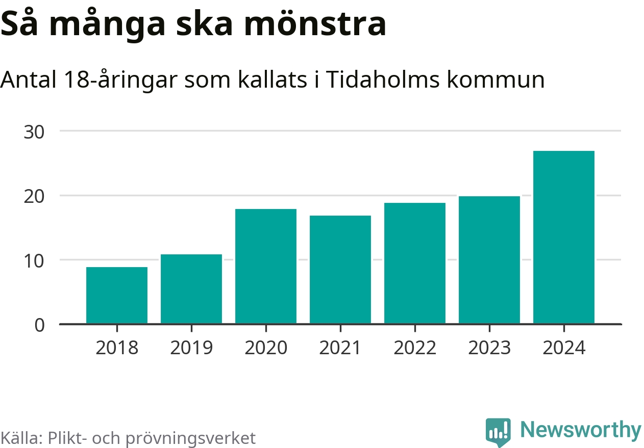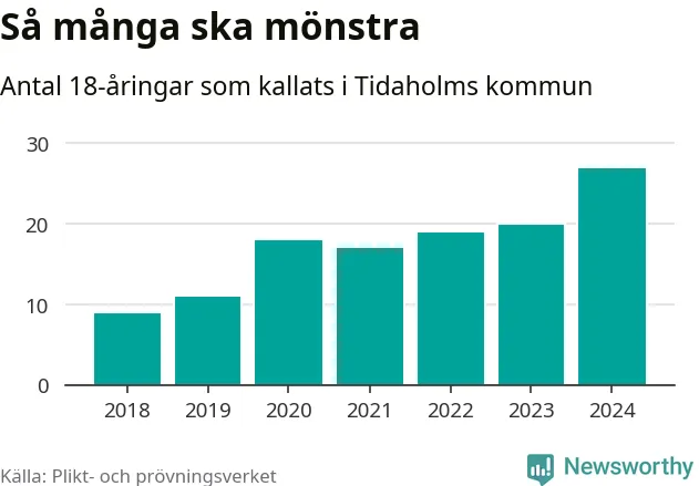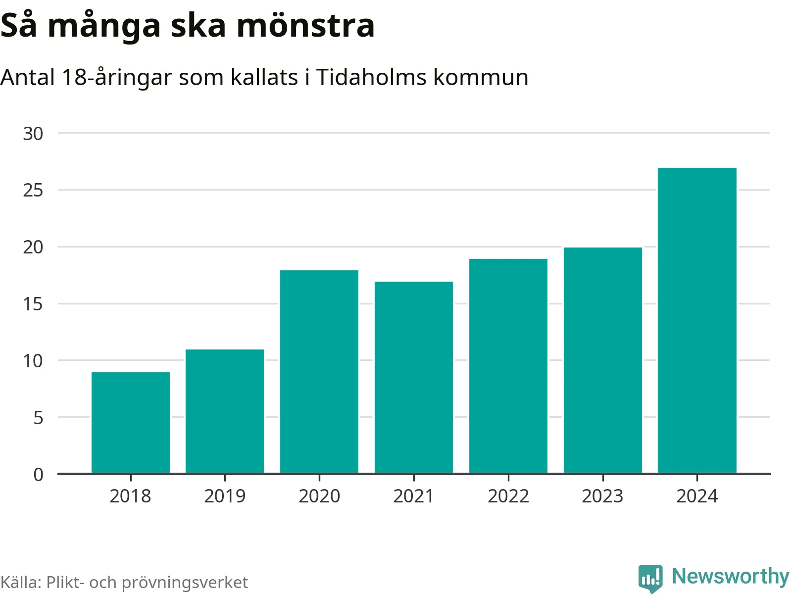 27 personer är det högsta antalet kallade i Tidaholm sedan 2018, som är första året med statistik på kommunnivå (värnplikten återinfördes 2017), och sju mönstrande mer än 2023. 2018 kallades som jämförelse nio 18-åringar från Tidaholm till mönstring. Det motsvarade ungefär 6 procent av årskullen född år 2000. Totalt från Västra Götalands län kallas 4 562 personer födda 2006 i år.