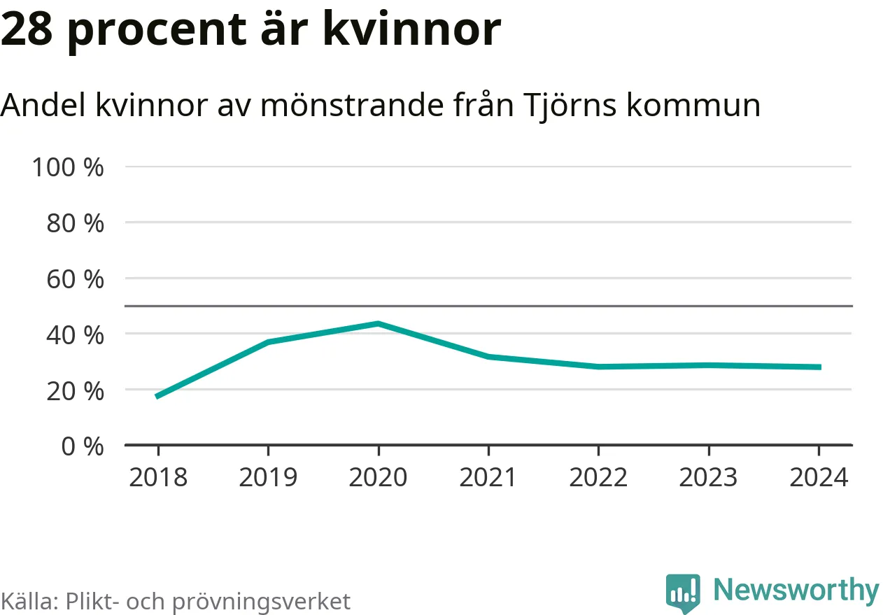 Tolv av de som kallats till mönstring från Tjörn är kvinnor, vilket motsvarar 28 procent av de mönstrande. I absoluta tal är det fler kvinnor än något år sedan värnplikten återinfördes, men 2020 var en större andel av de mönstrande från kommunen kvinnor (43 procent). I riket som helhet är 30 procent av de mönstrande tjejer.