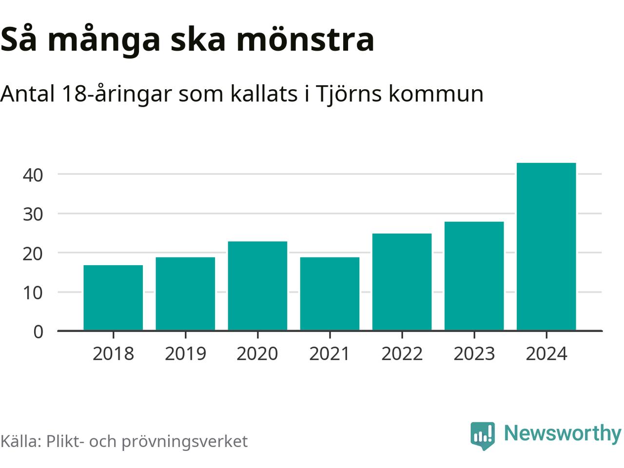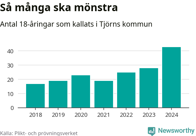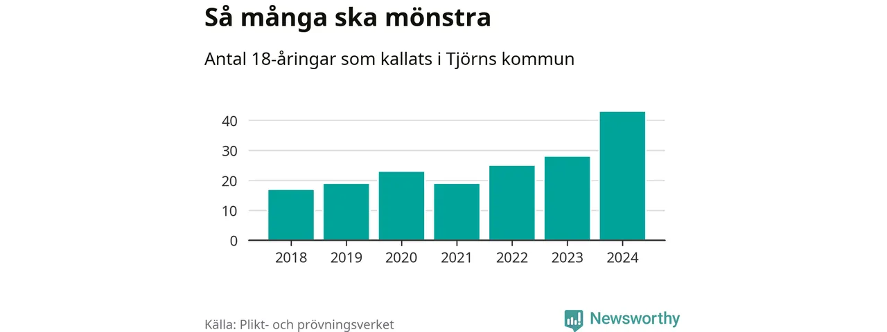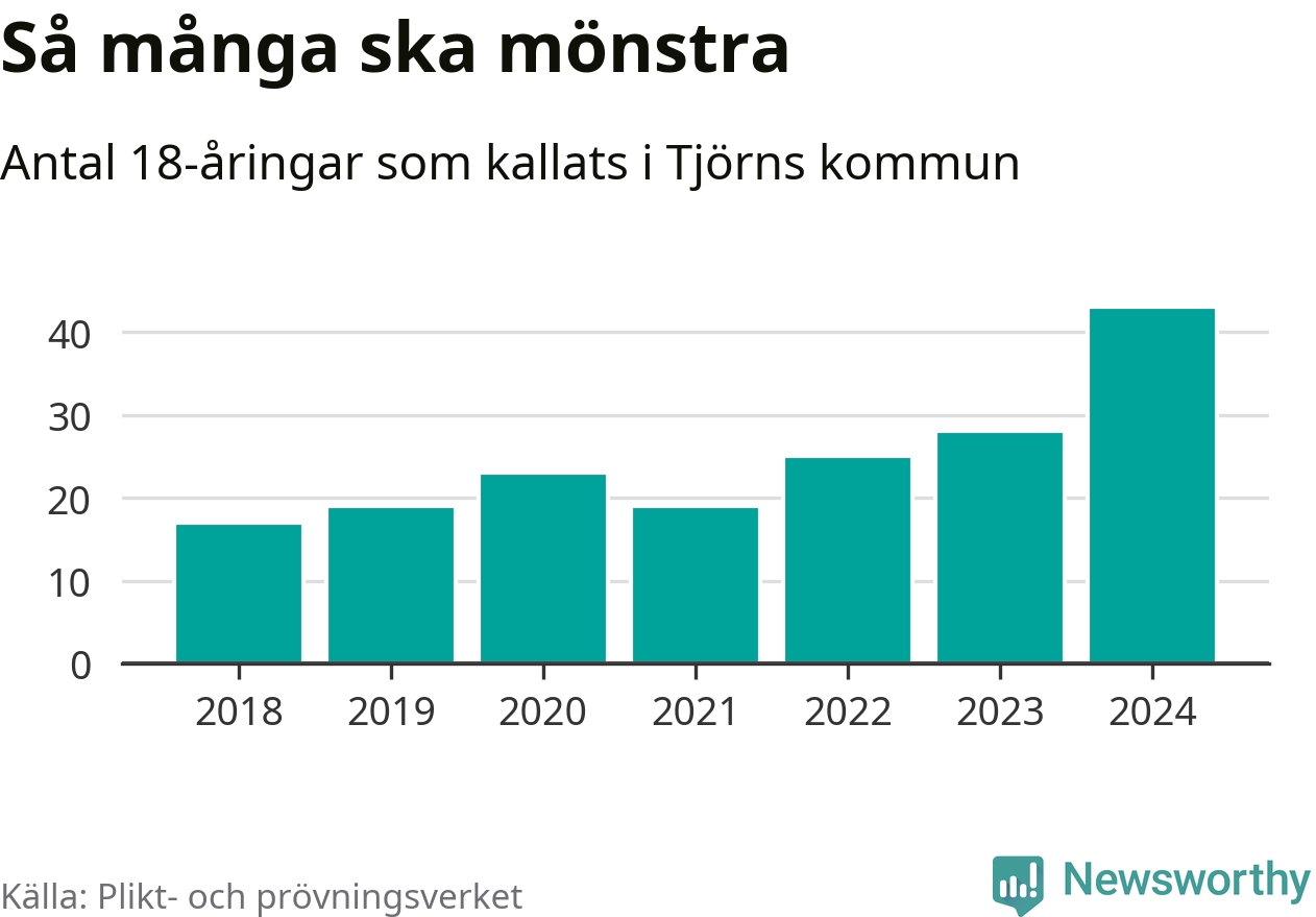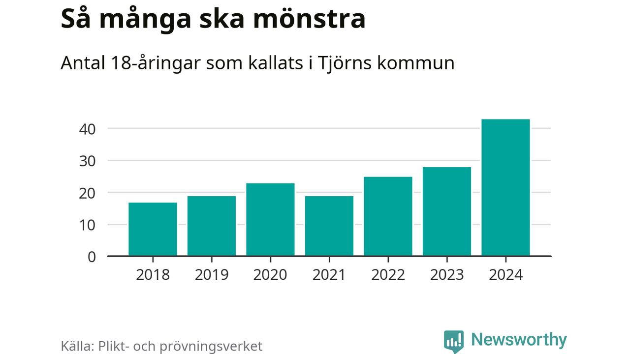 43 personer är det högsta antalet kallade på Tjörn sedan 2018, som är första året med statistik på kommunnivå (värnplikten återinfördes 2017), och 15 mönstrande mer än 2023. 2018 kallades som jämförelse 17 artonåringar från Tjörn till mönstring. Det motsvarade ungefär 10 procent av årskullen född år 2000. Totalt från Västra Götalands län kallas 4 562 personer födda 2006 i år.