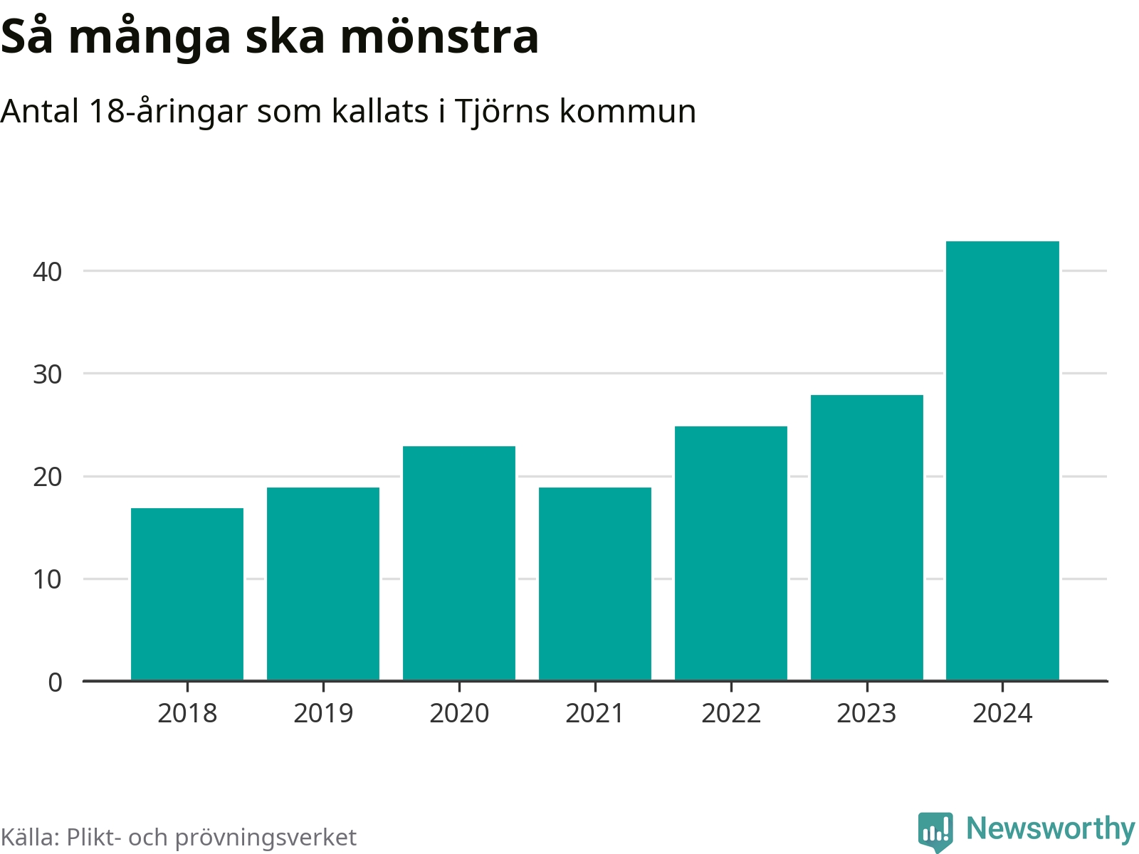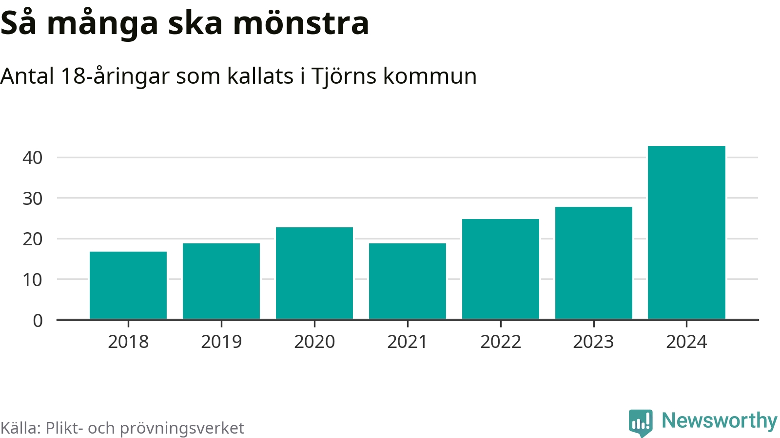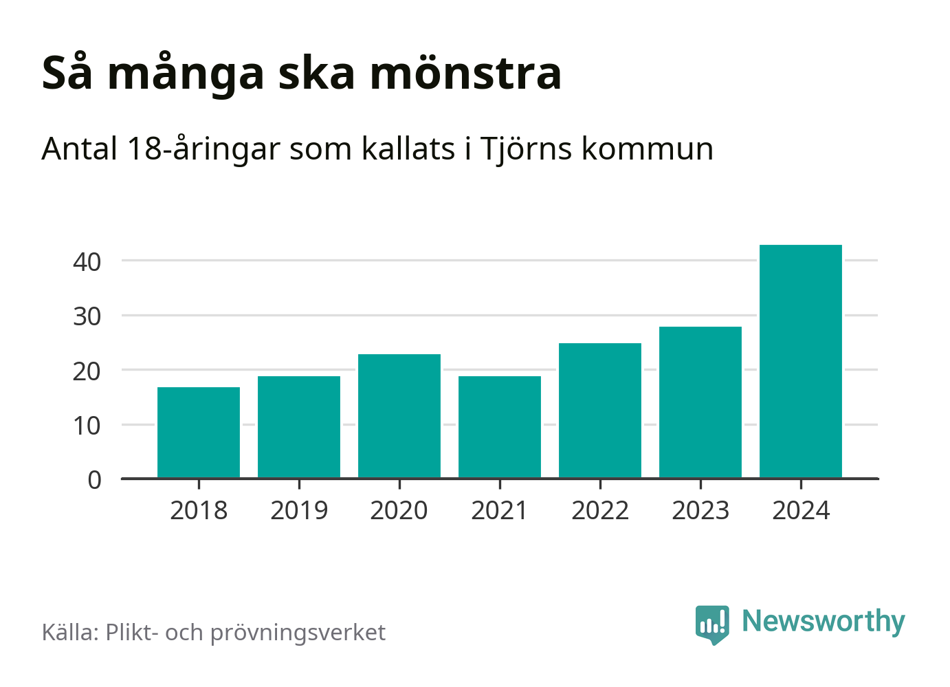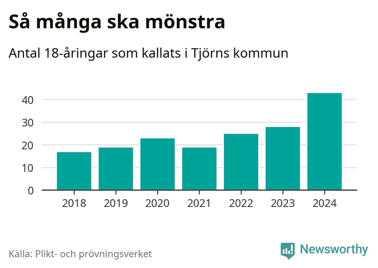 43 personer är det högsta antalet kallade på Tjörn sedan 2018, som är första året med statistik på kommunnivå (värnplikten återinfördes 2017), och 15 mönstrande mer än 2023. 2018 kallades som jämförelse 17 artonåringar från Tjörn till mönstring. Det motsvarade ungefär 10 procent av årskullen född år 2000. Totalt från Västra Götalands län kallas 4 562 personer födda 2006 i år.
