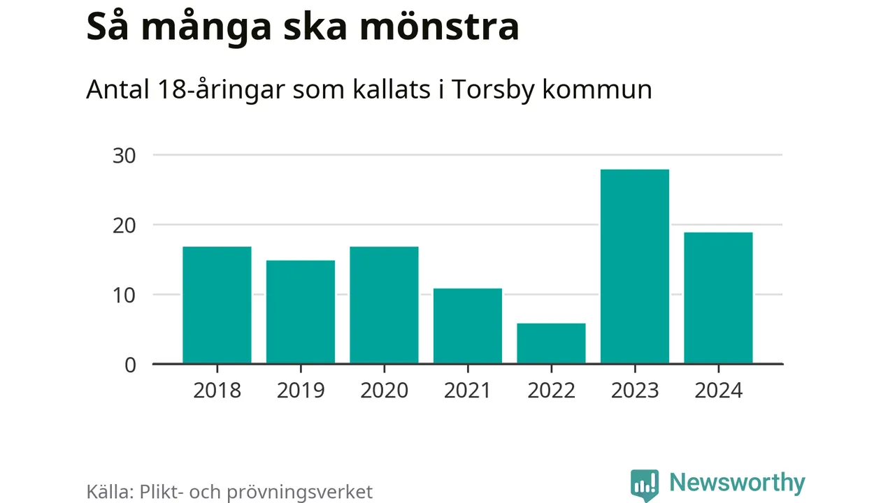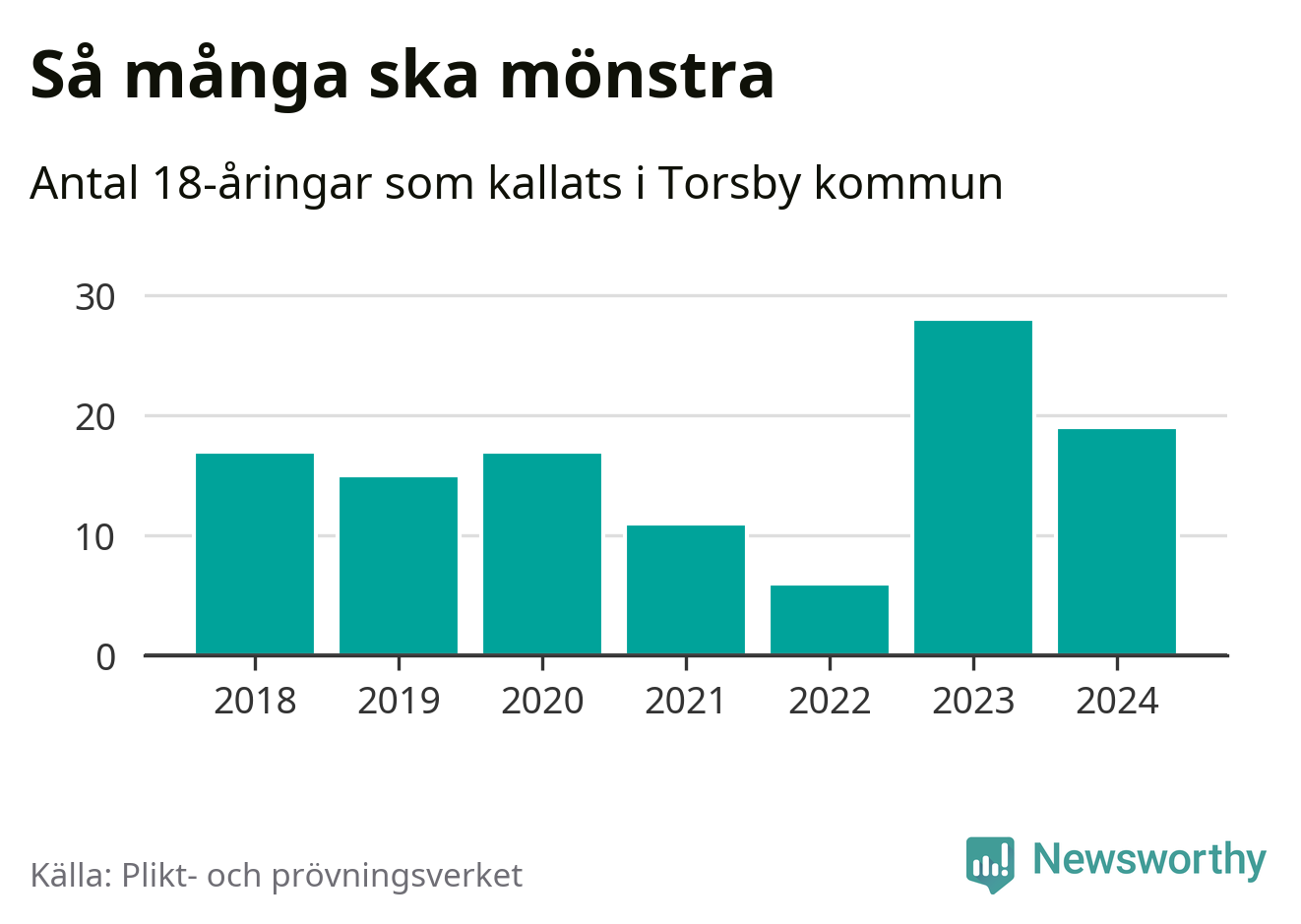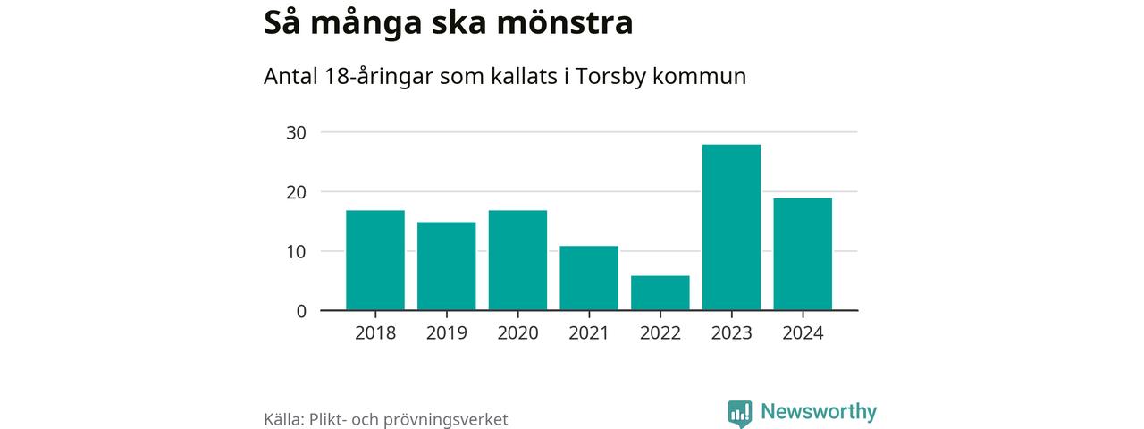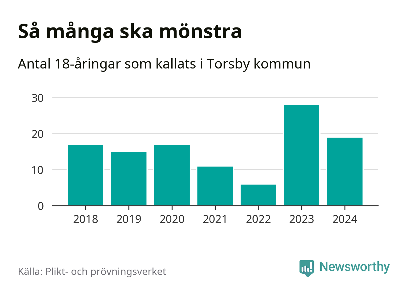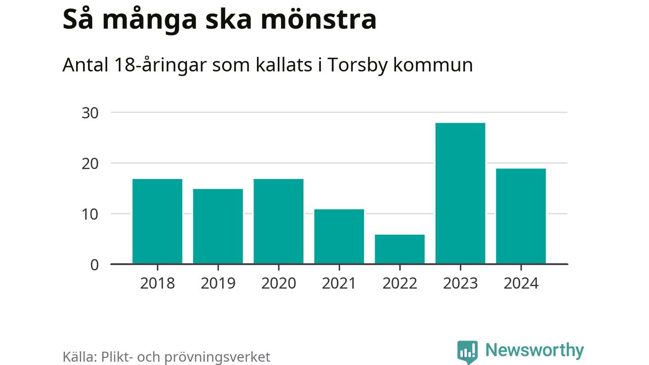 19 personer är nio färre än 2023, men sett som andel av respektive åldersgrupp är skillnaden liten. 2018 kallades som jämförelse 17 artonåringar från Torsby till mönstring. Det motsvarade ungefär 13 procent av årskullen född år 2000. Totalt från Värmlands län kallas 705 personer födda 2006 i år.