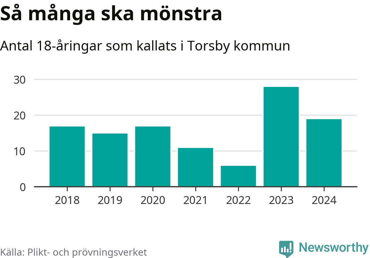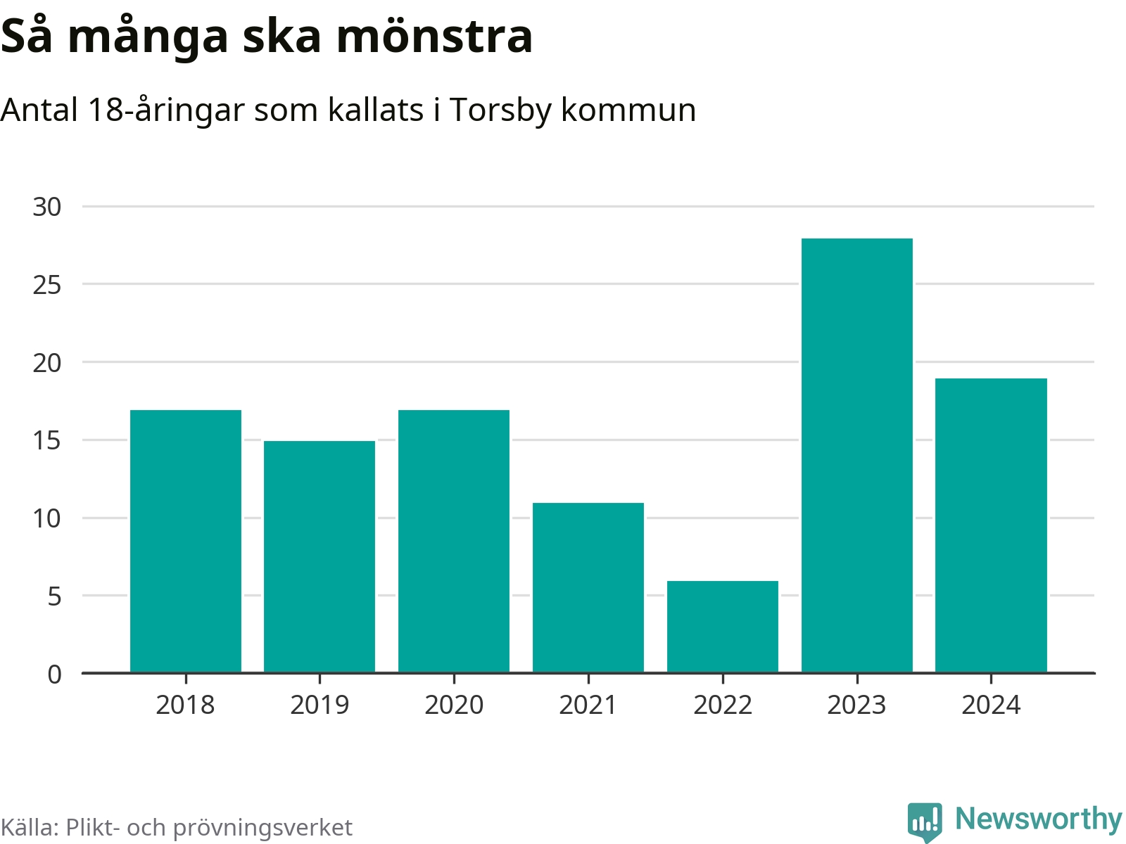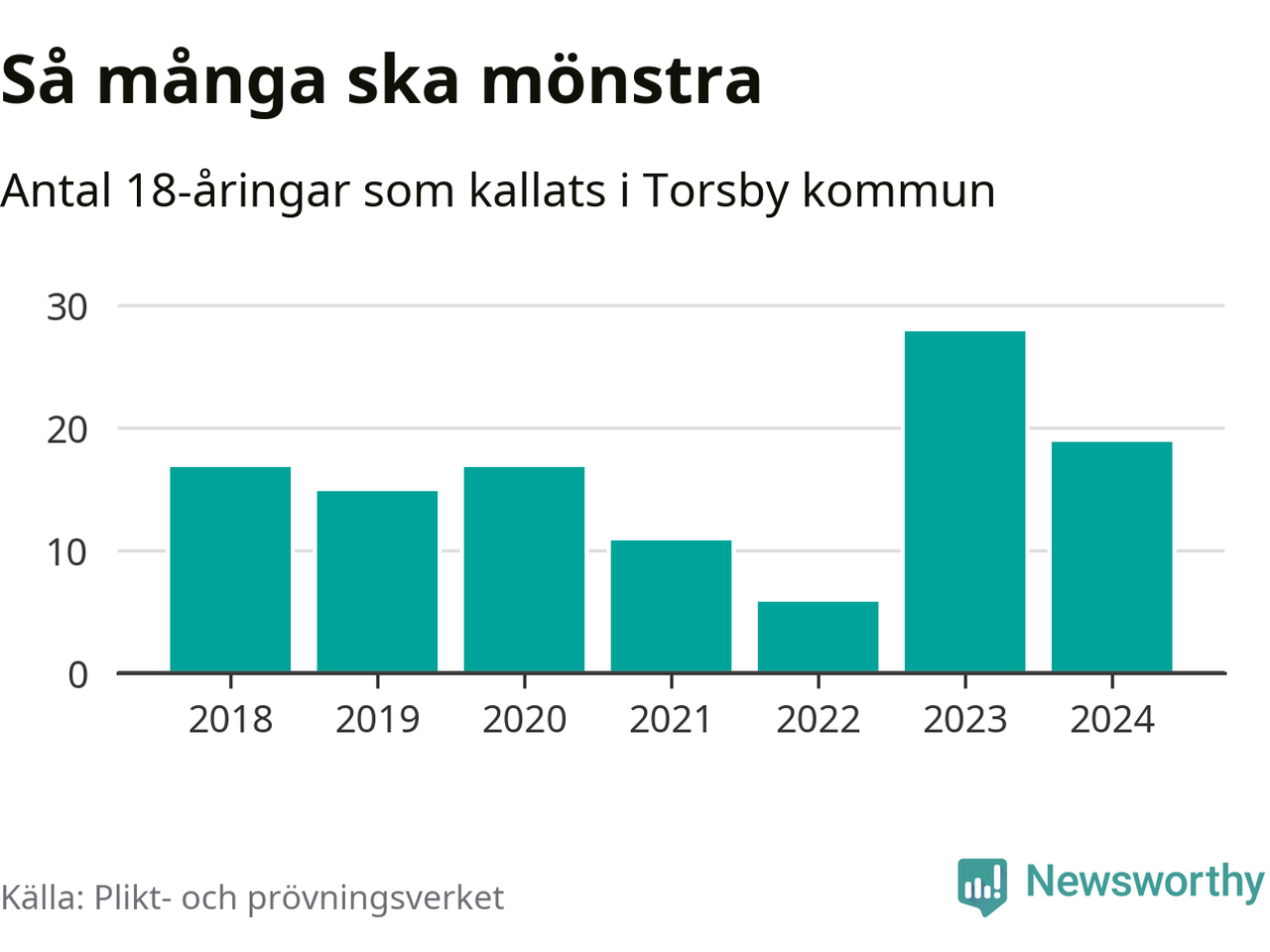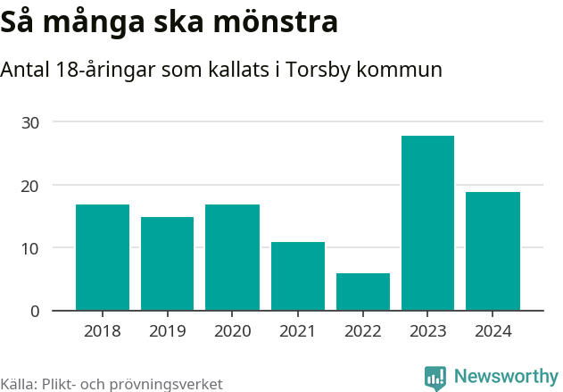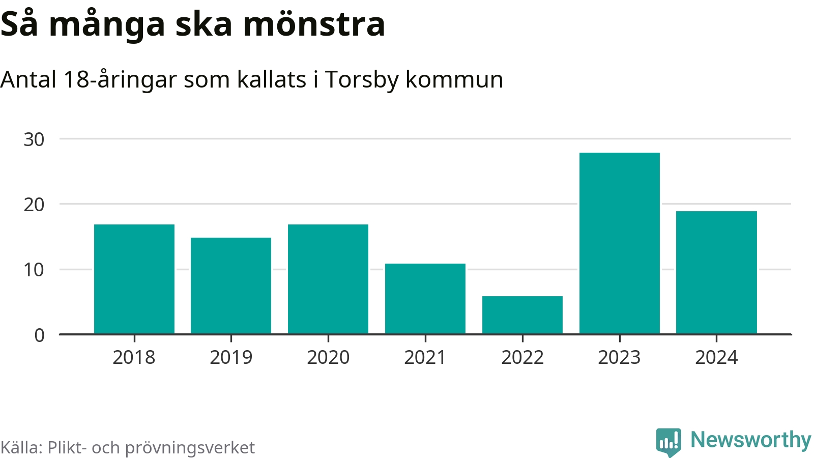 19 personer är nio färre än 2023, men sett som andel av respektive åldersgrupp är skillnaden liten. 2018 kallades som jämförelse 17 artonåringar från Torsby till mönstring. Det motsvarade ungefär 13 procent av årskullen född år 2000. Totalt från Värmlands län kallas 705 personer födda 2006 i år.