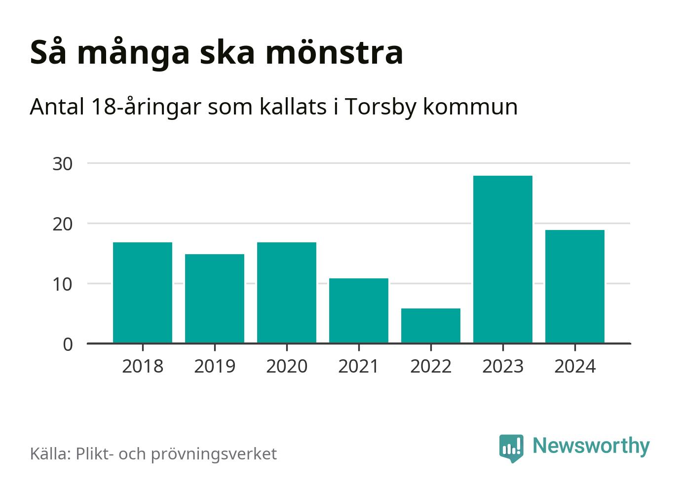 Nu kallas 27 900 svenskar födda 2006 till mönstring. Och 19 av dem kommer från Torsby, enligt ny statistik från Plikt- och prövningsverket. Det innebär att var femte invånare i åldersgruppen i kommunen kallas till mönstring. Det är ungefär lika stor andel som i Värmland totalt. I riket som helhet kallas nästan var fjärde person i årskullen.